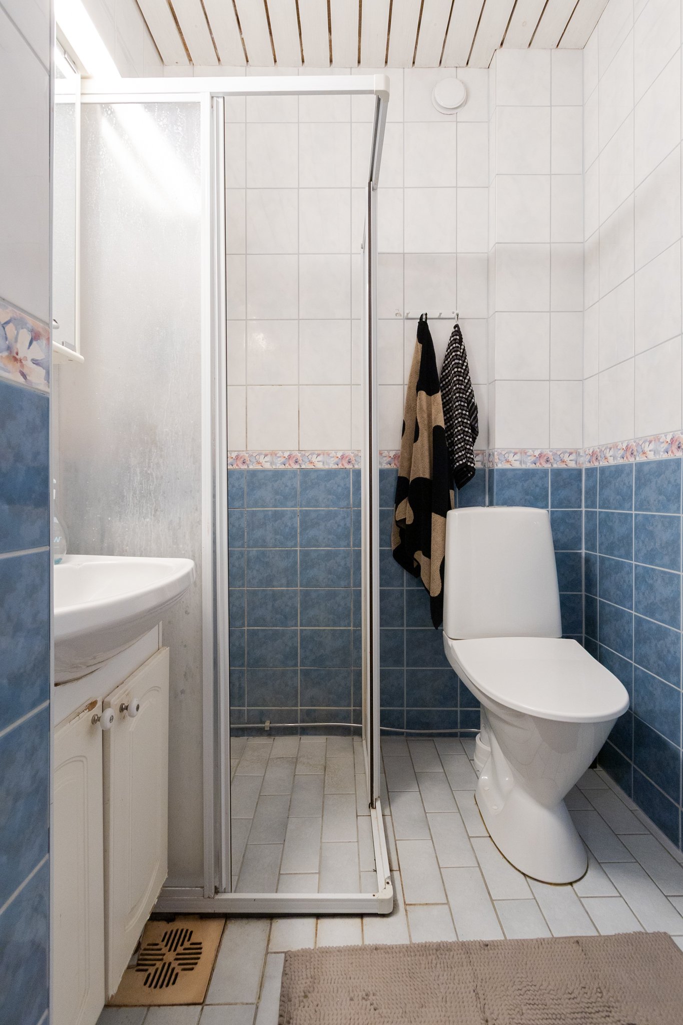 Varusteet: WC-istuin, suihku, bidee-suihku, allaskaappi ja peilikaappi
