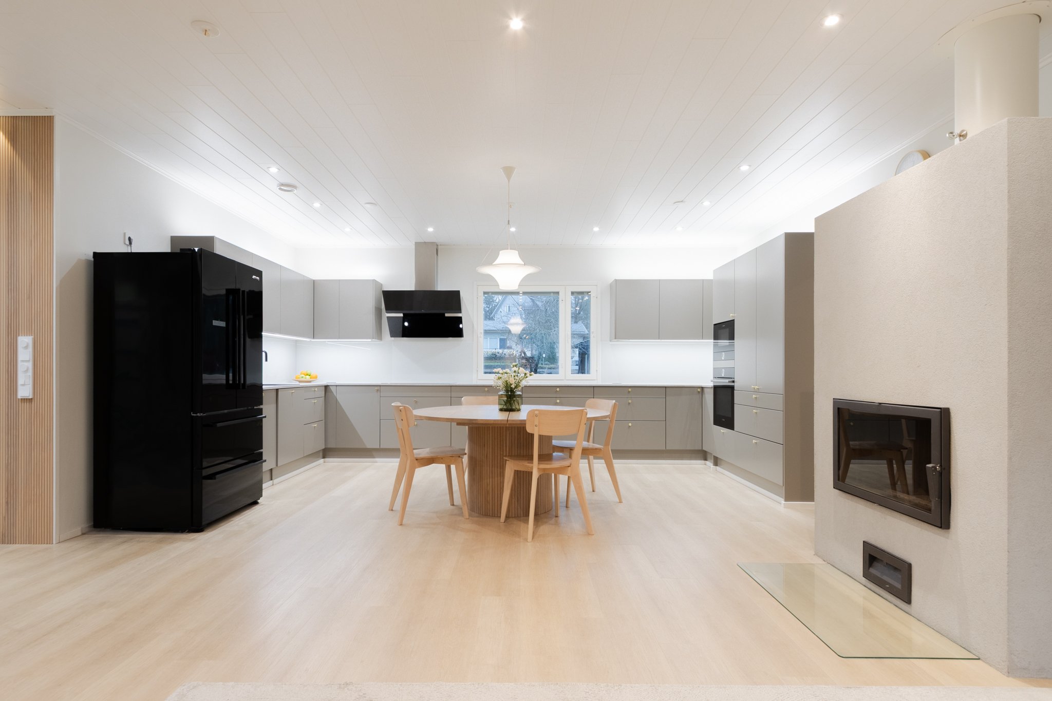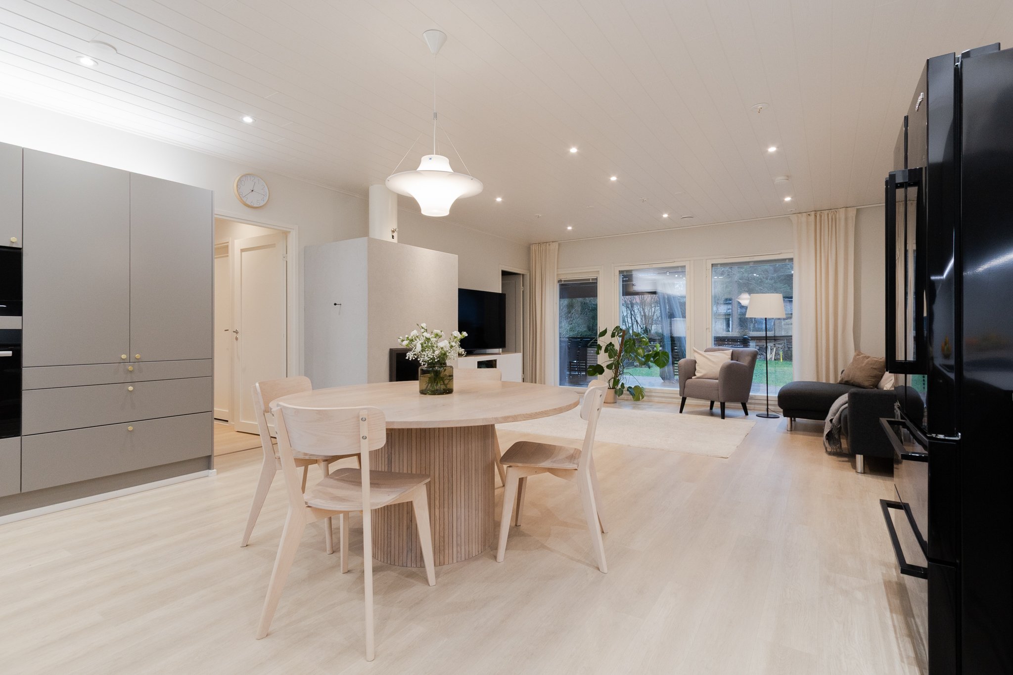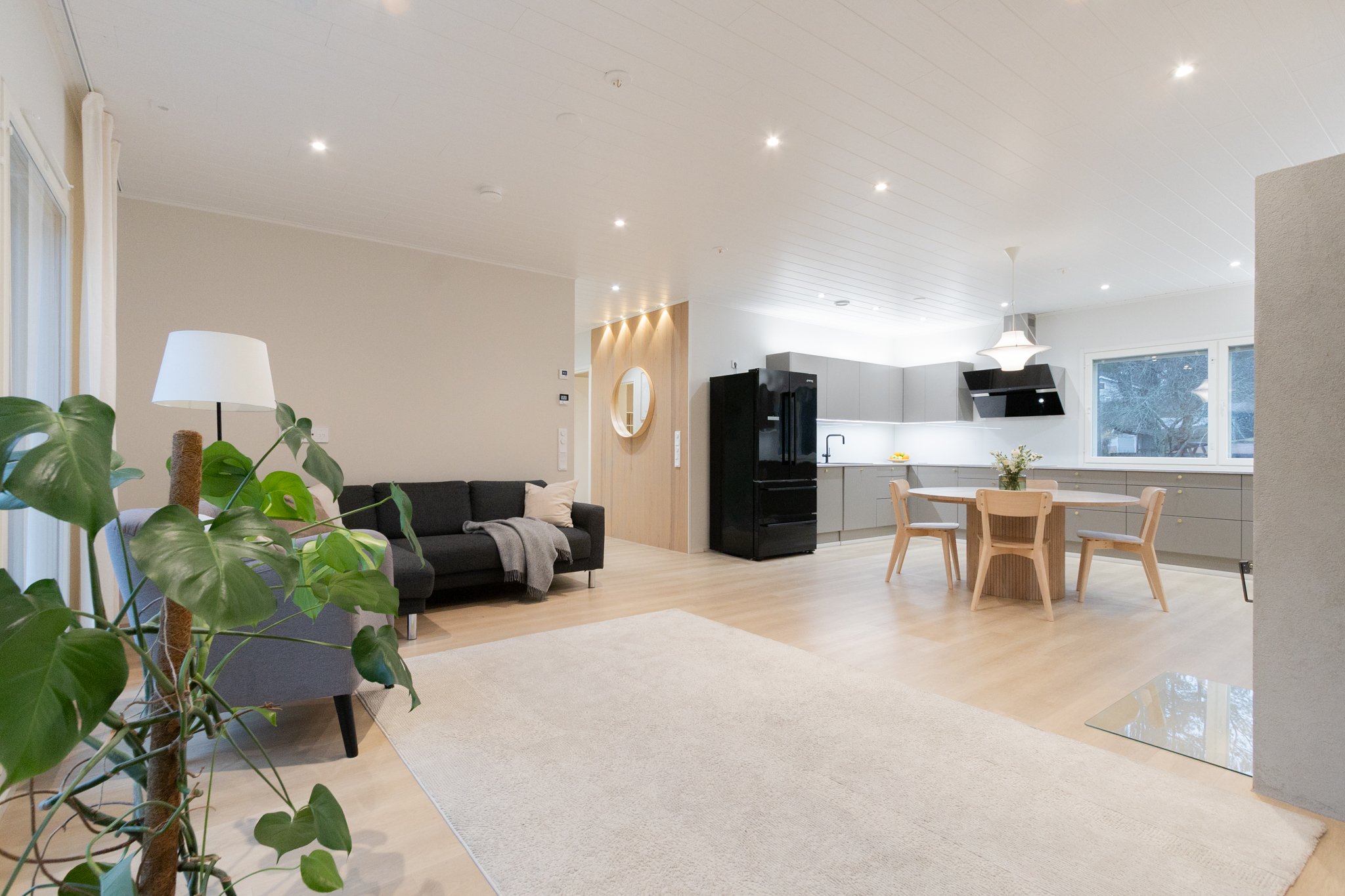 Avara pohjaratkaisu ja suuret ikkunapinnat tuovat runsaasti luonnonvaloa sisätiloihin ja luovat ilmavan tunnelman. Olohuoneen ja keittiön toimiva kokonaisuus kutsuu viettämään yhteisiä hetkiä perheen ja ystävien kanssa. Keittiö on varusteltu nykyaikaisilla kodinkoneilla, sekä runsaalla kaappitilalla, tarjoten hyvät puitteet arjen ruoanlaittoon.