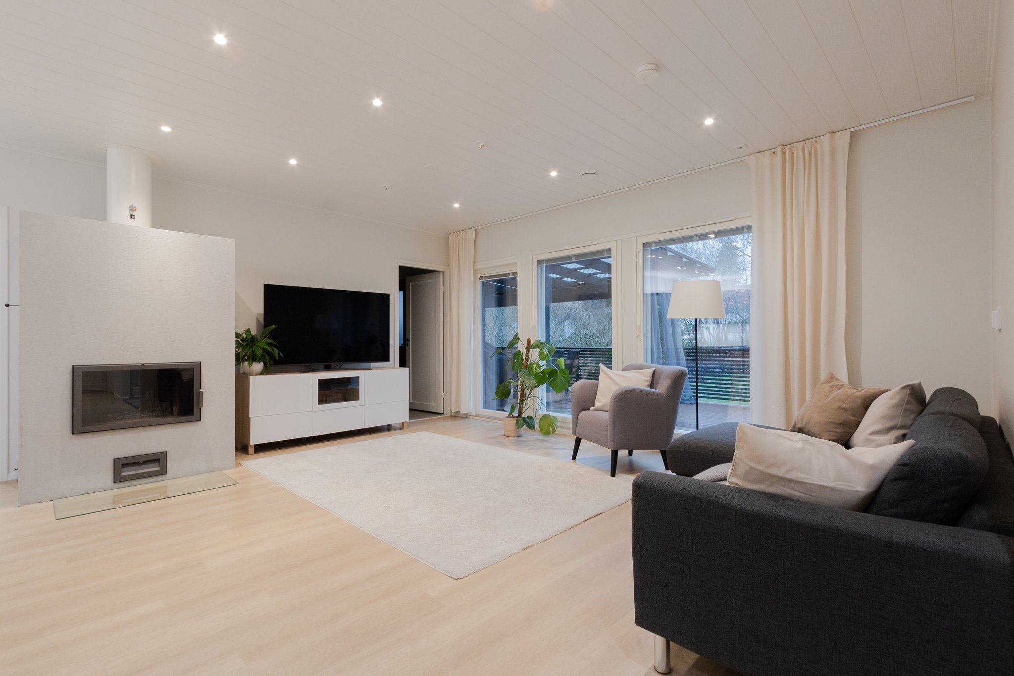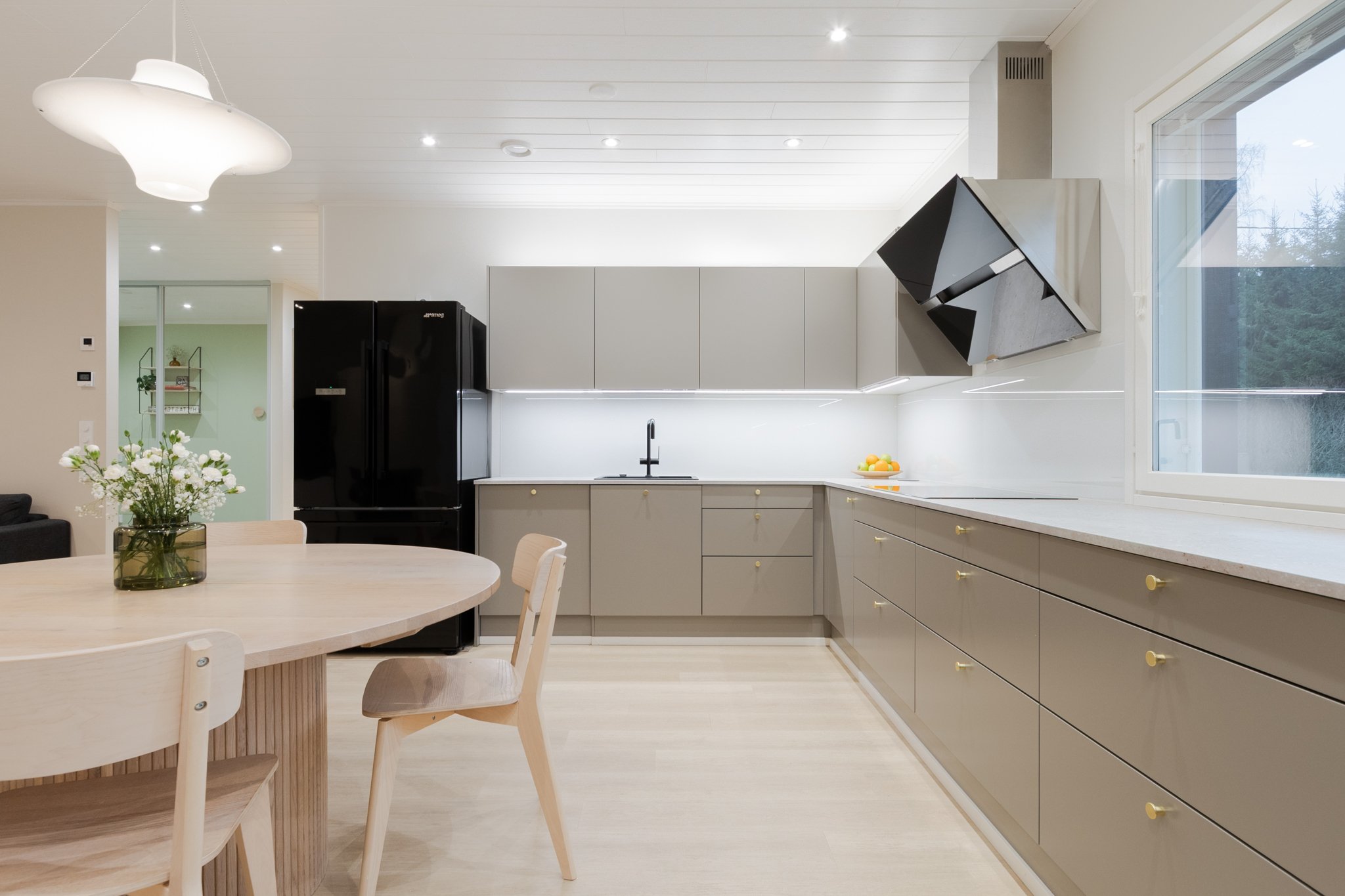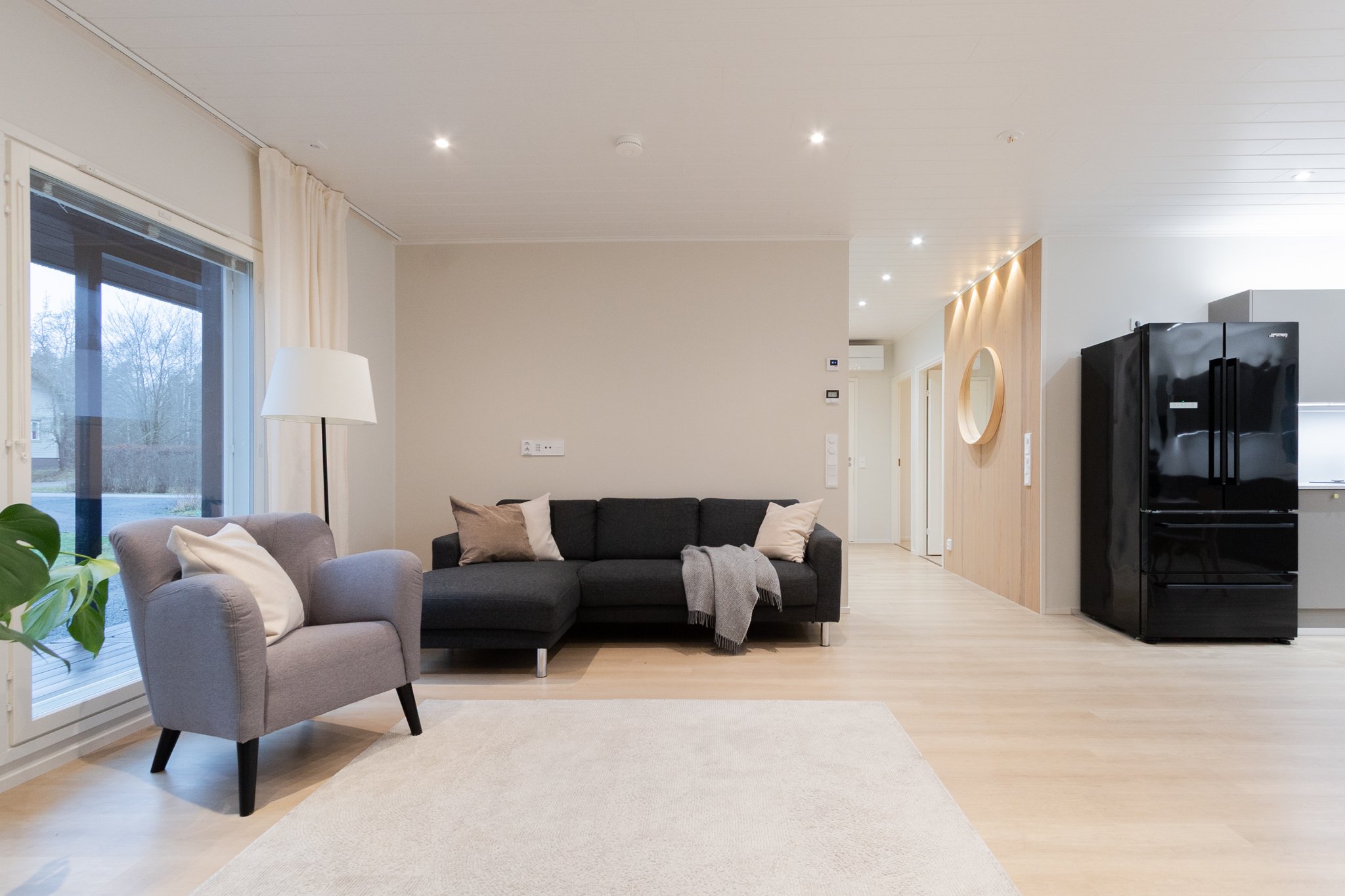 Avara pohjaratkaisu ja suuret ikkunapinnat tuovat runsaasti luonnonvaloa sisätiloihin ja luovat ilmavan tunnelman. Olohuoneen ja keittiön toimiva kokonaisuus kutsuu viettämään yhteisiä hetkiä perheen ja ystävien kanssa. Keittiö on varusteltu nykyaikaisilla kodinkoneilla, sekä runsaalla kaappitilalla, tarjoten hyvät puitteet arjen ruoanlaittoon.