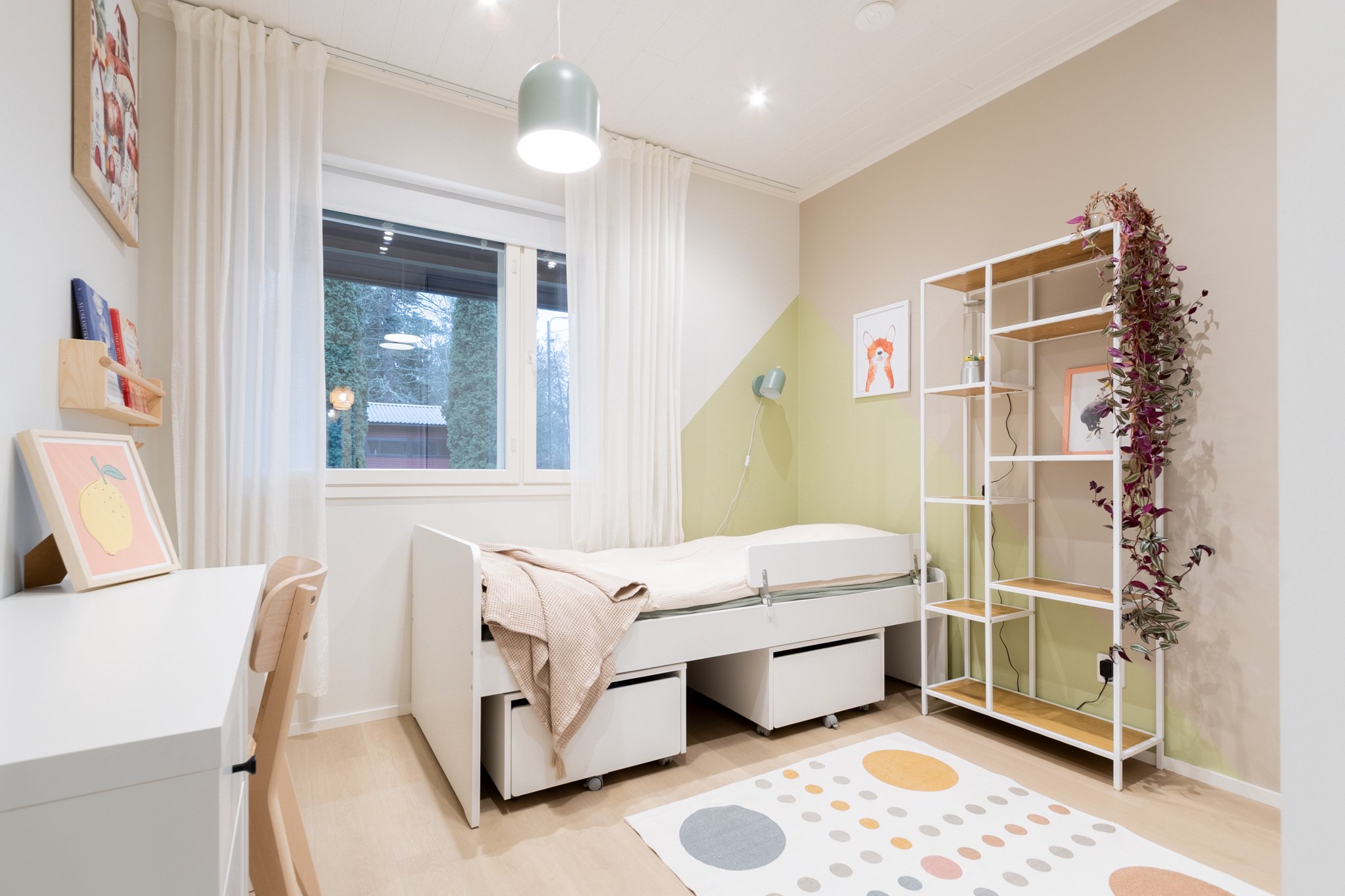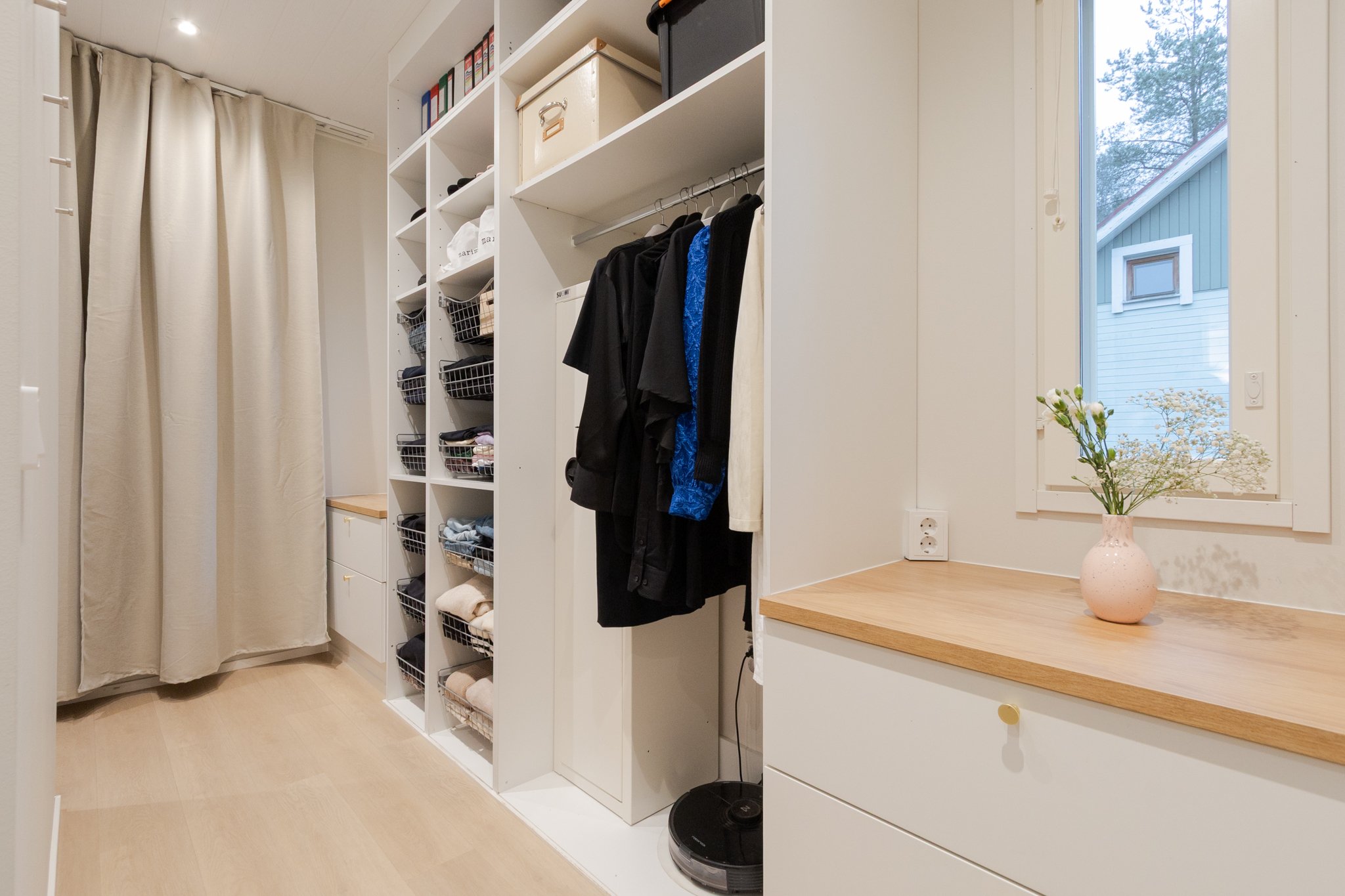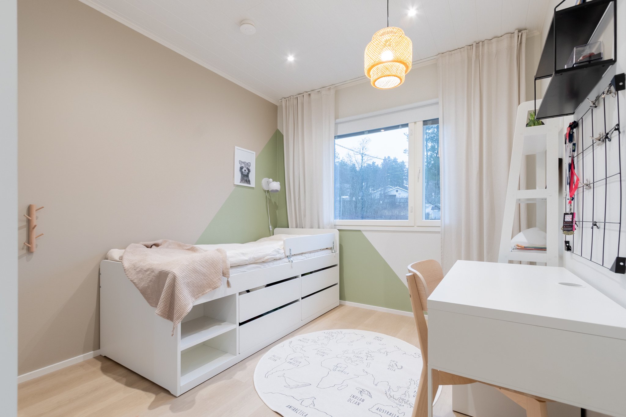 Talossa on neljä tilavaa makuuhuonetta, jotka soveltuvat mainiosti perheen tarpeisiin tai esimerkiksi työ- ja vierashuoneiksi. Kylpyhuoneessa ja kodinhoitohuoneessa on miellyttävä lattialämmitys, ja oma sauna kruunaa kokonaisuuden tarjoten rentouttavia hetkiä arjen keskellä. Käytännöllisestä kodinhoitohuoneesta on oma uloskäynti, joka helpottaa arkea.