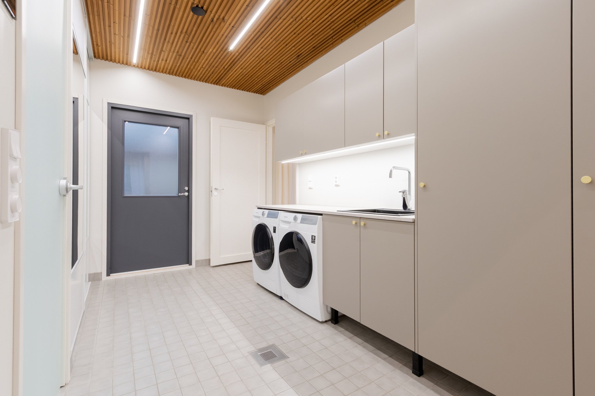Varusteet: Pesukoneliitäntä, lattialämmitys, pyykkikaapit ja pöytätaso
