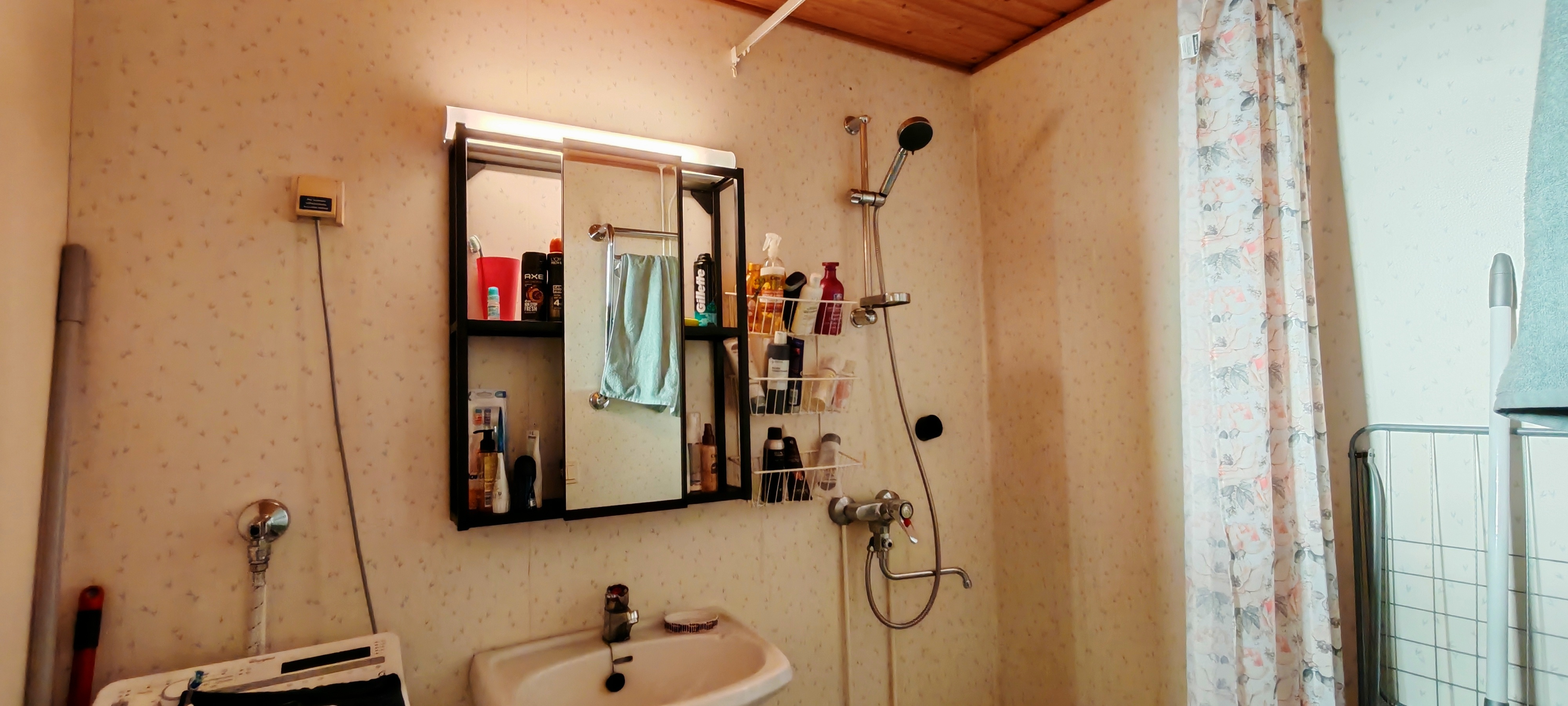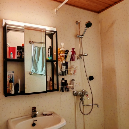 Varusteet: pesukoneliitäntä, suihku, peili, kylpyhuonekaapisto