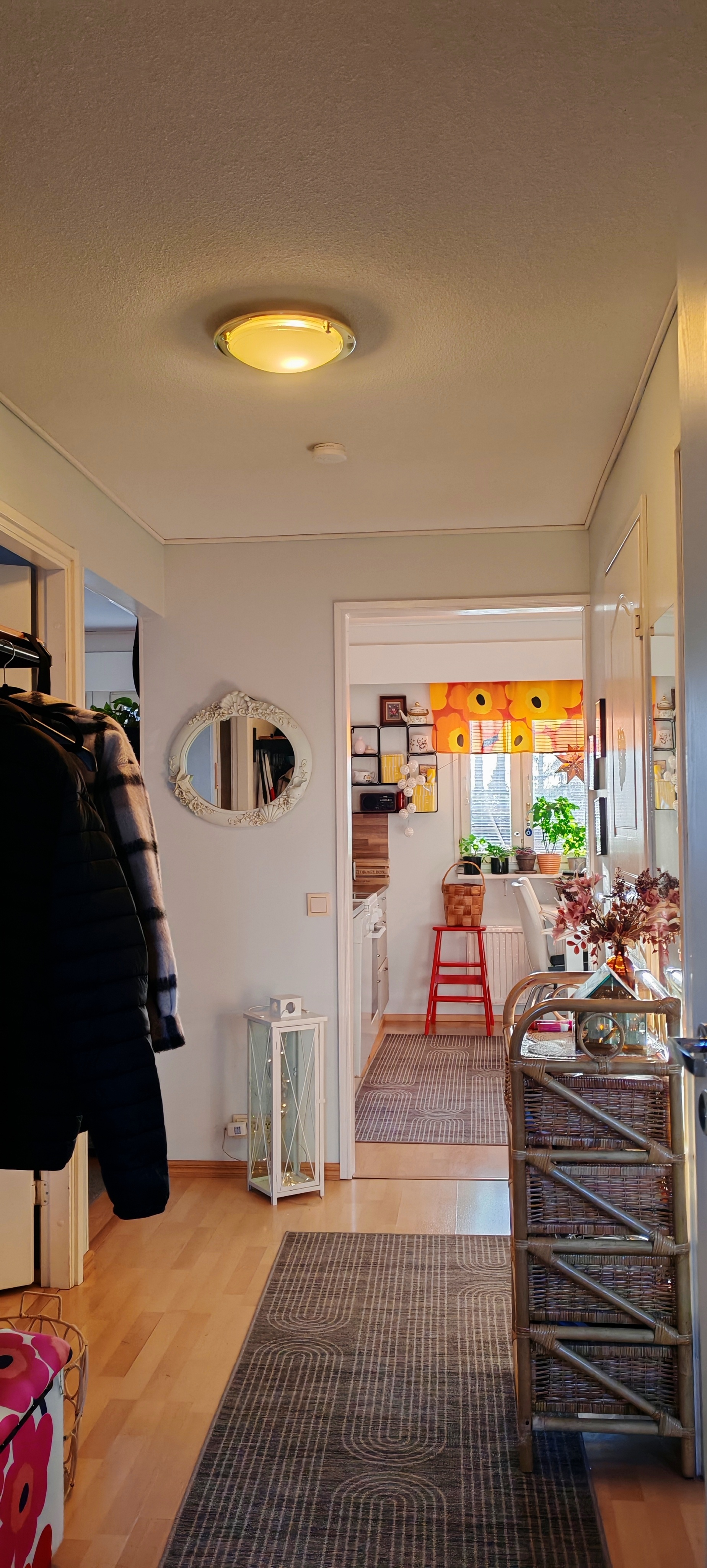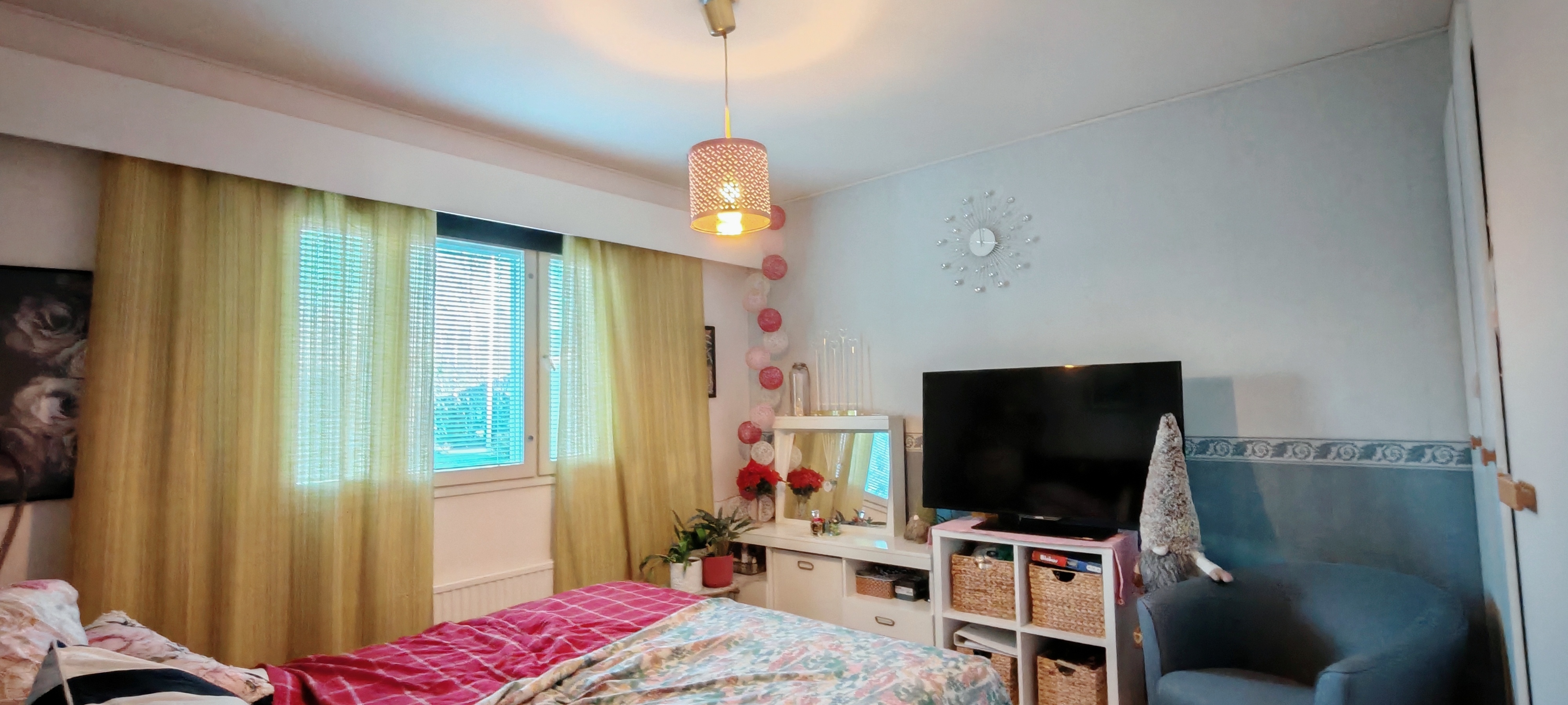 Olohuone, keittiö ja kaksi makuuhuonetta, vaatehuone.