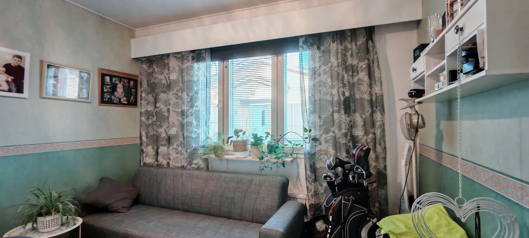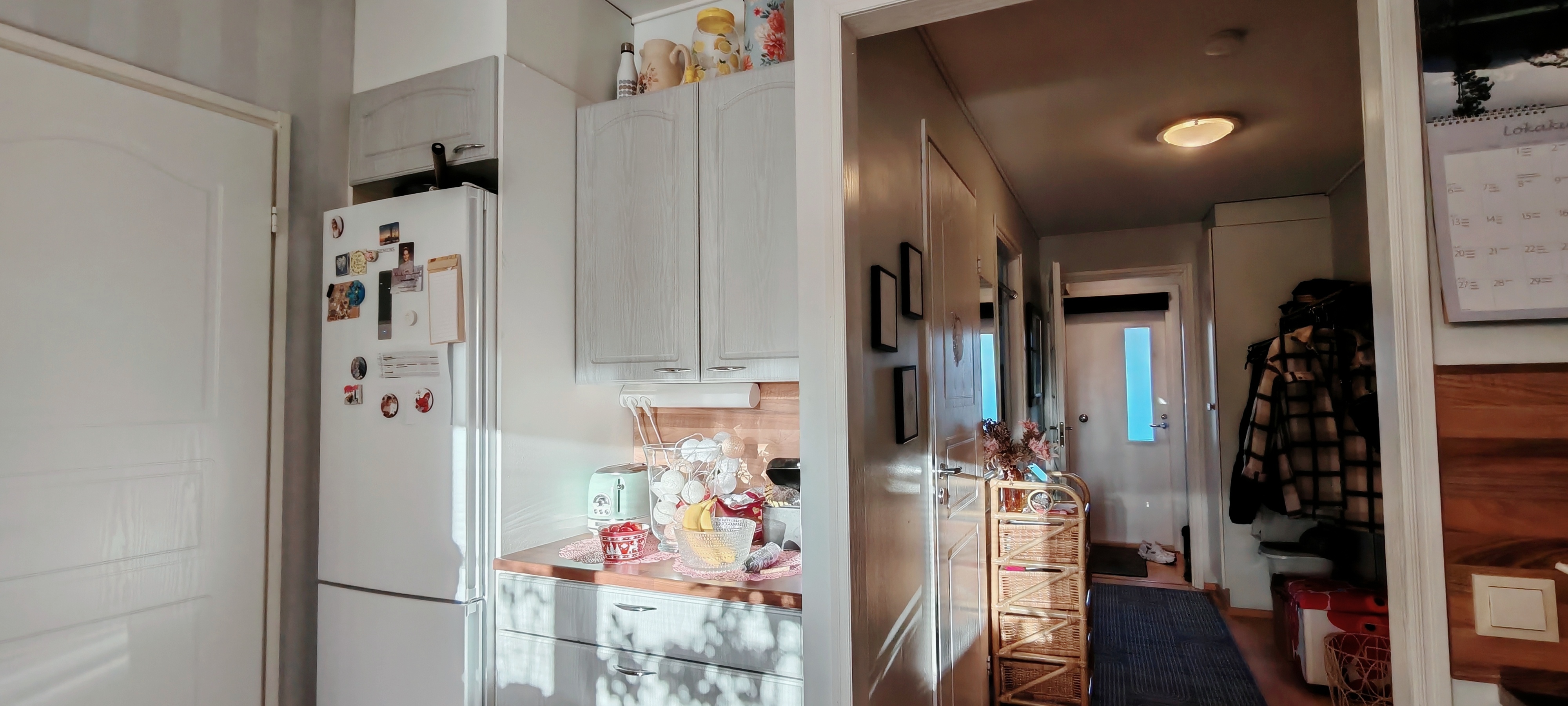 2mh: 4 korkeaa kaapistoa, tilava huone.