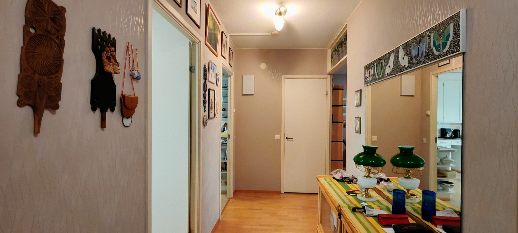 Eteinen tilava, kaksi kaapistoa. Lattia parkettia, seinät tapetoitu.