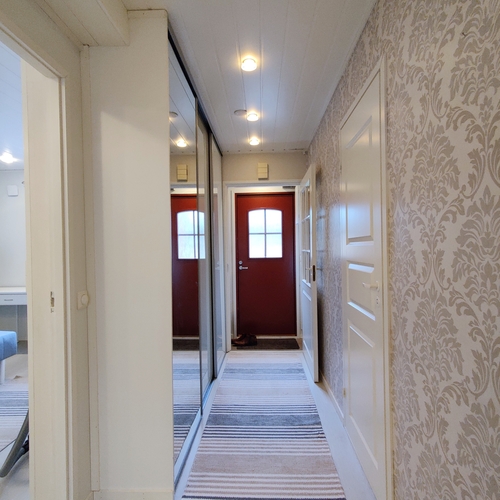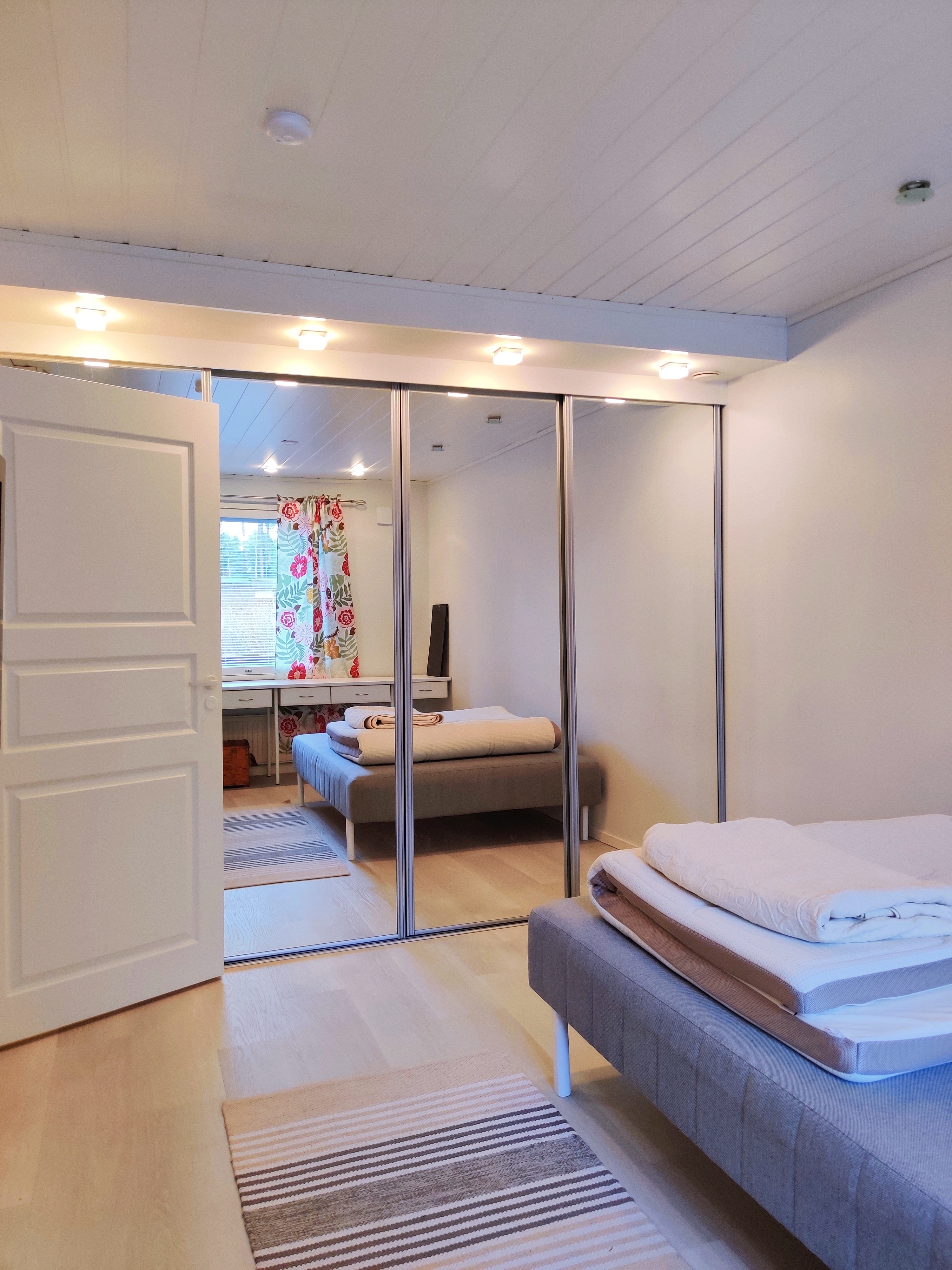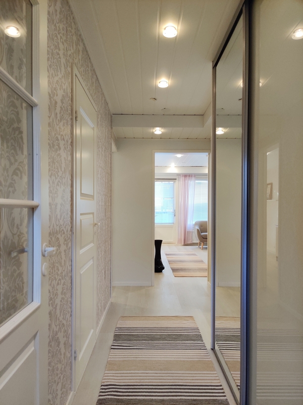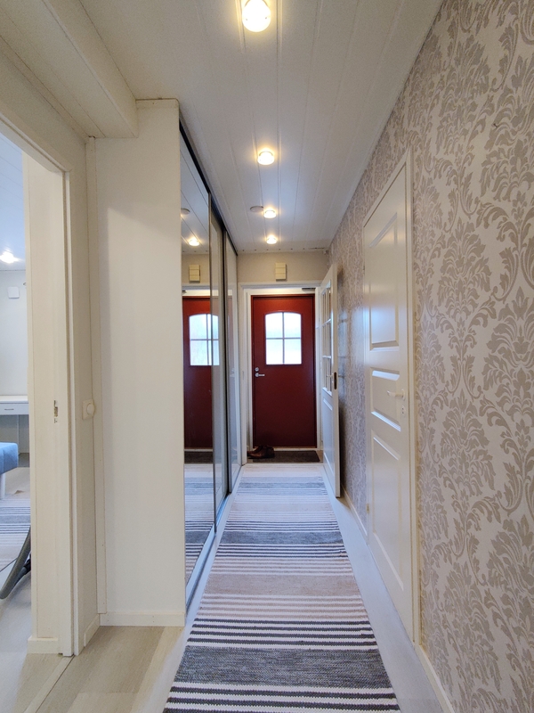 Lattia vinyylilankku, seinät maali/tapetti. Komerot peililiukuovilla.
