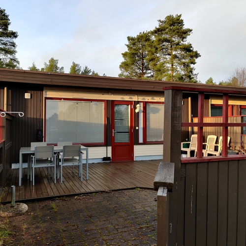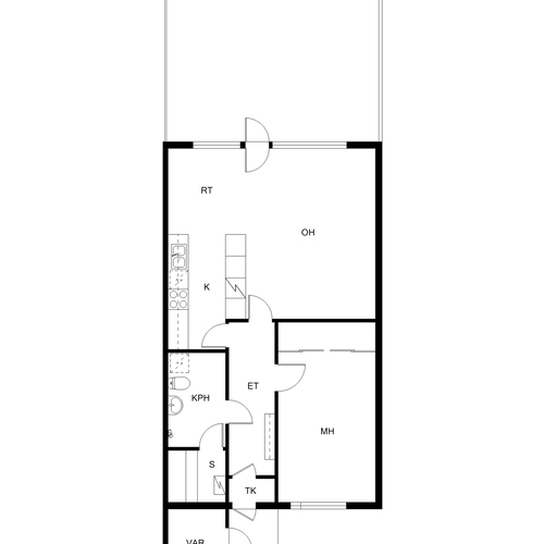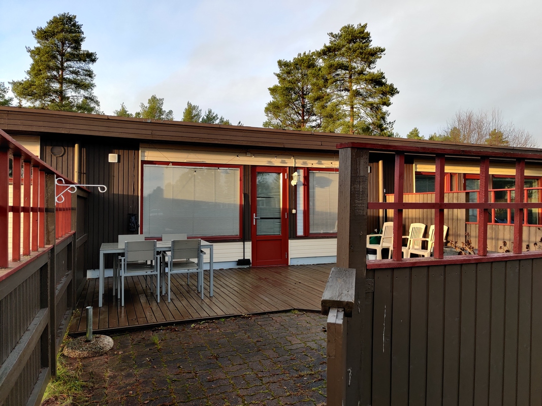 Olohuone/keittiö ja terassi/piha kaakon suuntaan. Makuuhuone luoteeseen.