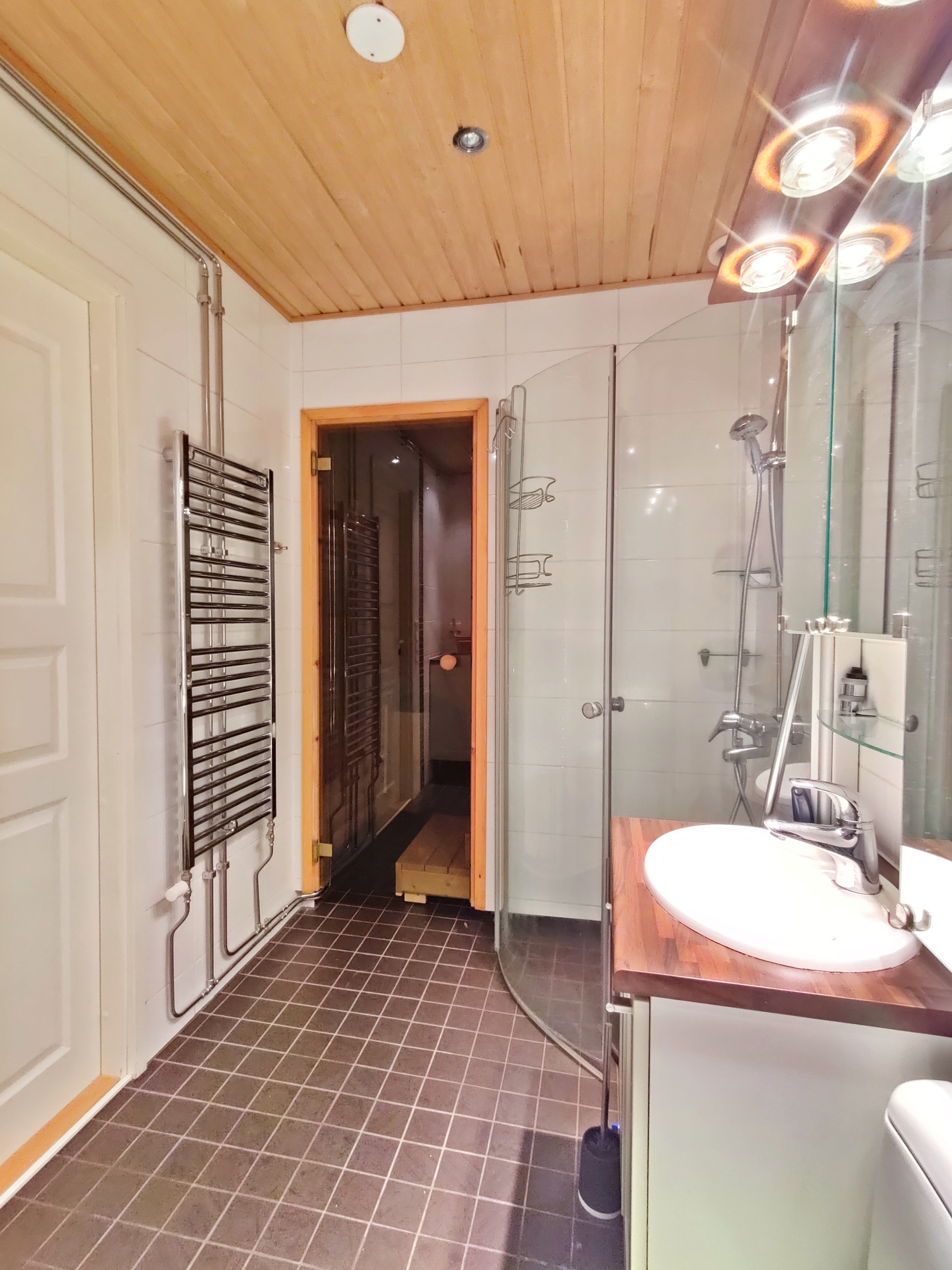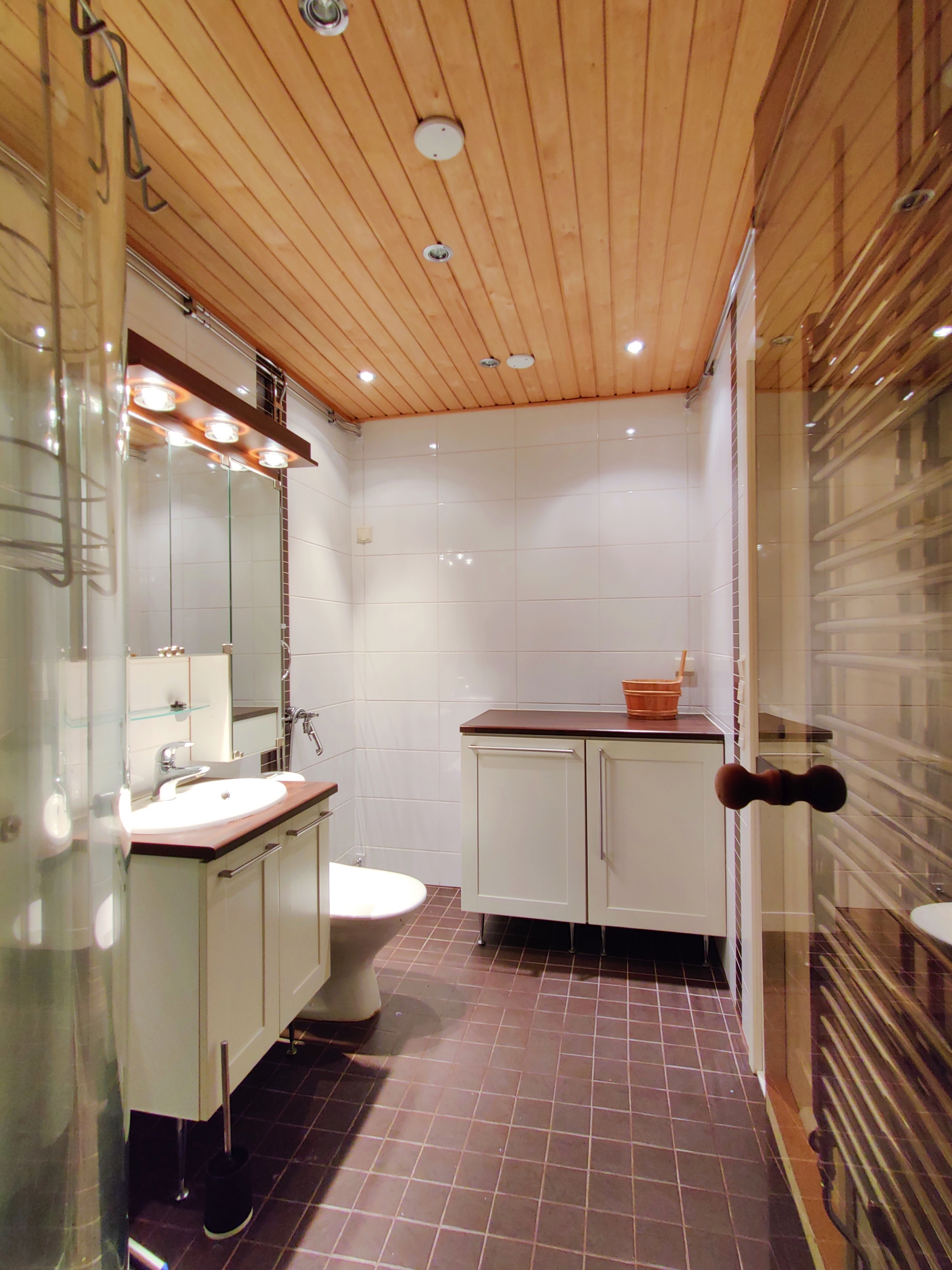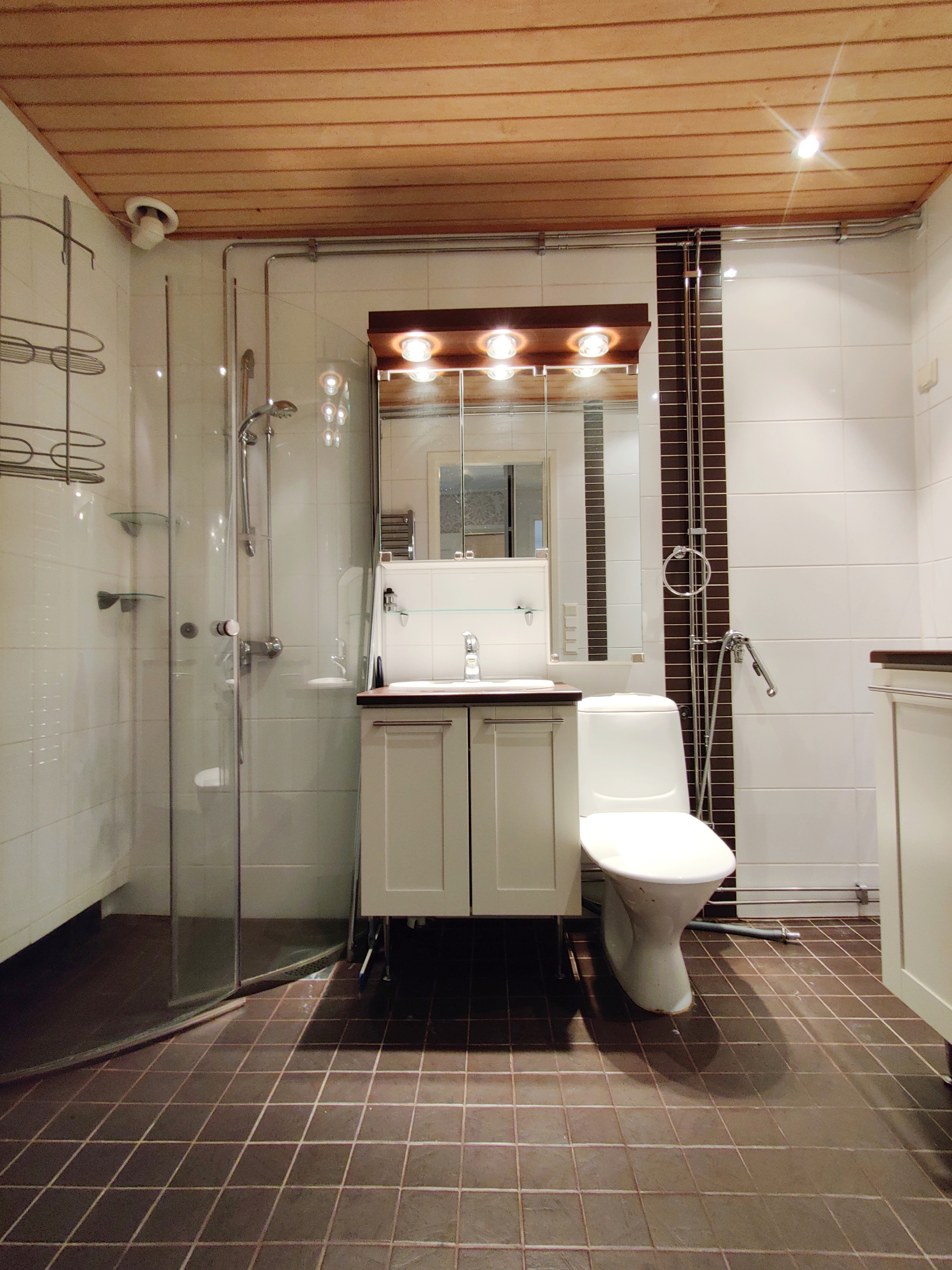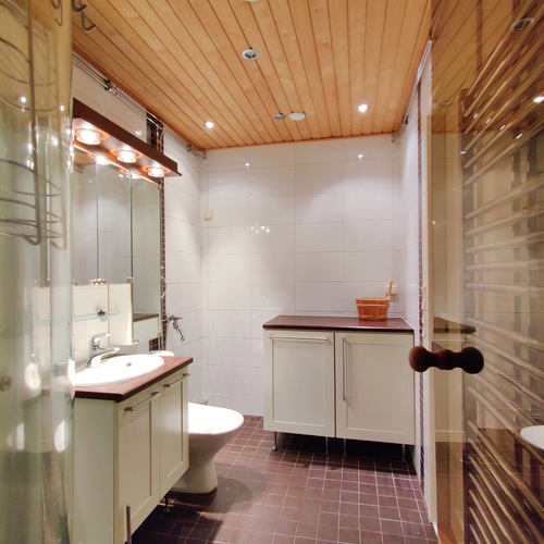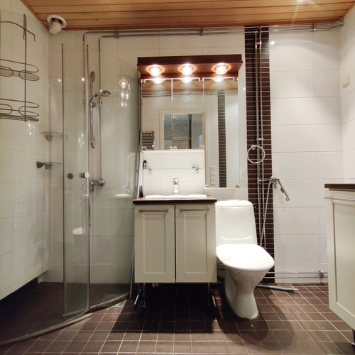 Varusteet: suihkuseinä, pesukoneliitäntä, lattialämmitys, wc-istuin, suihku, peili, kiinteät valaisimet, kylpyhuonekaapisto, asennettuja erikoisvarusteita