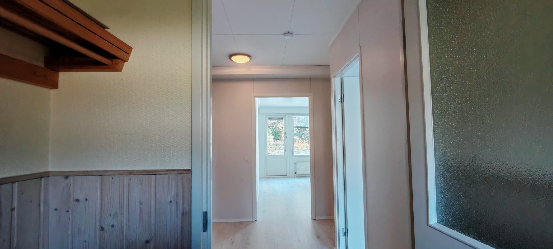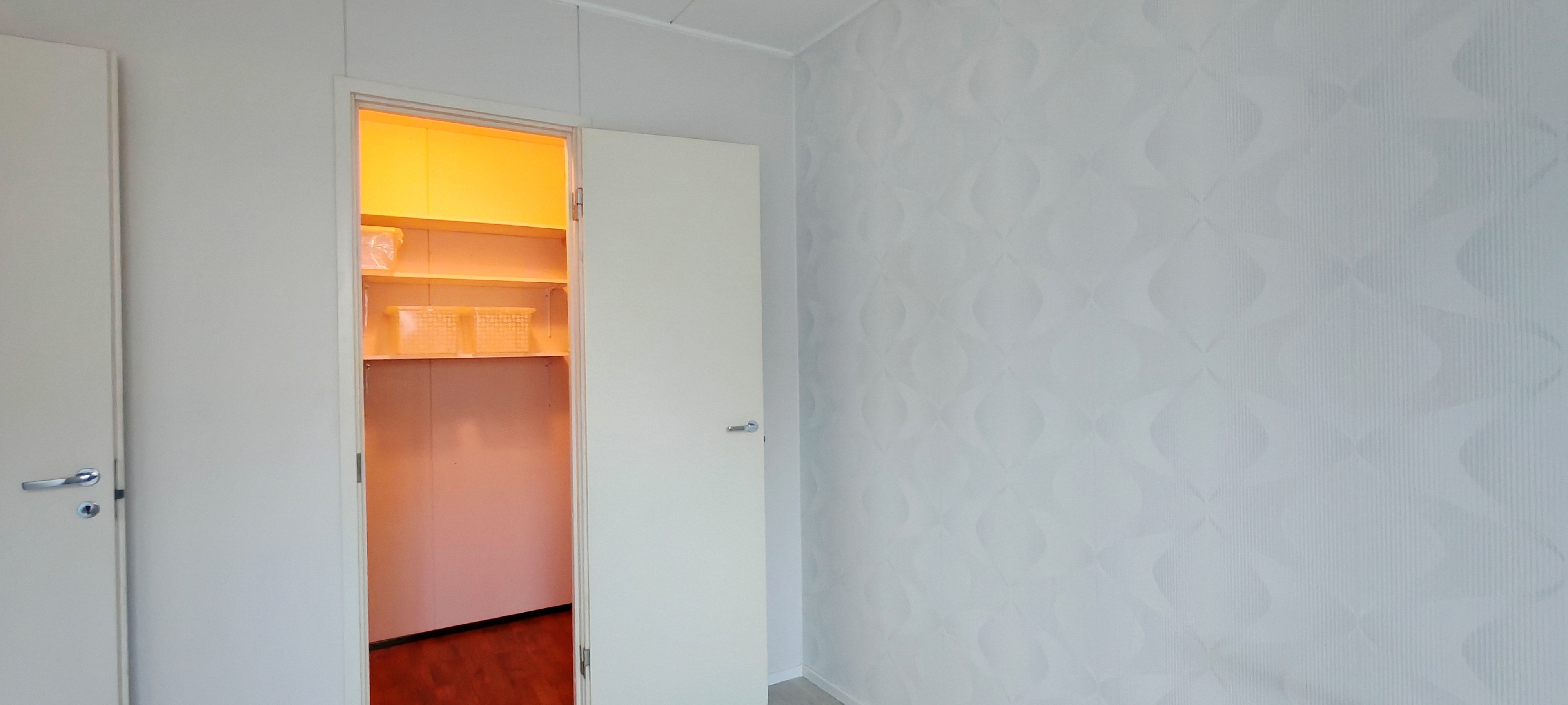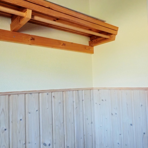 Tuulikaappi tilava, seinä puolipaneeli maalattu. Henkarihylly ja kenkäteline.