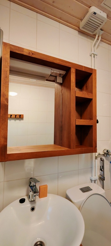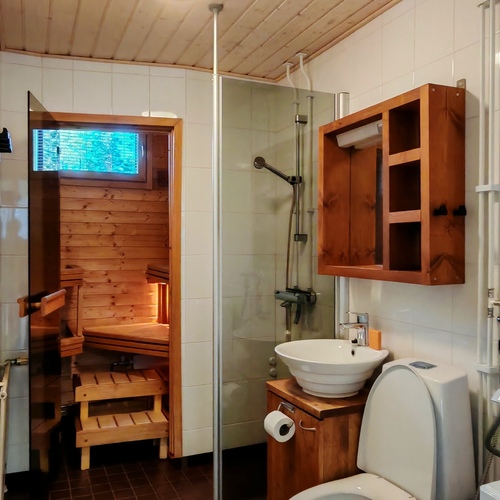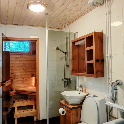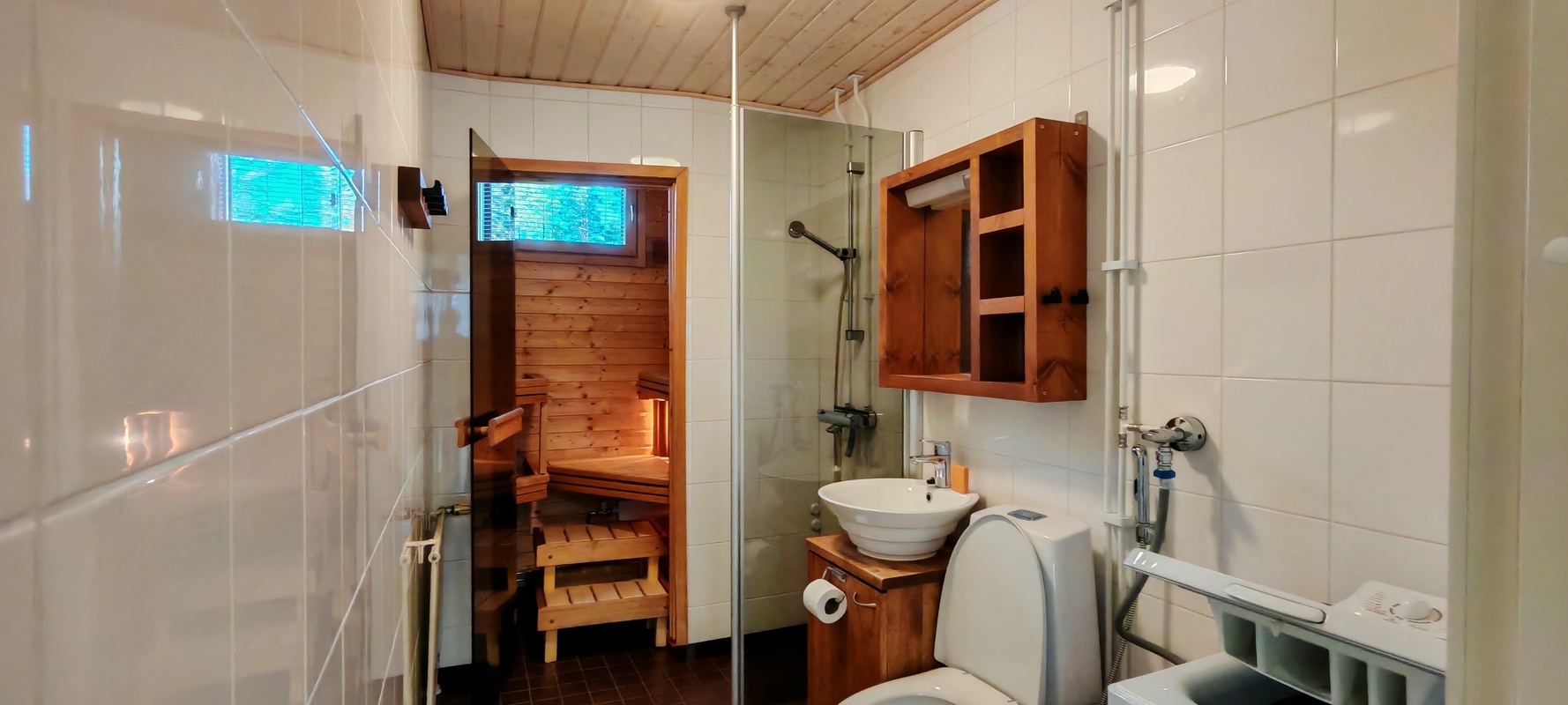 Varusteet: suihkuseinä, pesukone, pesukoneliitäntä, wc-istuin, suihku, kylpyhuonekaapisto