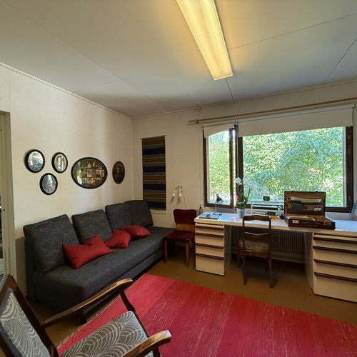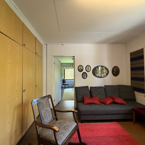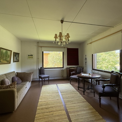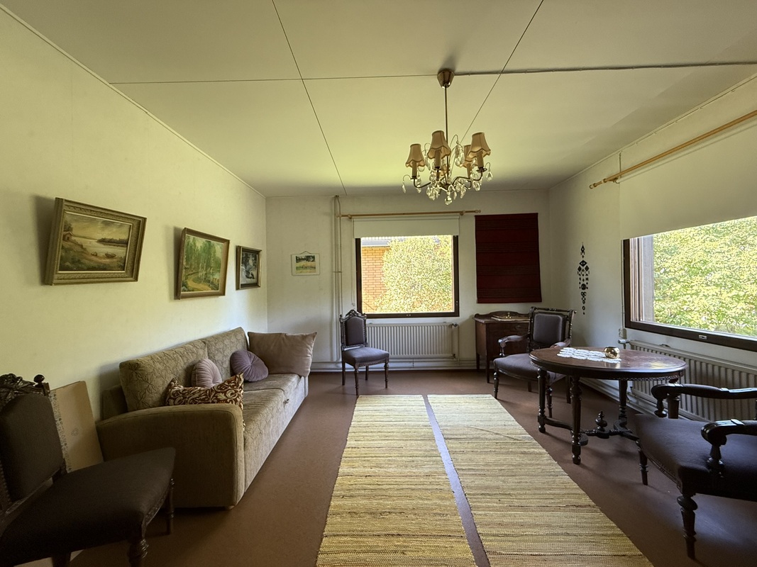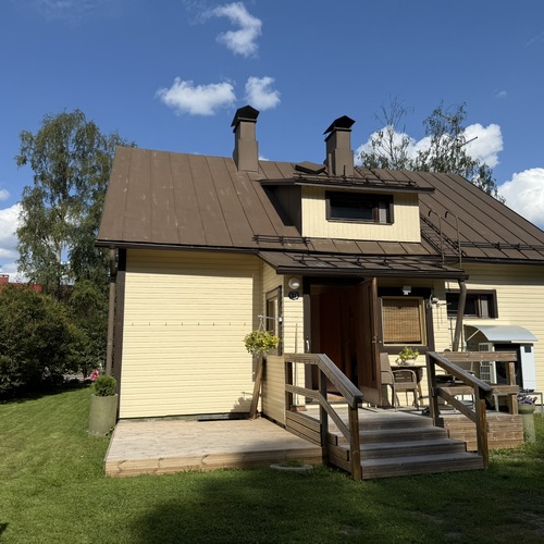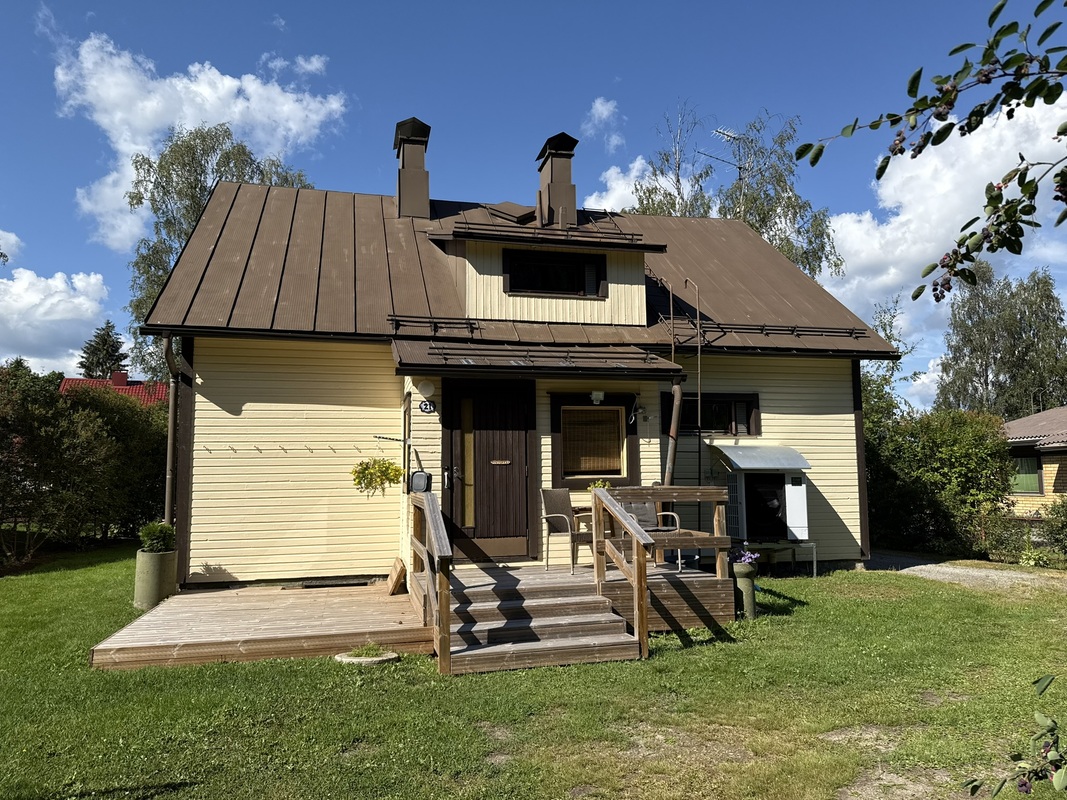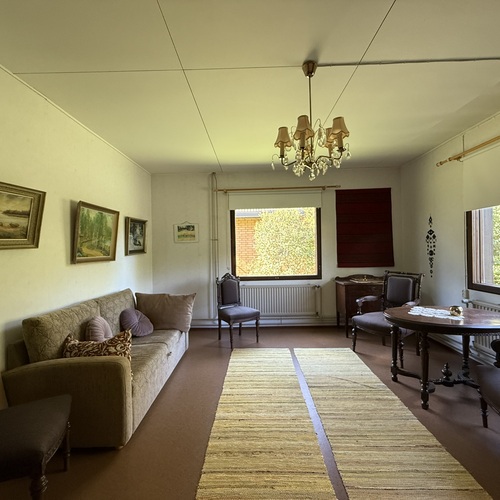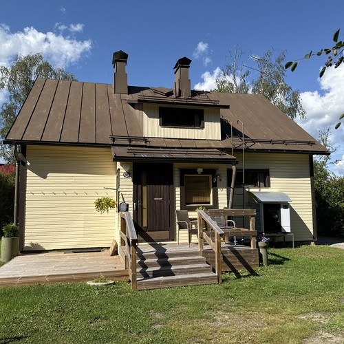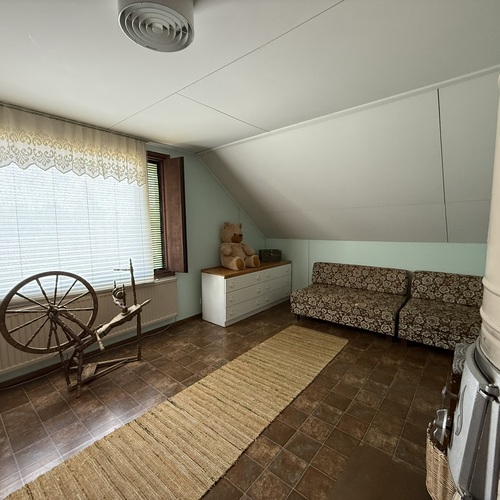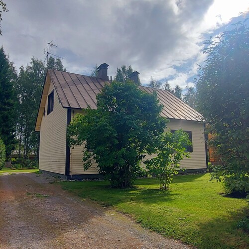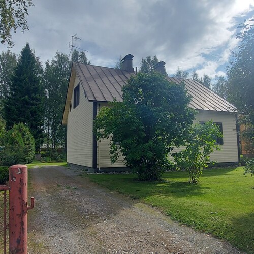 Omakotitalon alakerrassa olohuone, yksi huone, sauna, pesutilat ja wc. Yläkerrassa kaksi huonetta ja wc. Yläkerrassa myös pönttöuuni.