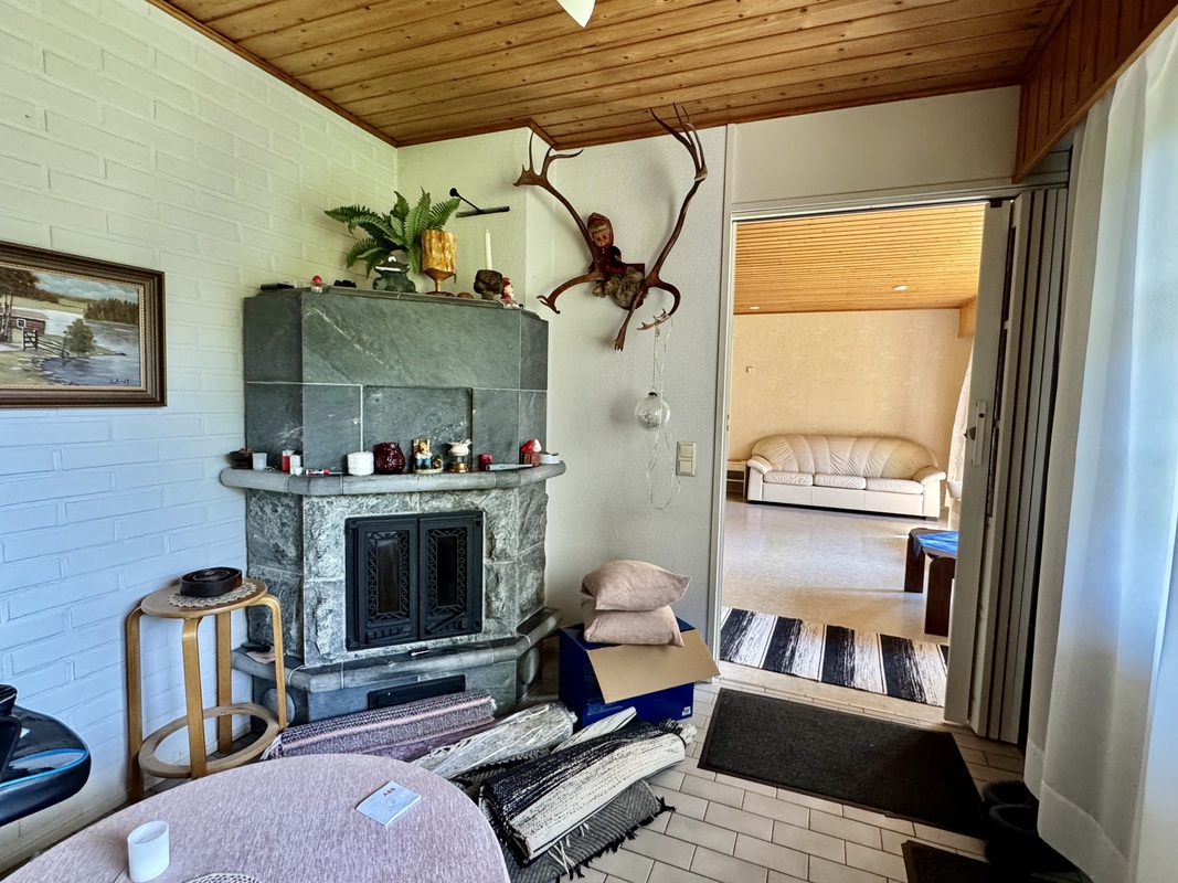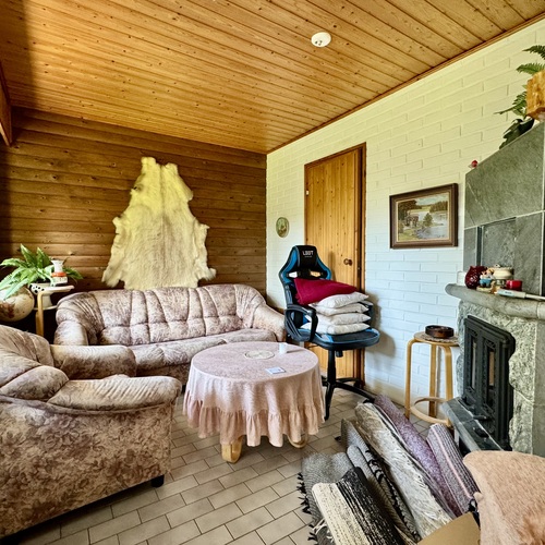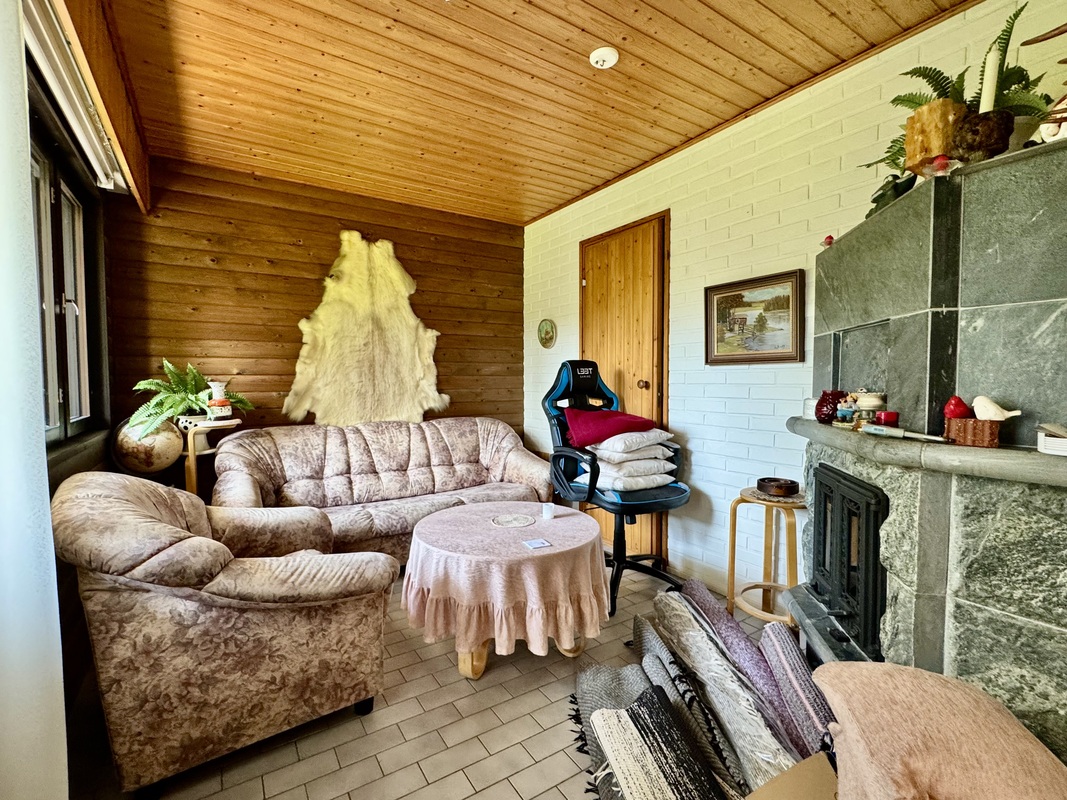 Takkahuone varaava takka, seinät maalattu sekä puu, lattia laatta. Käynti ulos takapihalle.