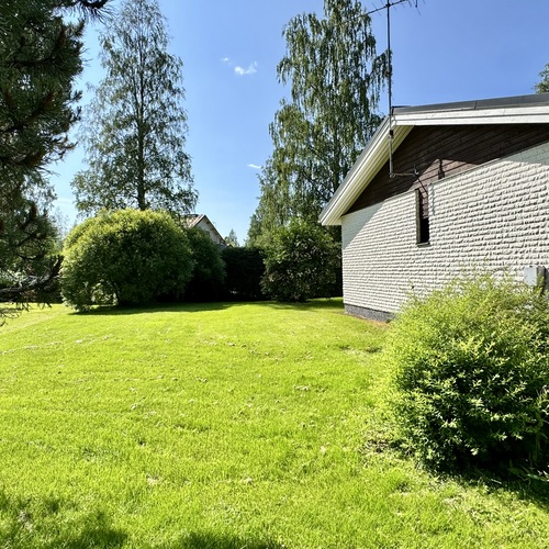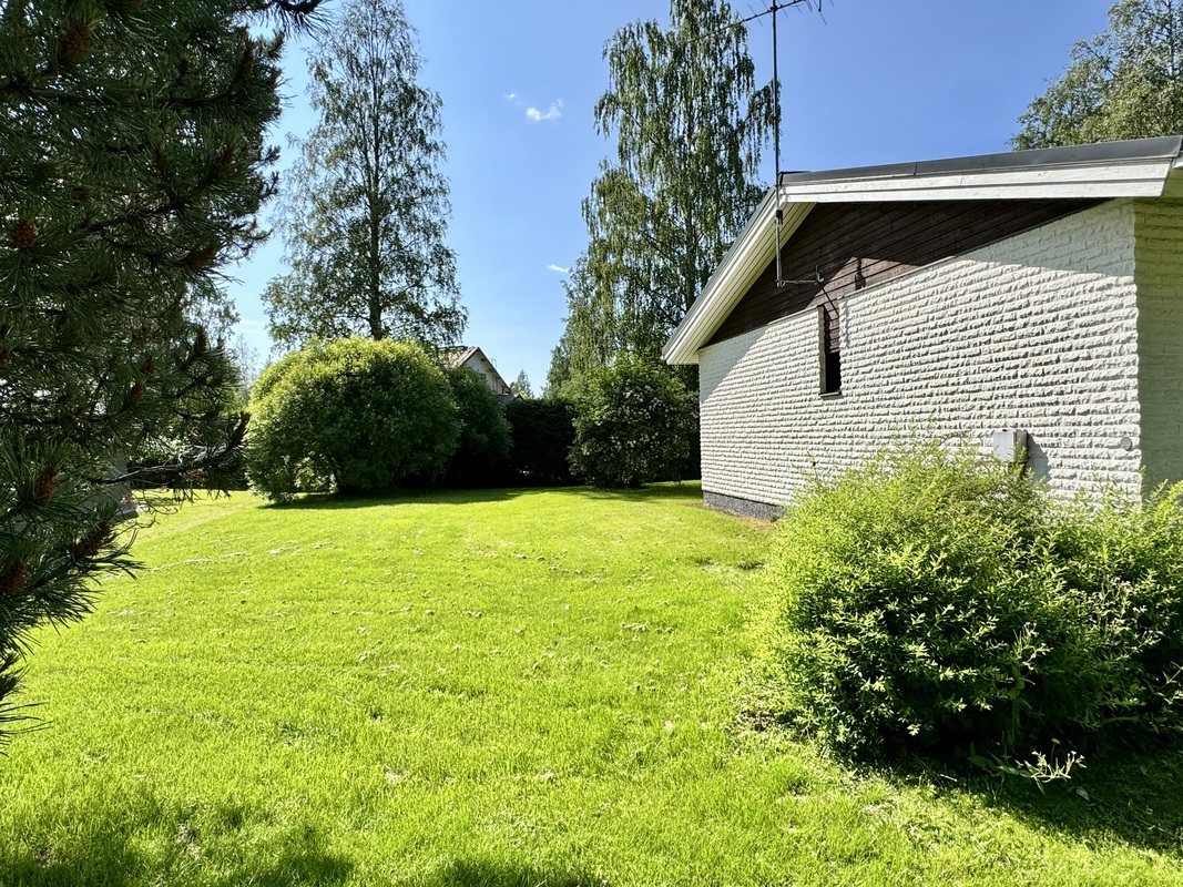 Oma tontti 1047 m², tontilla koristepensaita, puita ja nurmialue.