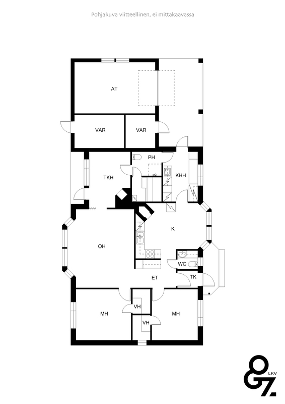 Omakotitalossa 3 h + k + tkh + khh + kph + s + 2 wc + at + varastot.