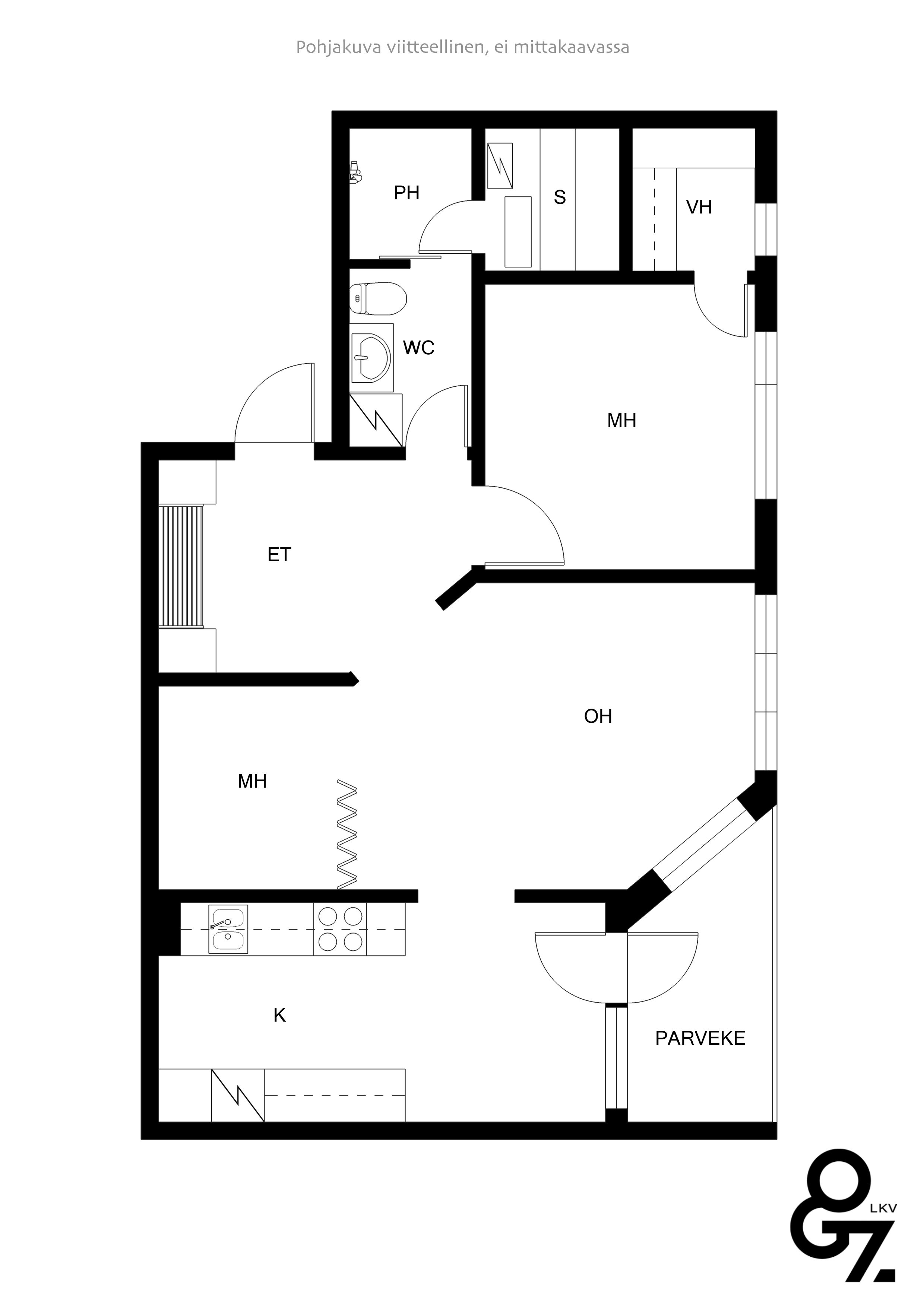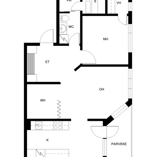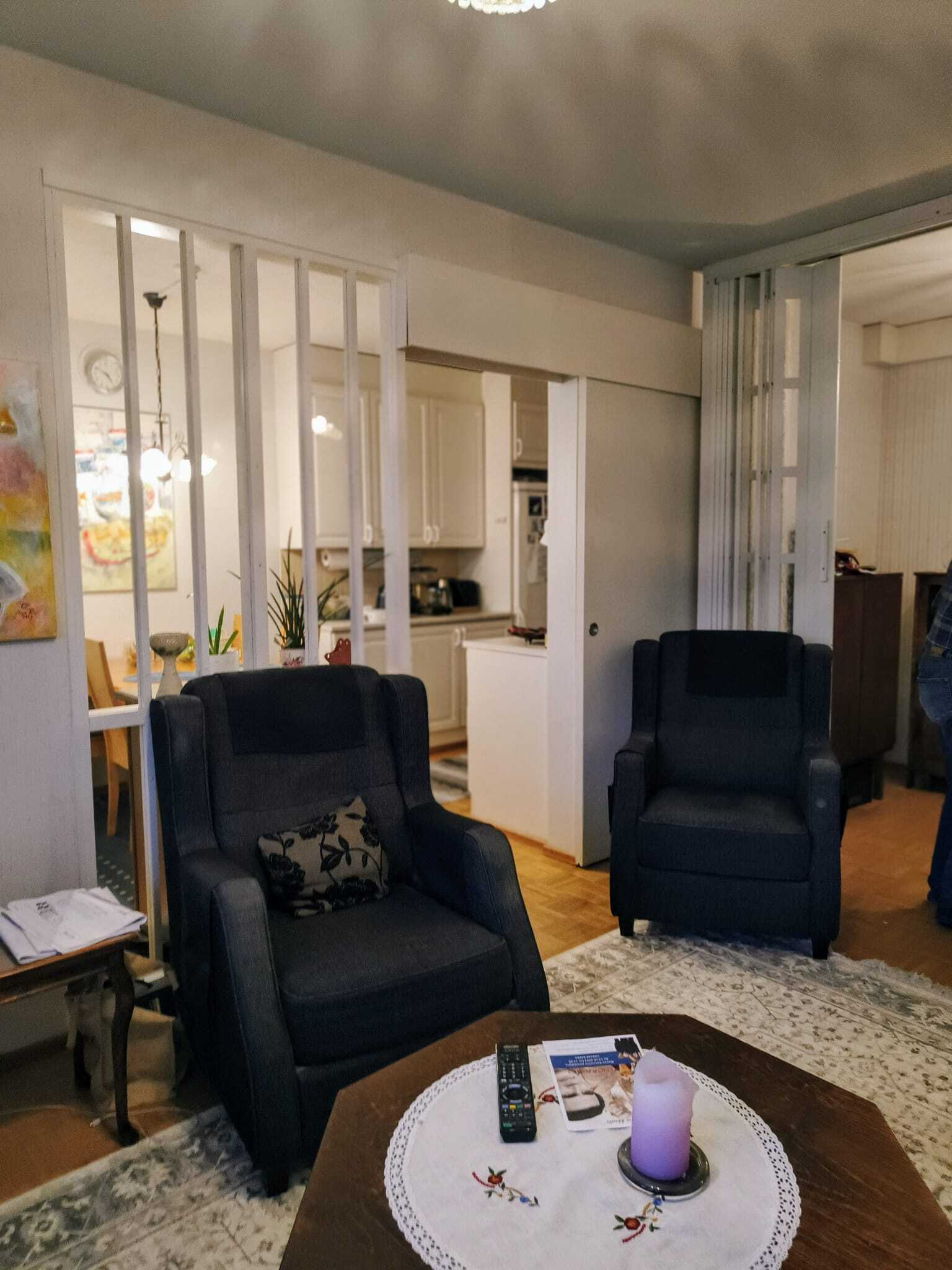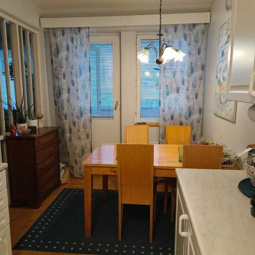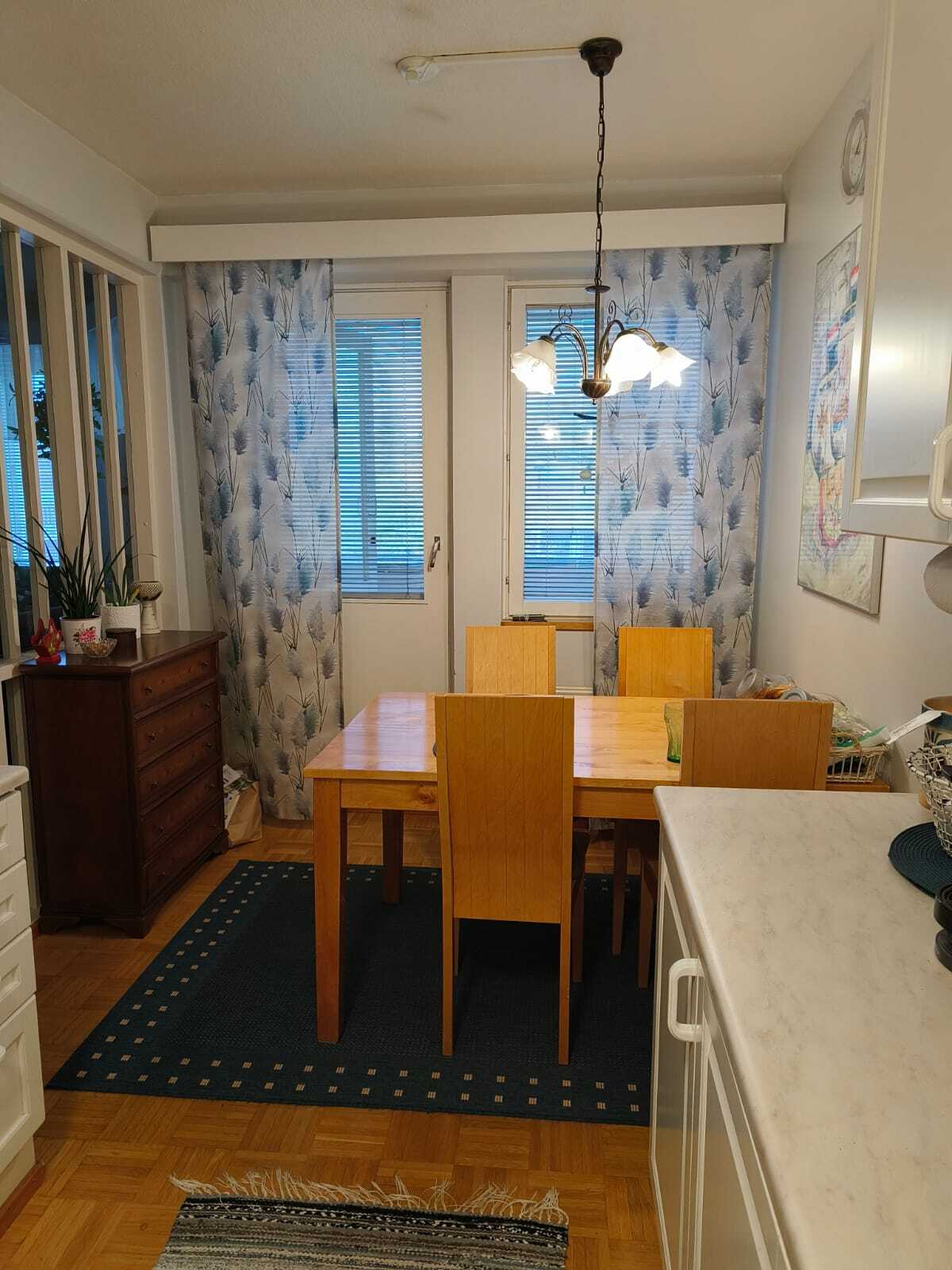 Ruokailuryhmälle hyvin tilaa, käynti parvekkeelle. Kevyt tilanjakajaseinä olohuoneeseen sekä liukuovi.