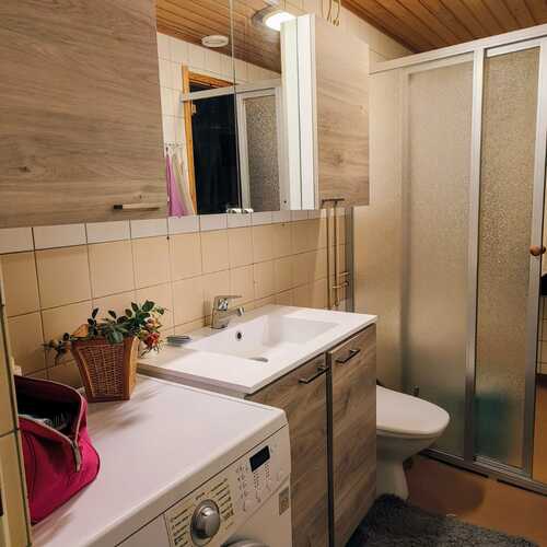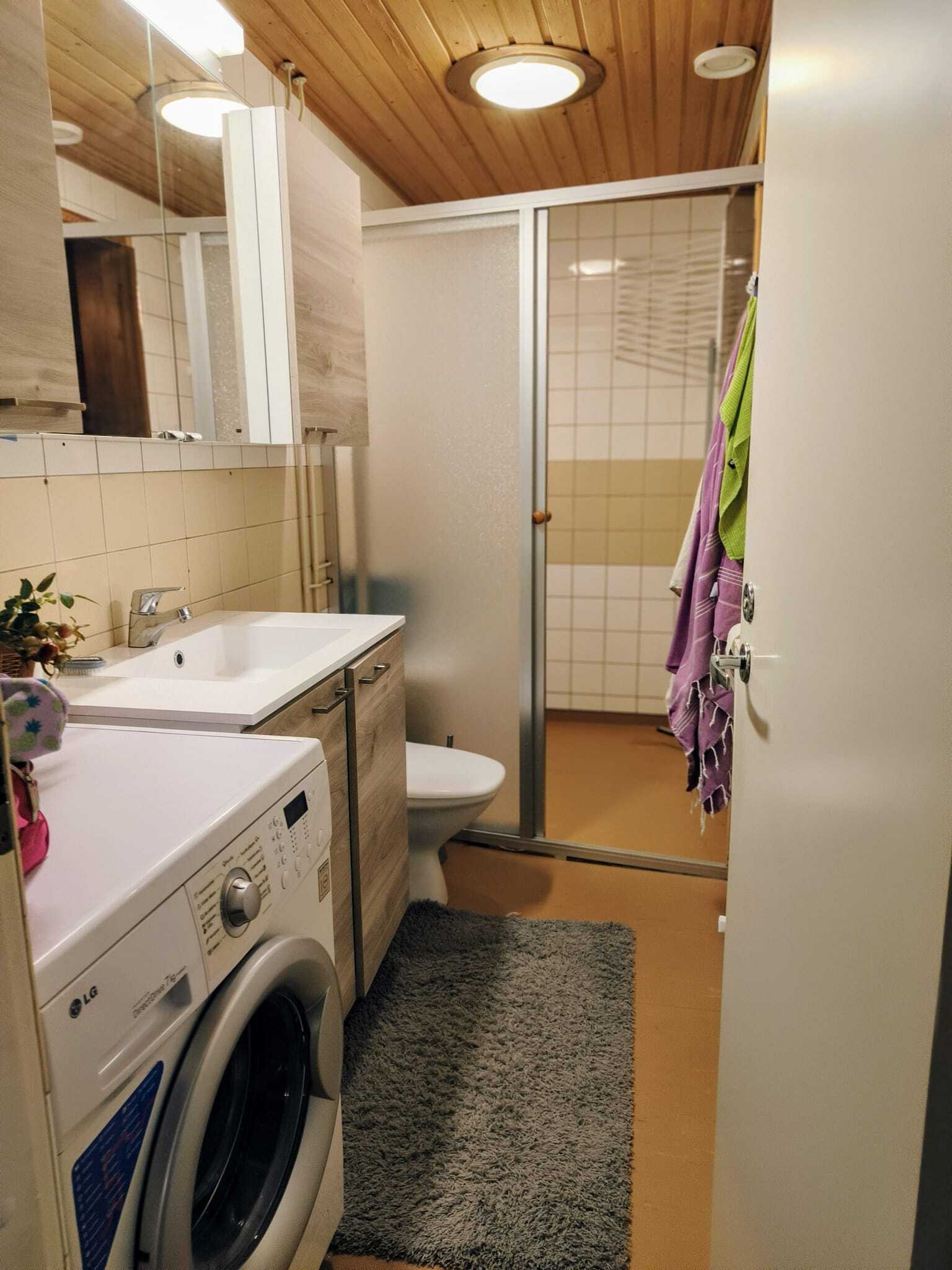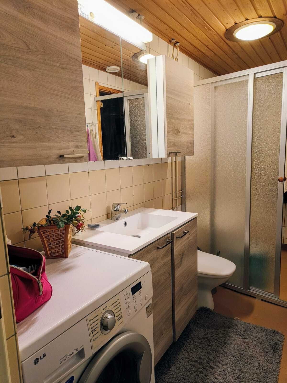 Varusteet: suihkuseinä, pesukoneliitäntä, wc-istuin, suihku, peilikaappi