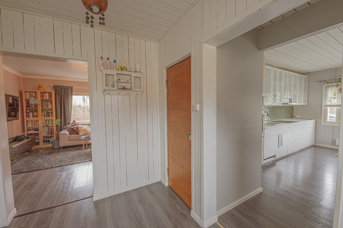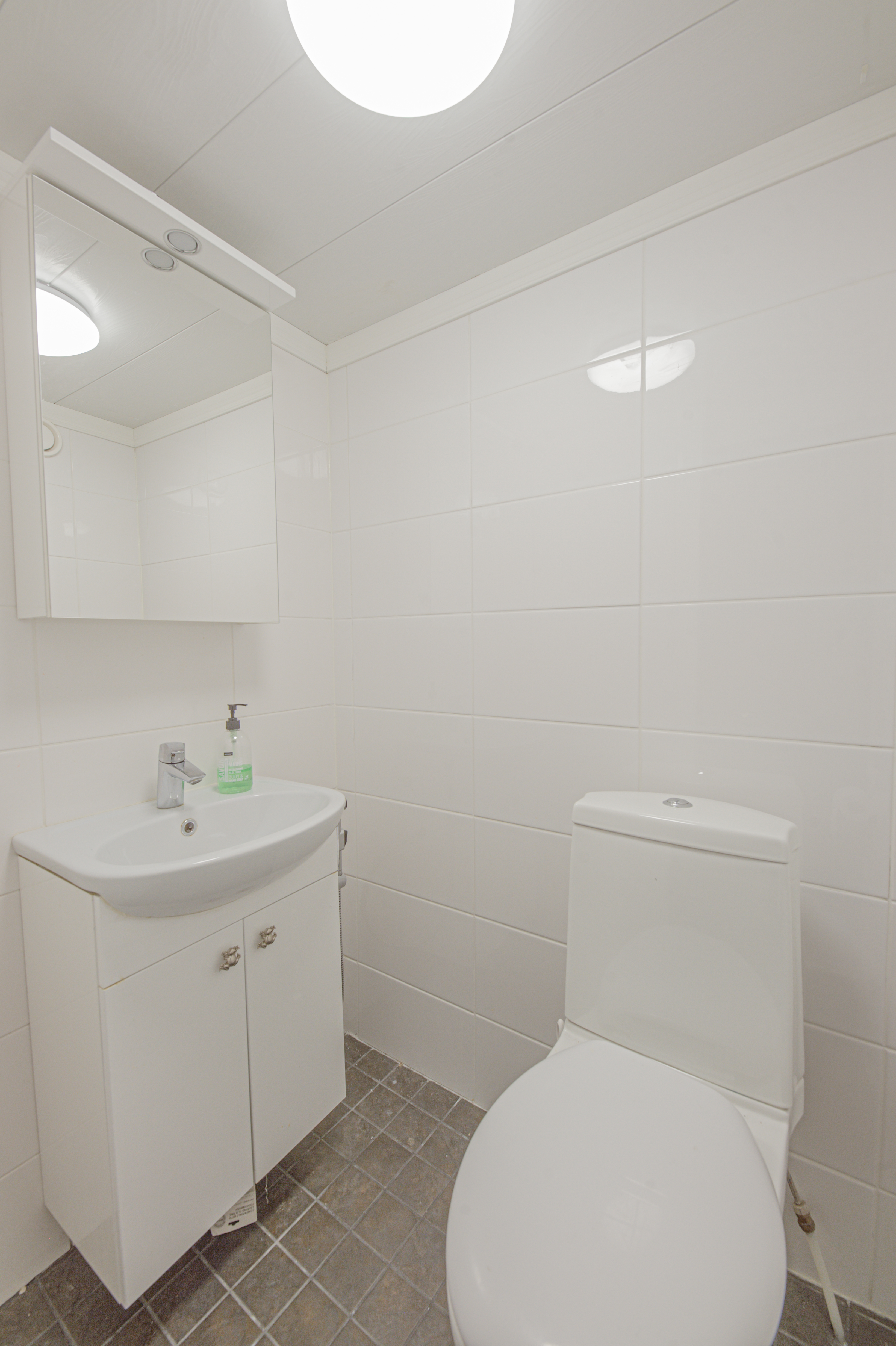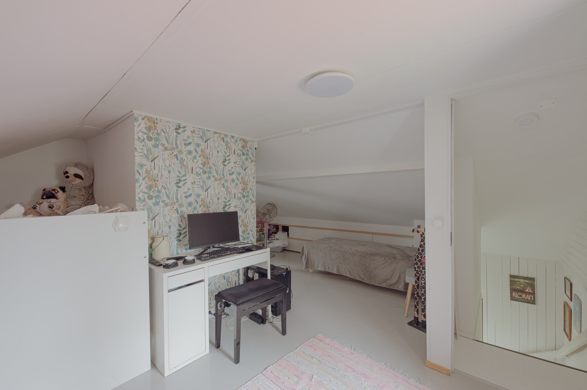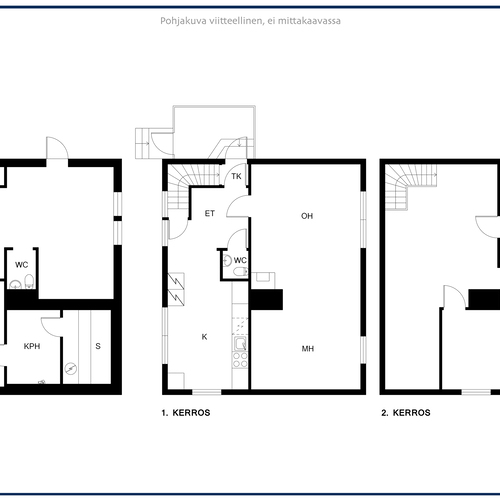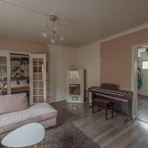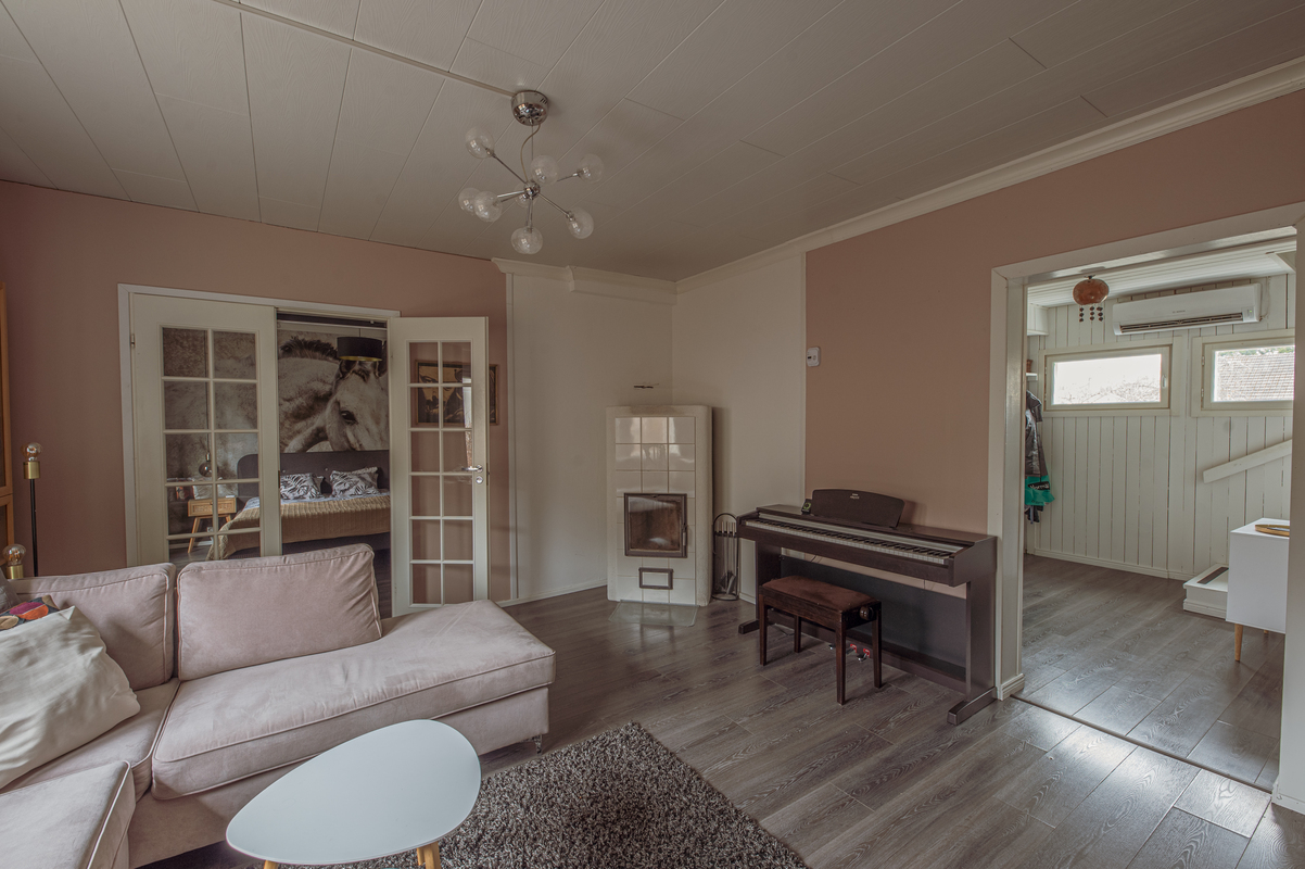 Asuintilat ovat kolmessa kerroksessa. Yläkerrassa on kaksi makuuhuonetta ja wc. Säilytystilaa on hyvin viistokaton alla. Sisääntulokerroksessa on keittiö, olohuone, makuuhuone ja wc. Kellarikerroksessa on kylpyhuone, sauna, kodinhoitotila ja huone, joka toimii tällä hetkellä makuuhuoneena.