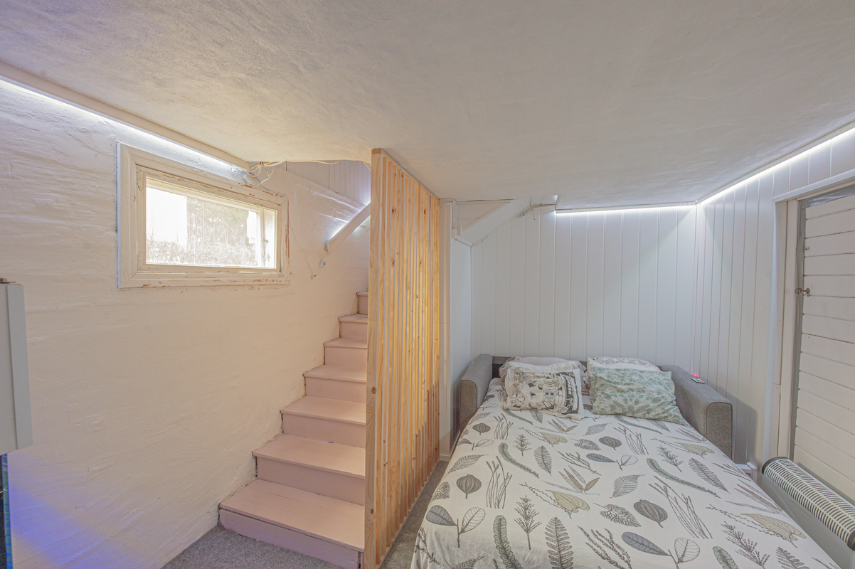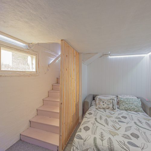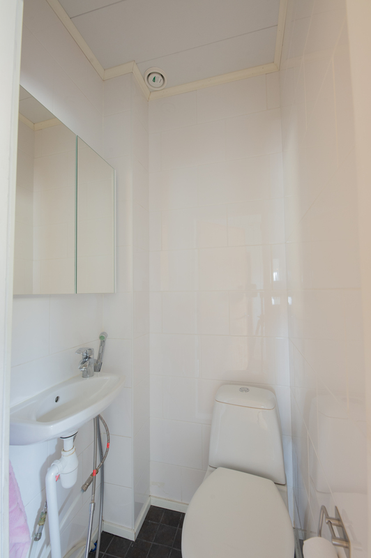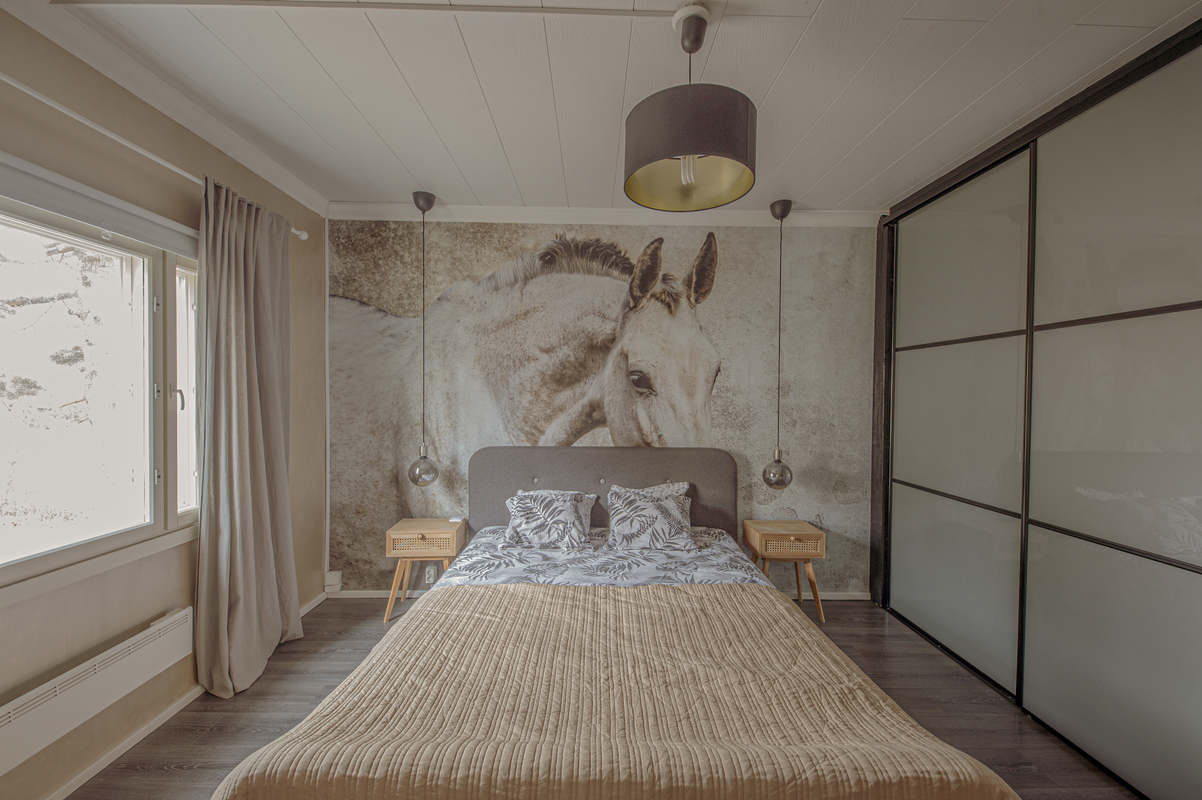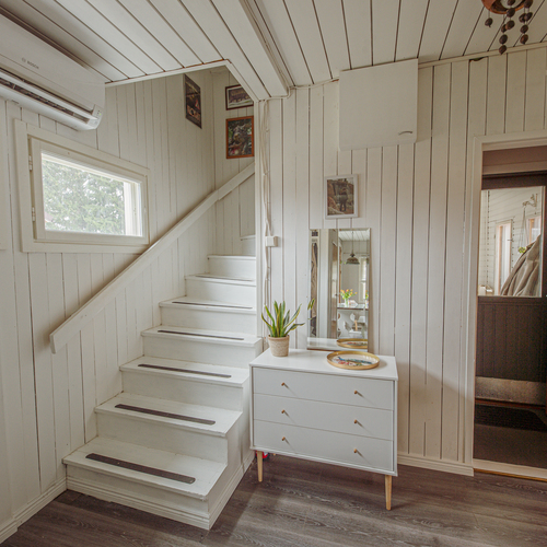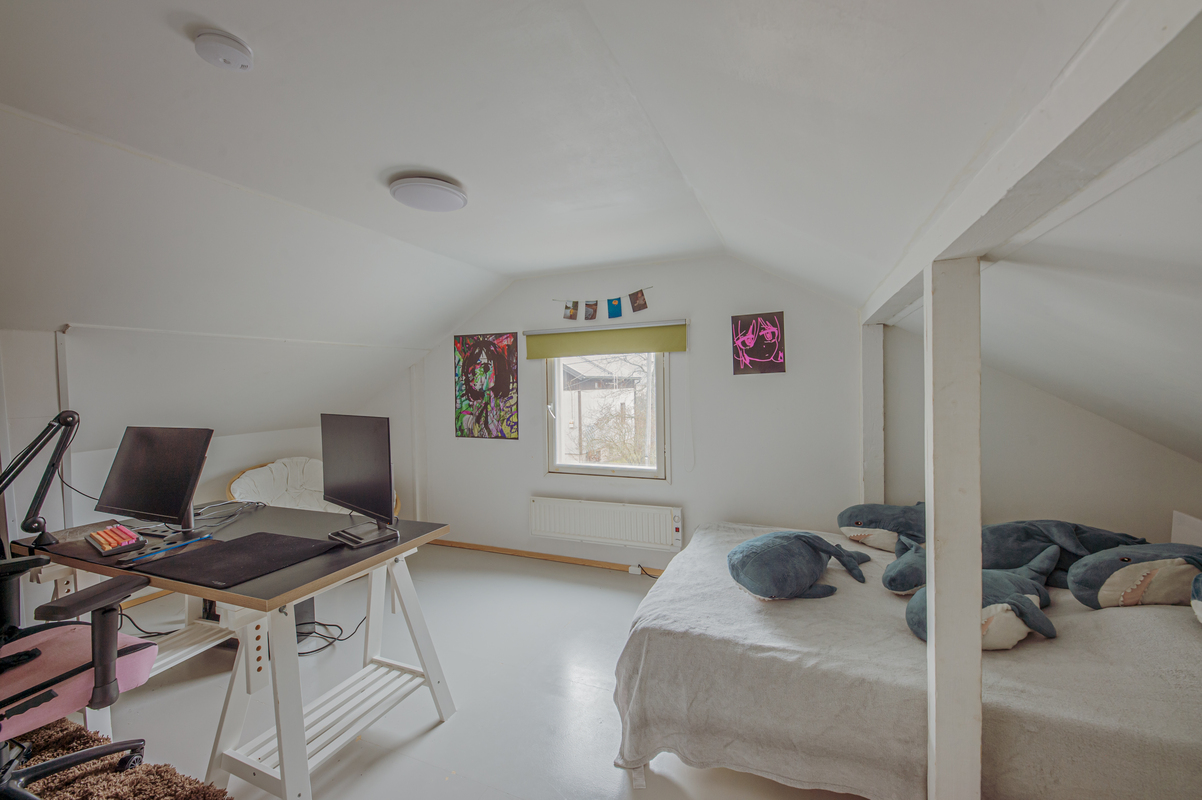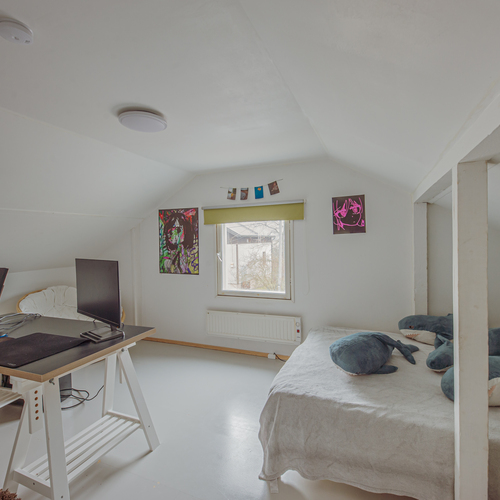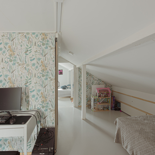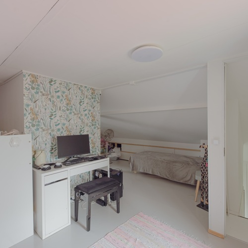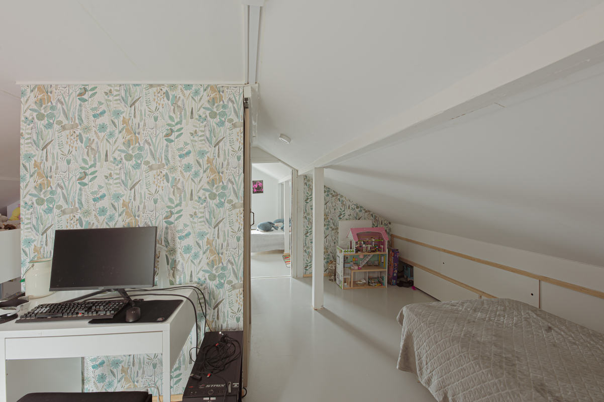 Pintamateriaalit: Alakerran makuuhuoneen lattia laminaattia. Yläkerran lattia maalattu lastulevy.