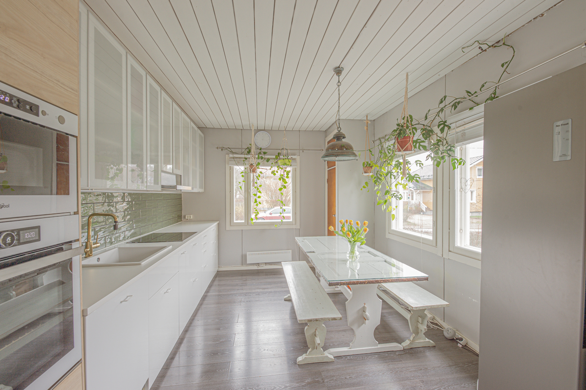 Varusteet: sälekaihtimet/rullaverhot, verhotangot, naulakko, kiinteät valaisimet, lämminvesivaraaja, ilmalämpöpumppu, istutukset