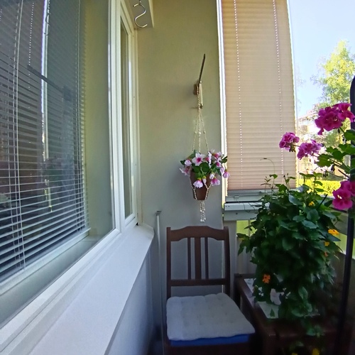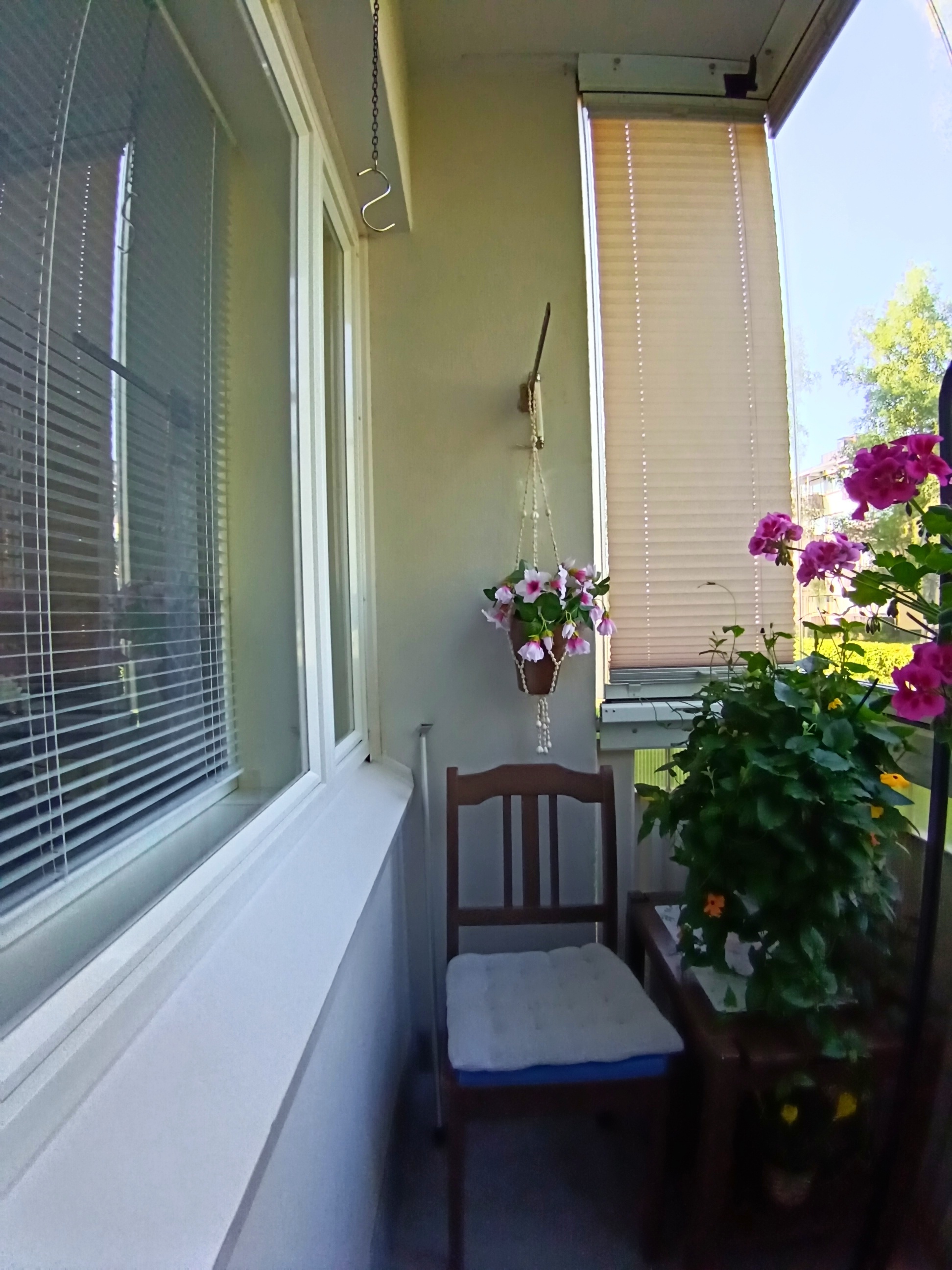 Huoneiston lasitettu parveke sijaitsee puistoalueen suuntaan.