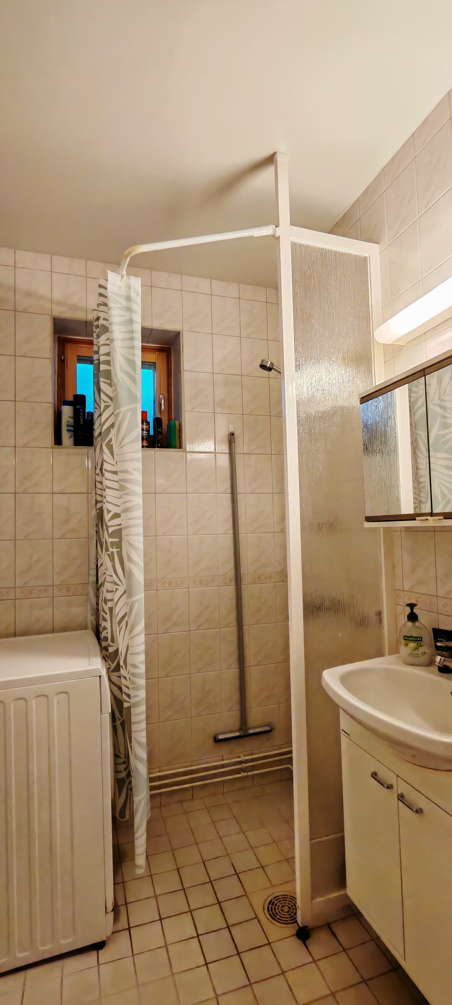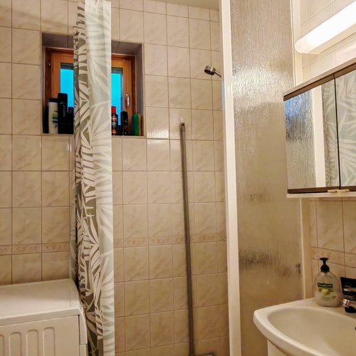 Varusteet: suihkuseinä, pesukoneliitäntä, wc-istuin, suihku, peilikaappi, kylpyhuonekaapisto