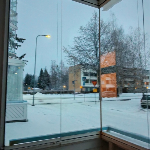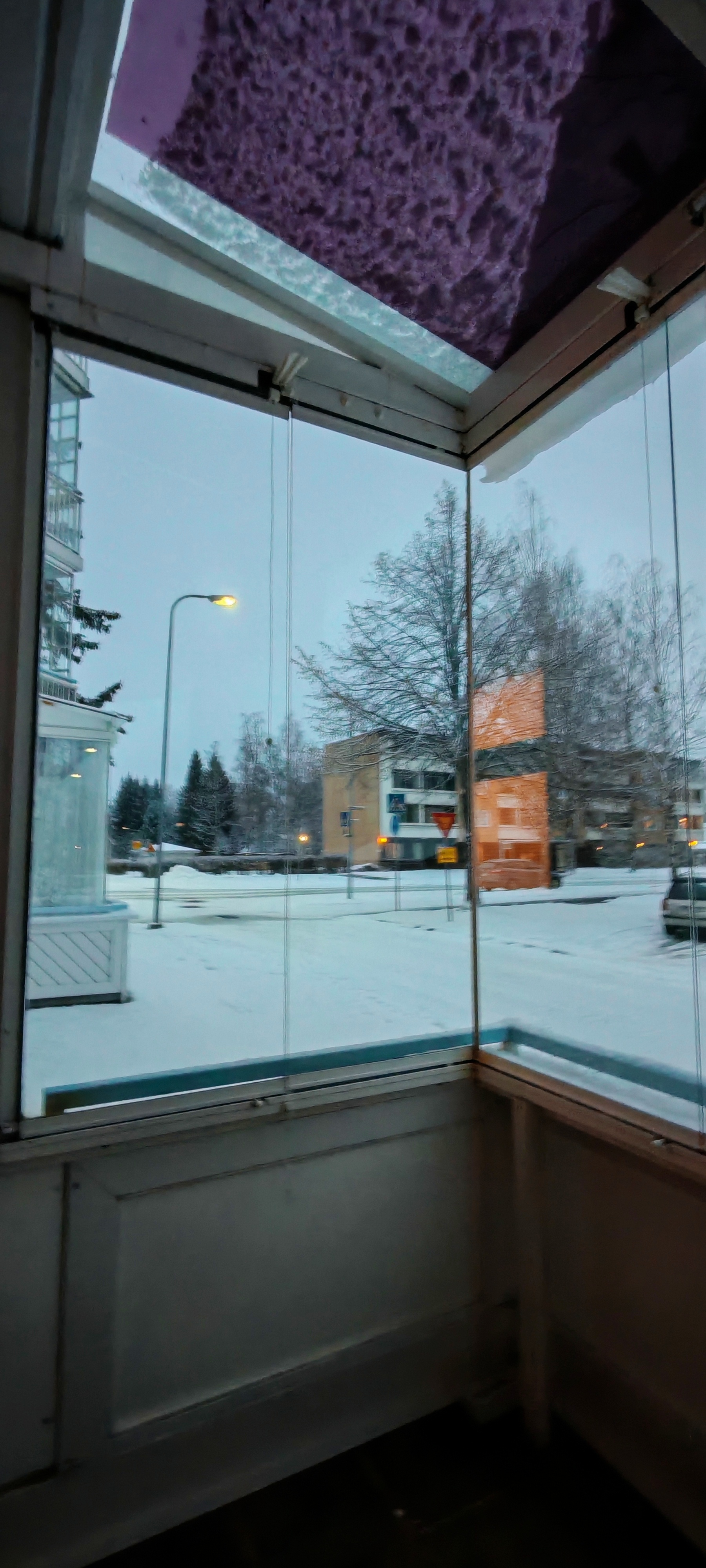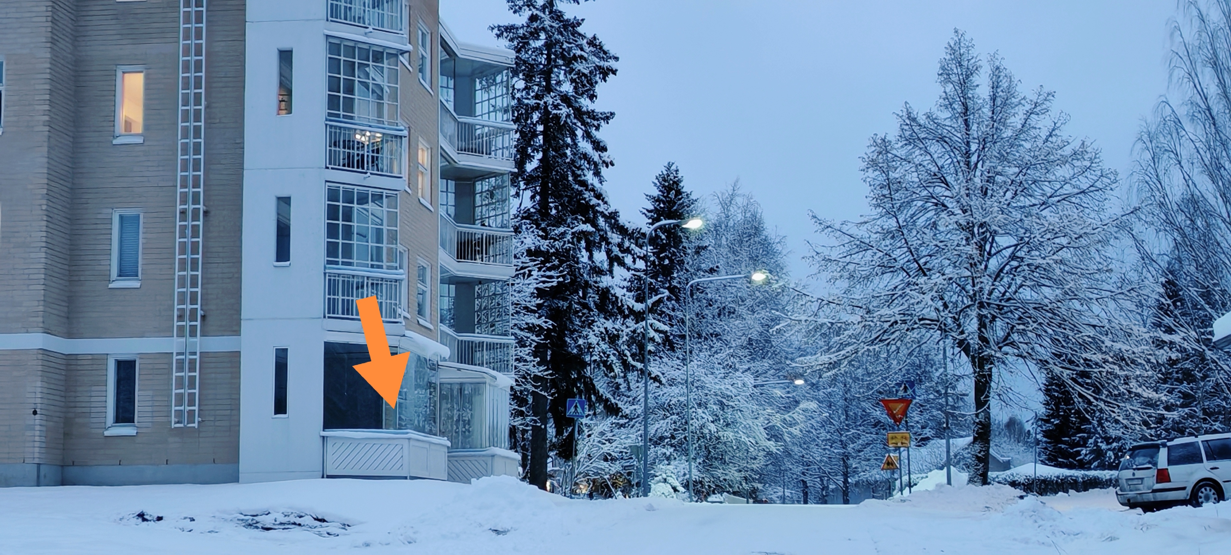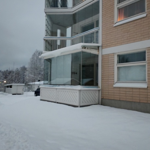 Parveke on lasitettu ja katettu, avautuu rauhalliselle poikkikadulle.