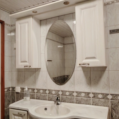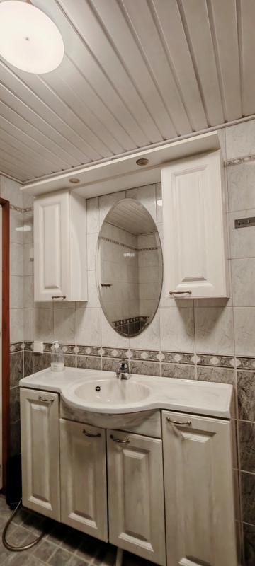 Varusteet: suihkuseinä, lattialämmitys, wc-istuin, suihku, peilikaappi, kylpyhuonekaapisto