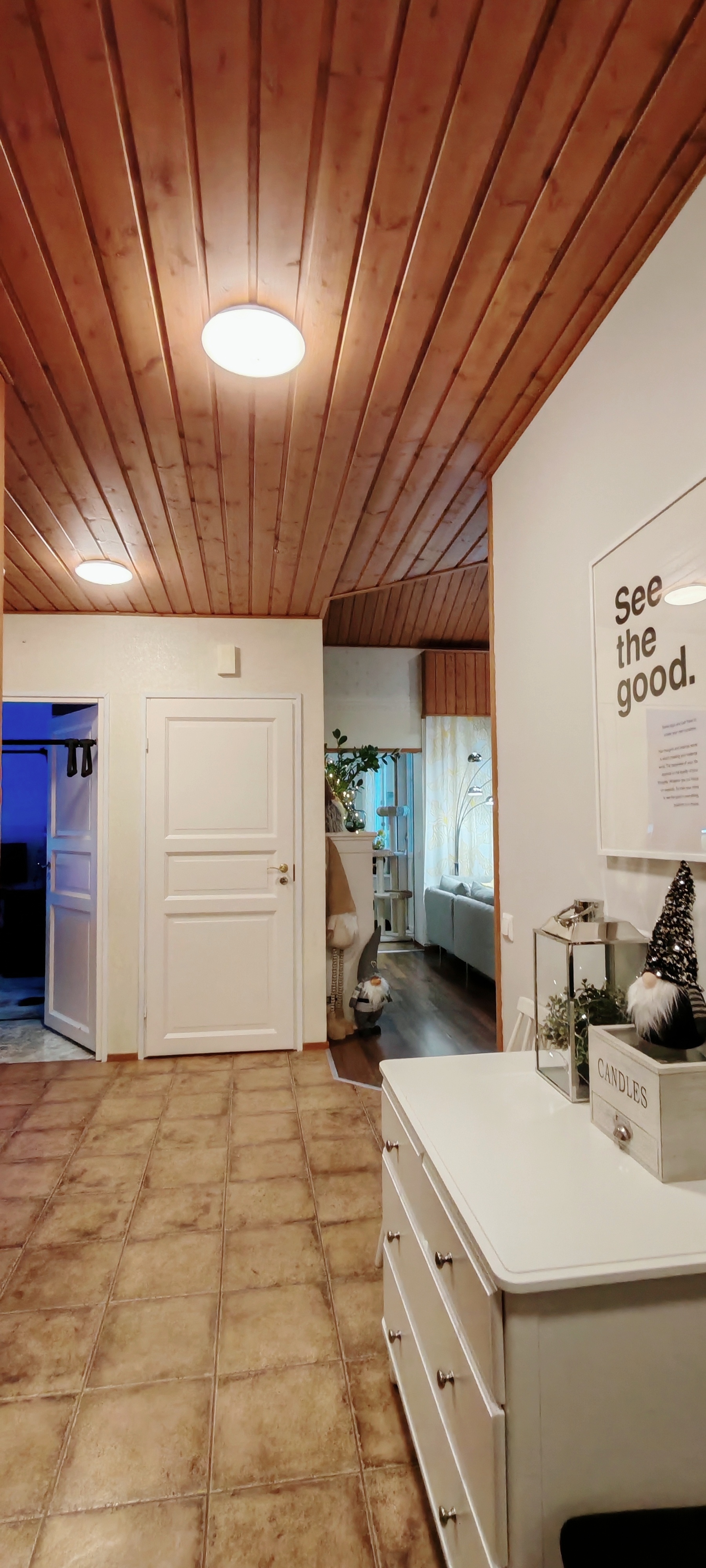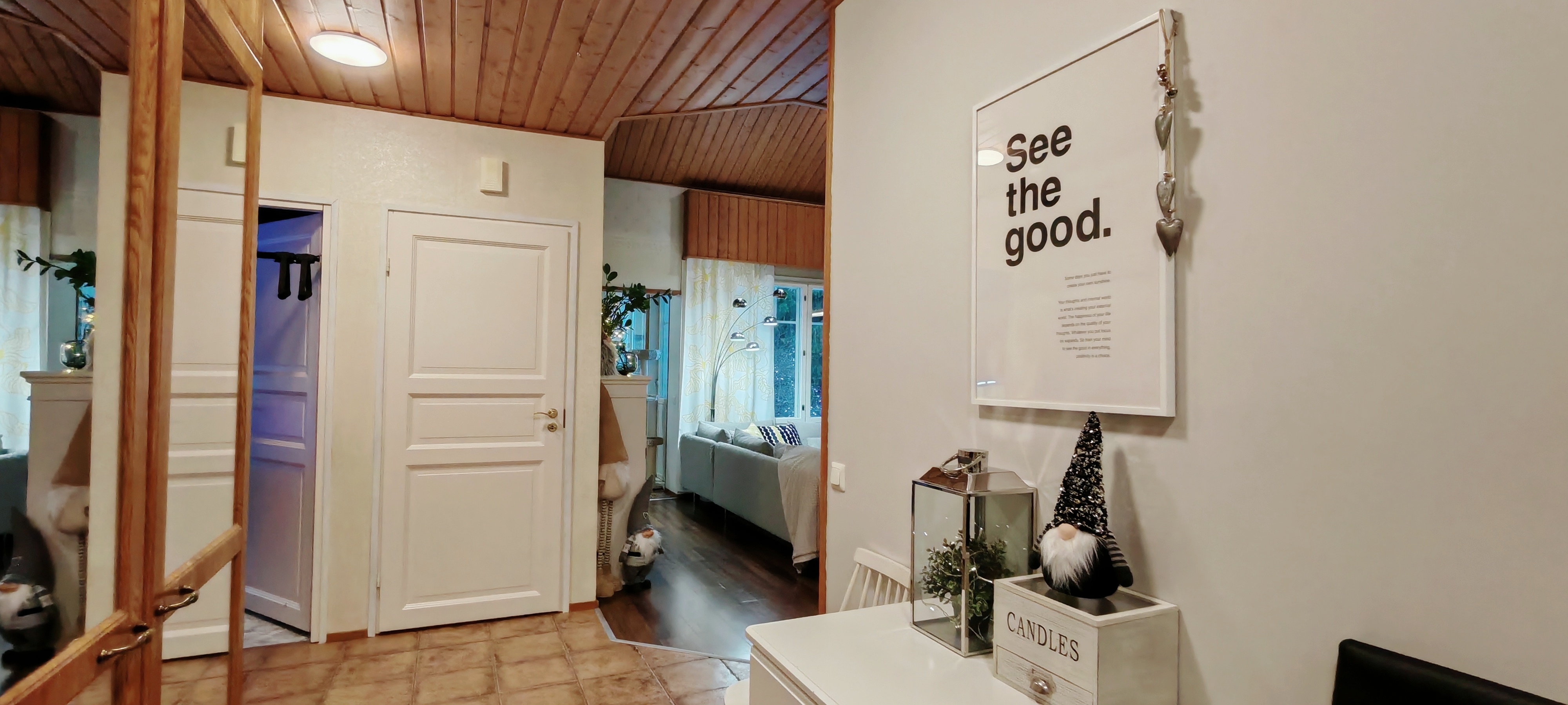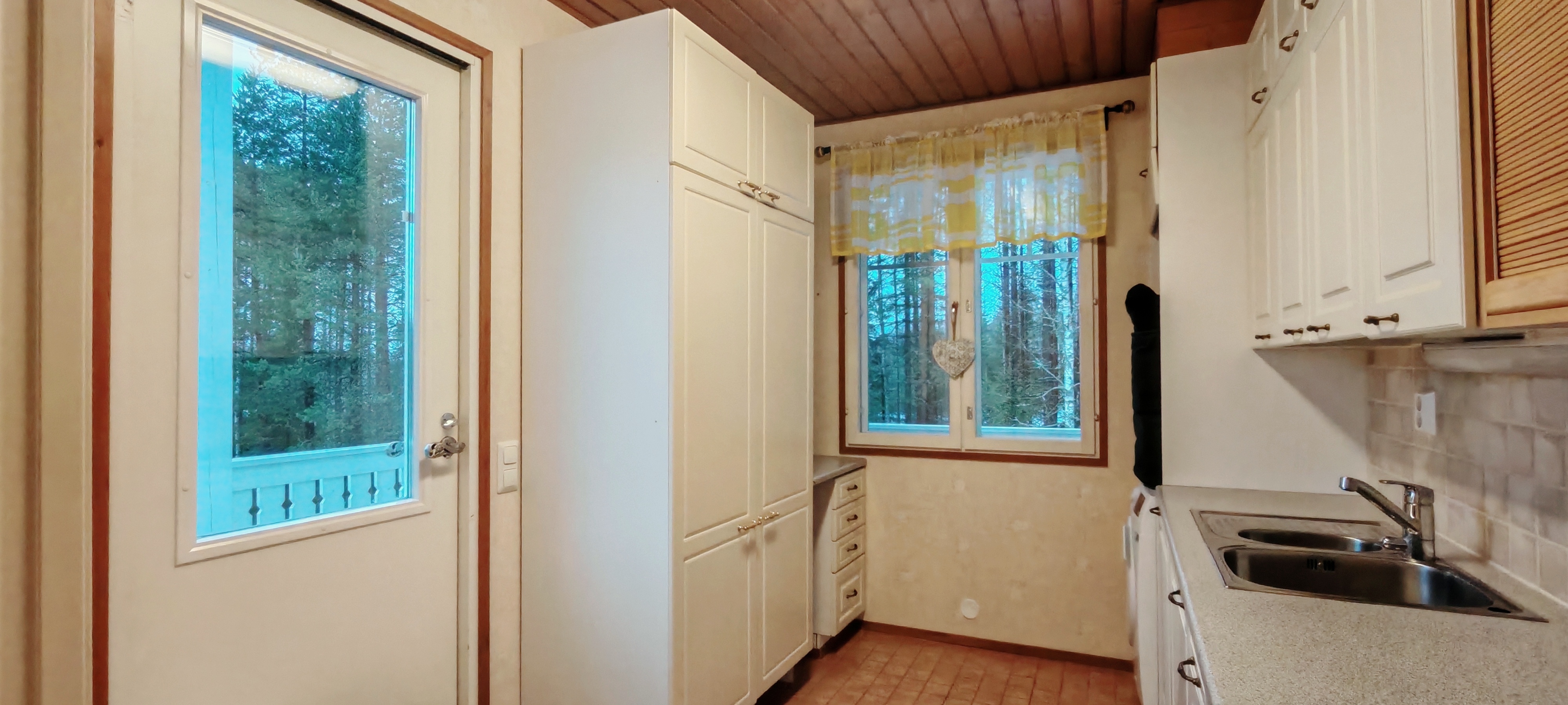 Takkahuoneessa seinä sisustuslevyä, käynti terassille.