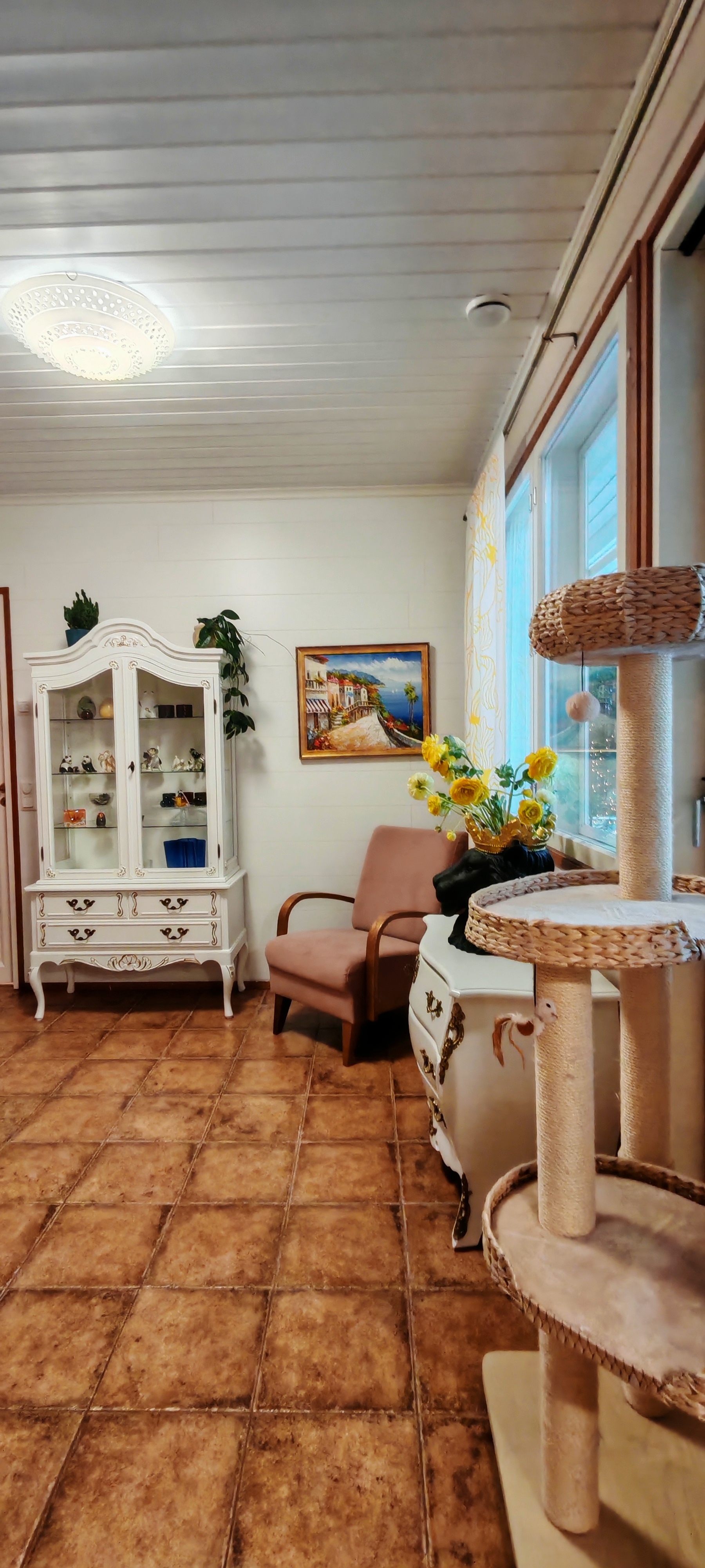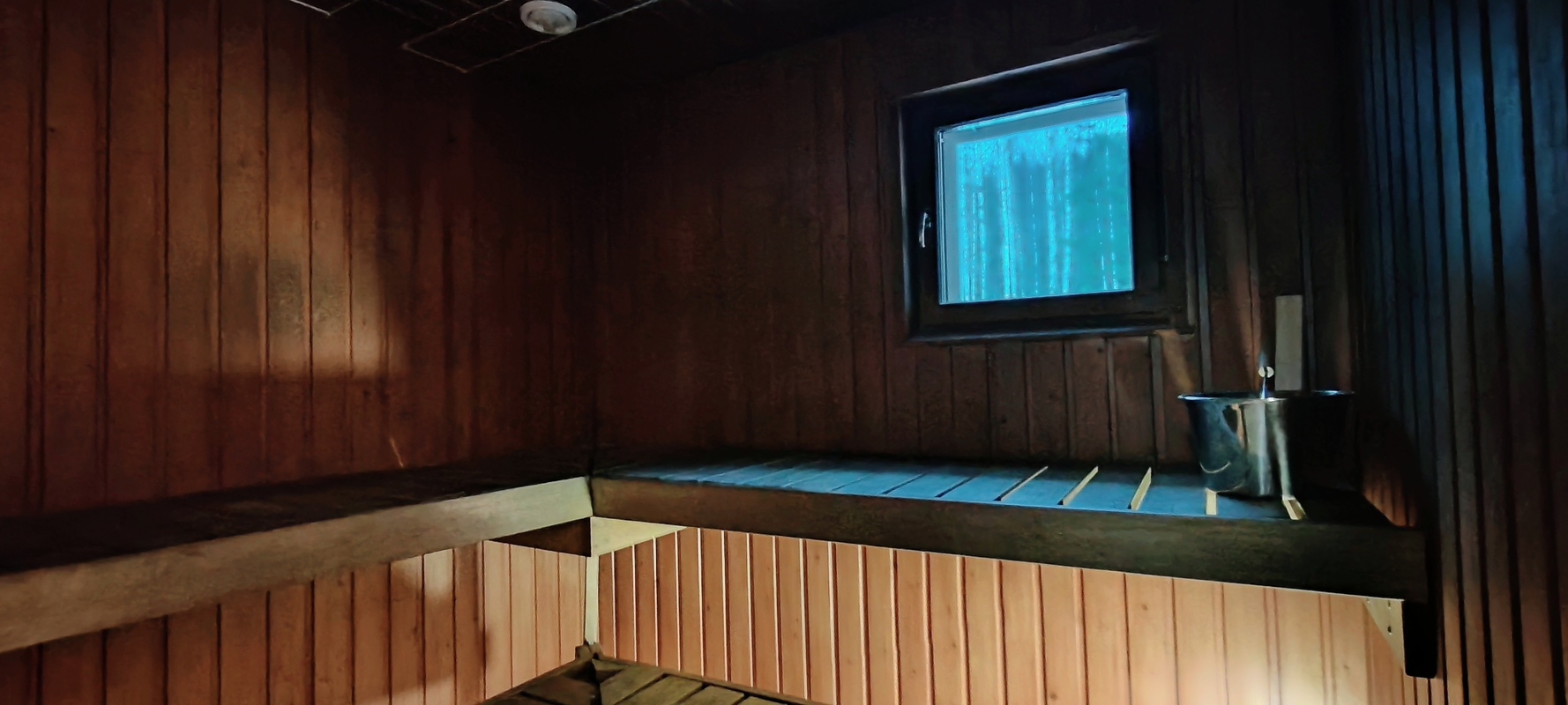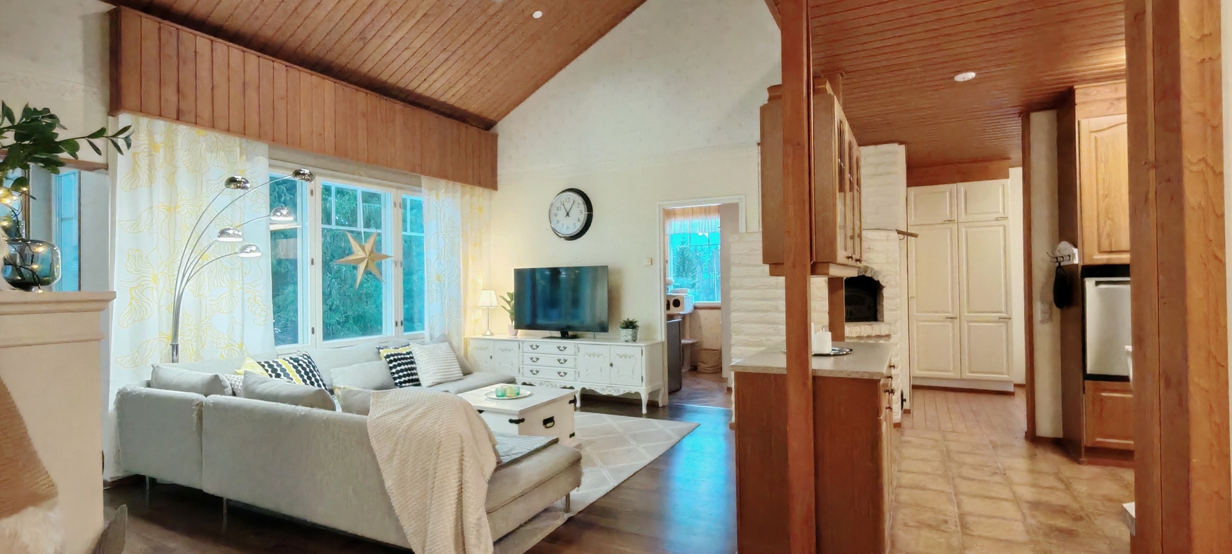 Takkahuoneessa seinä sisustuslevyä, käynti terassille.