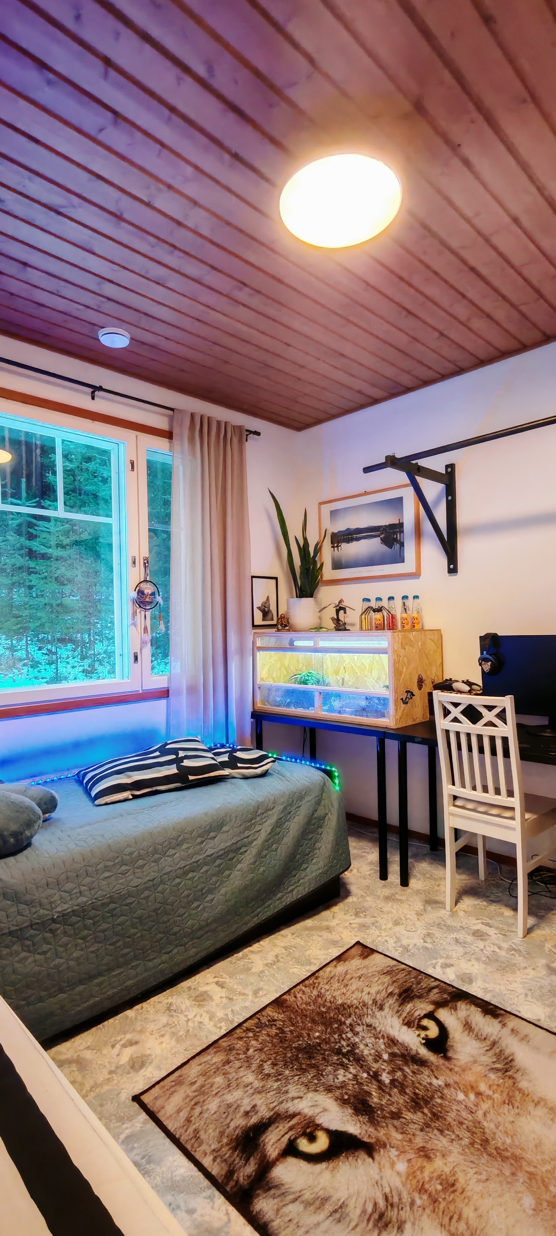 Yläaula tarjoaa tilavan harraste- tai oleskelutilan viistokaton alla.