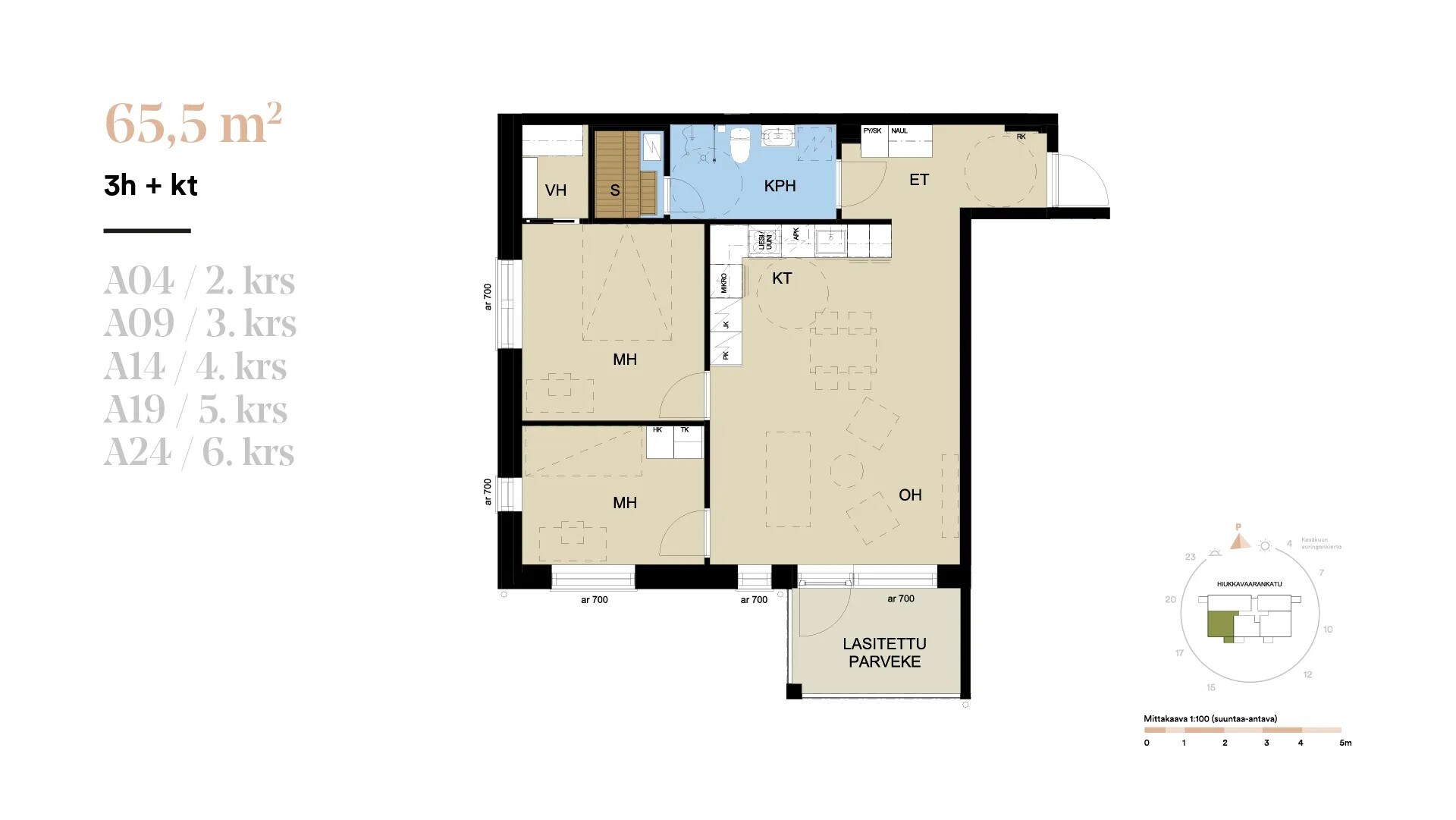 oleva leikkipaikka. Kaikista kodeista löytyy lasitettu parveke, 1. kerroksen 77 m²:n asunnosta löytyy myös terassi.