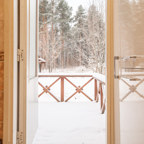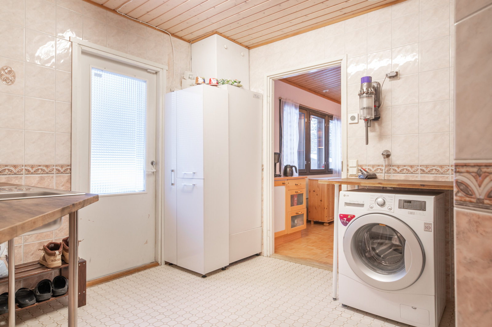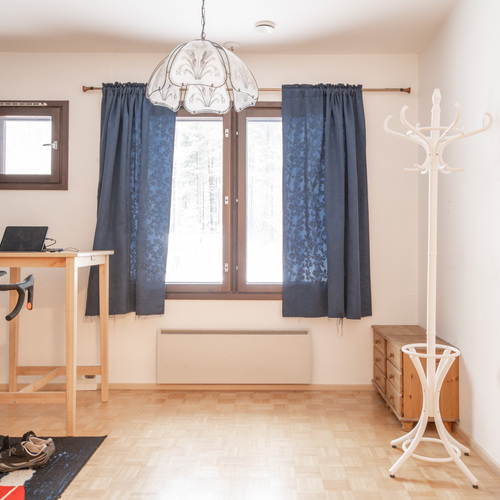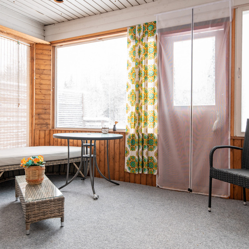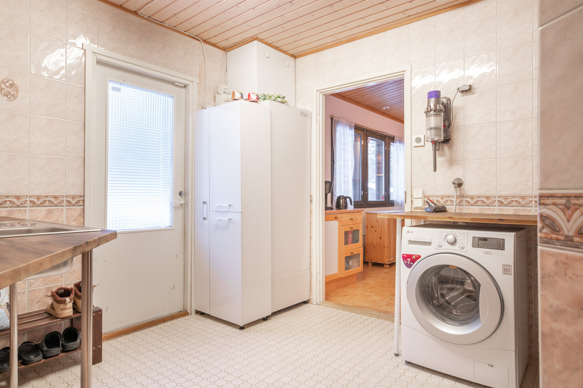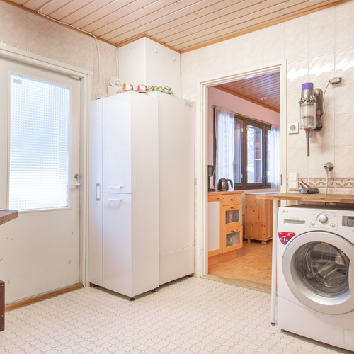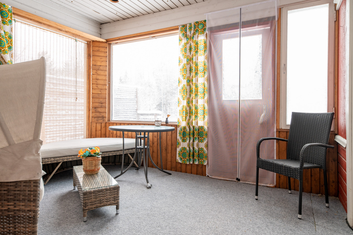 Talossa on lasitettu kuisti, jonka kautta kuljetaan erilliseen lämpimään huoneeseen, joka soveltuu mainiosti esimerkiksi varastoksi, työ- tai toimistohuoneeksi.