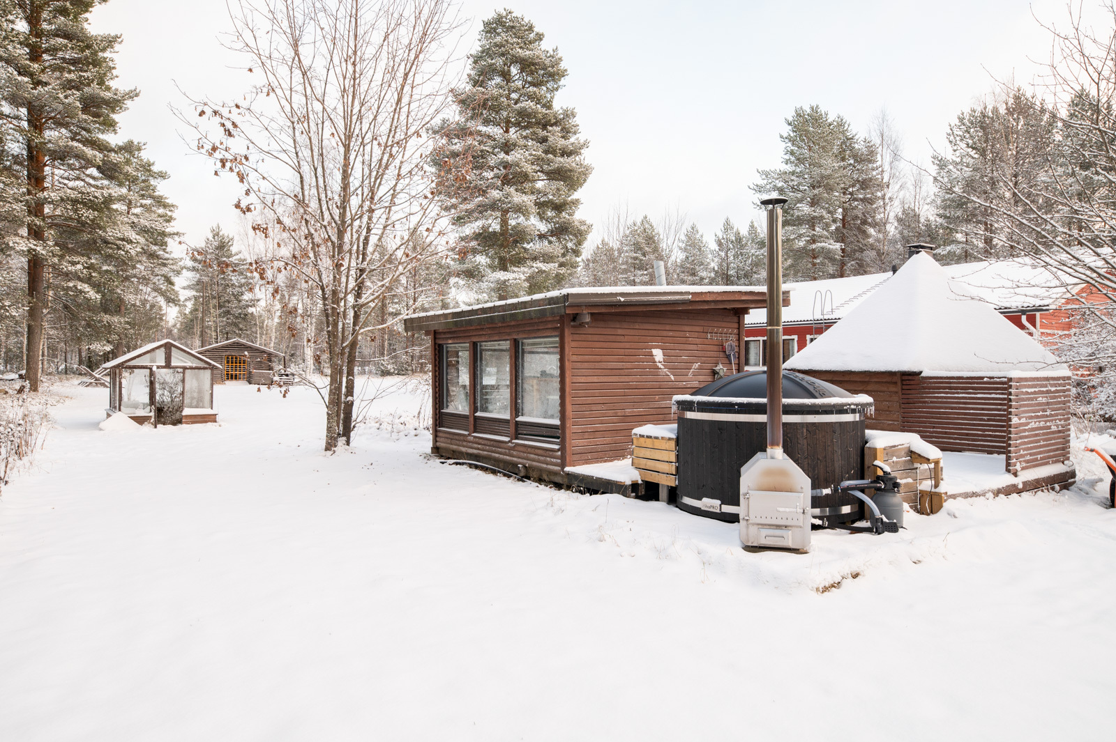Pihapiiri on todellinen rentoutujan unelma: käytössäsi ovat ulkosauna, palju, kesäkeittiö sekä suuri puuliiteri. Lisäksi tontilla on erittäin tilava, noin 80 m² lämmin autotalli.