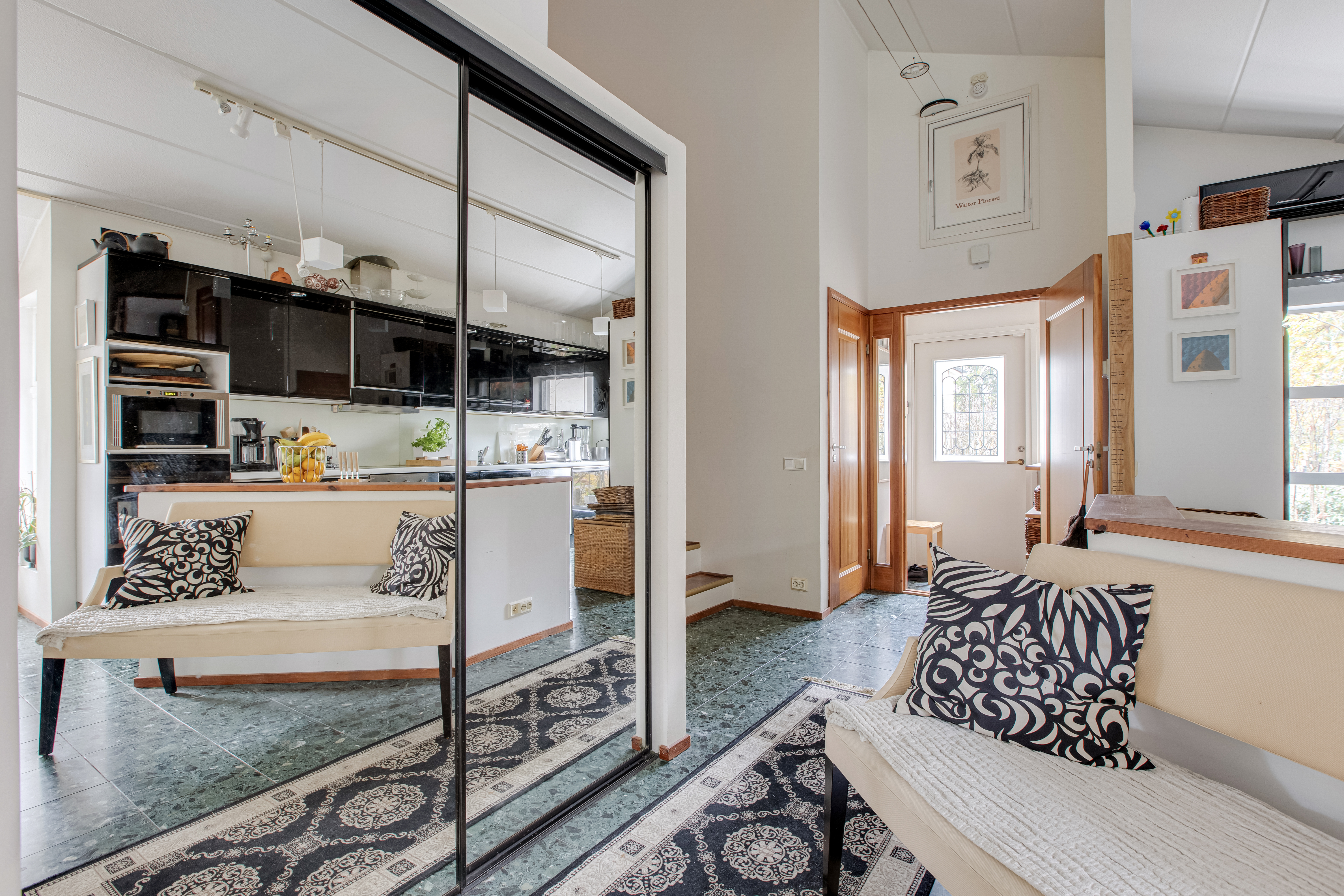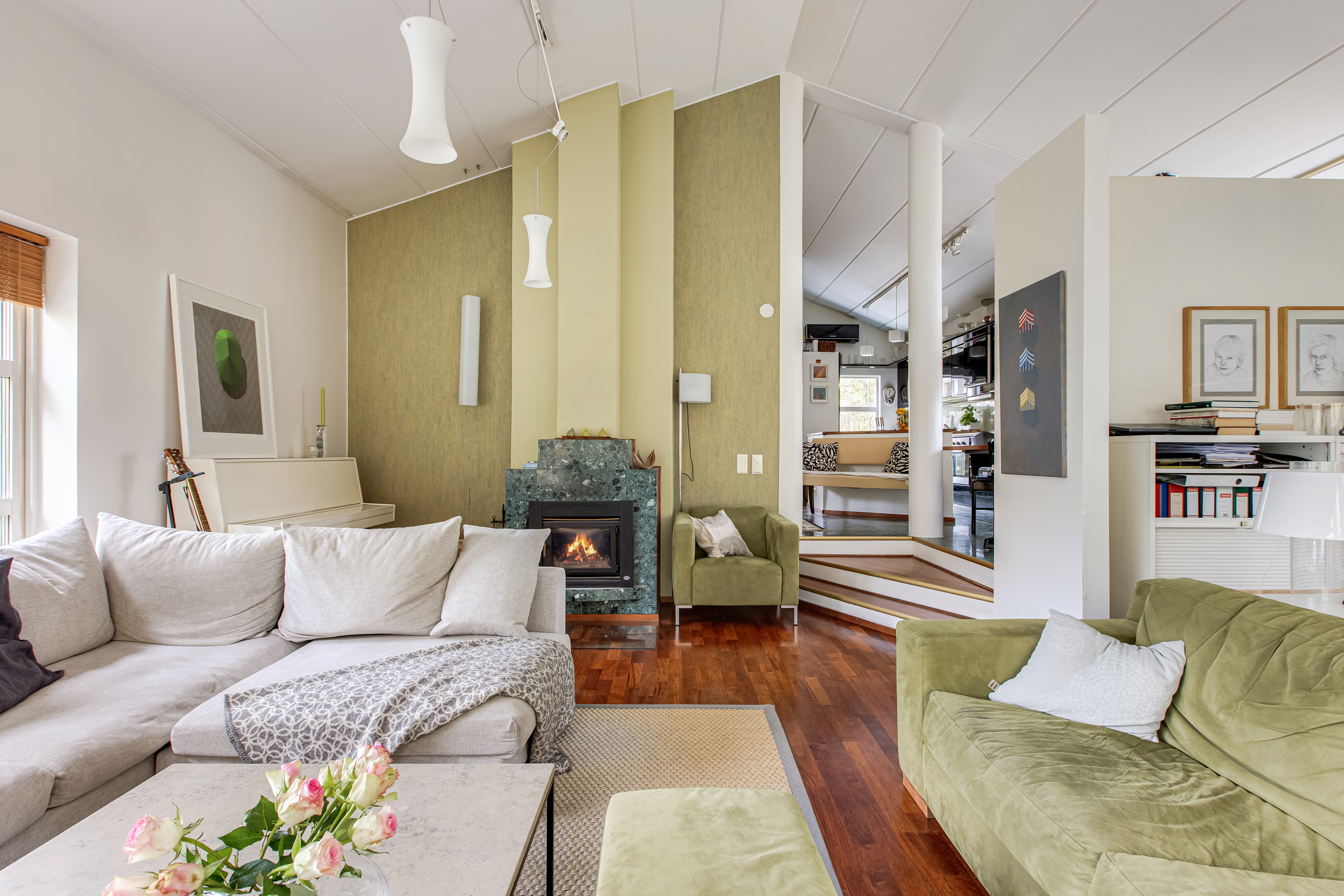 Olohuoneen yhteydessä muunneltavissa oleva työhuone/kirjasto sekä tilat ja avoimeen ruokailutila/saarekkeelliseen keittiötilaan. Olo- ja takkahuoneessa takat. Sisäänkäynnin yhteydessä erillinen wc.