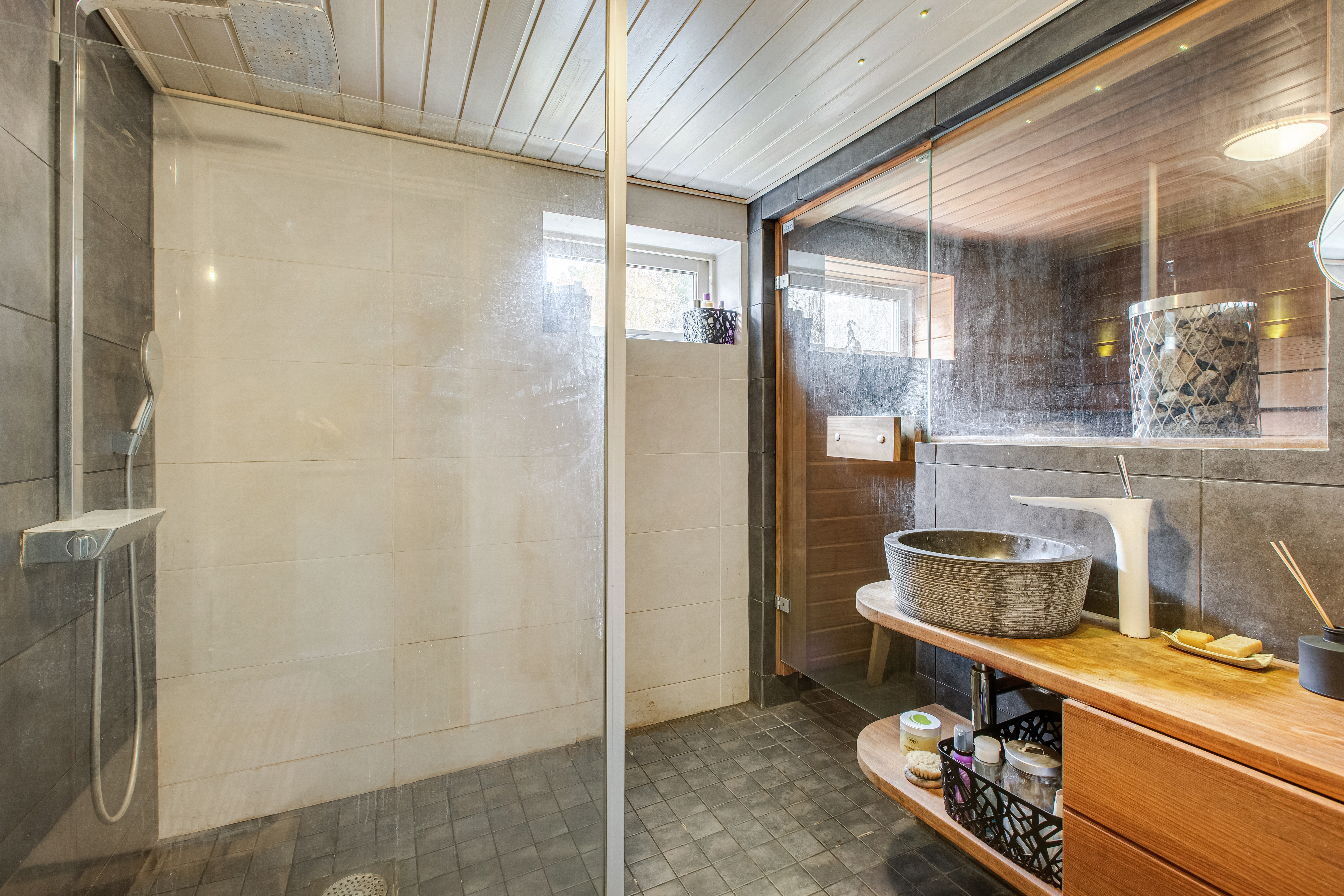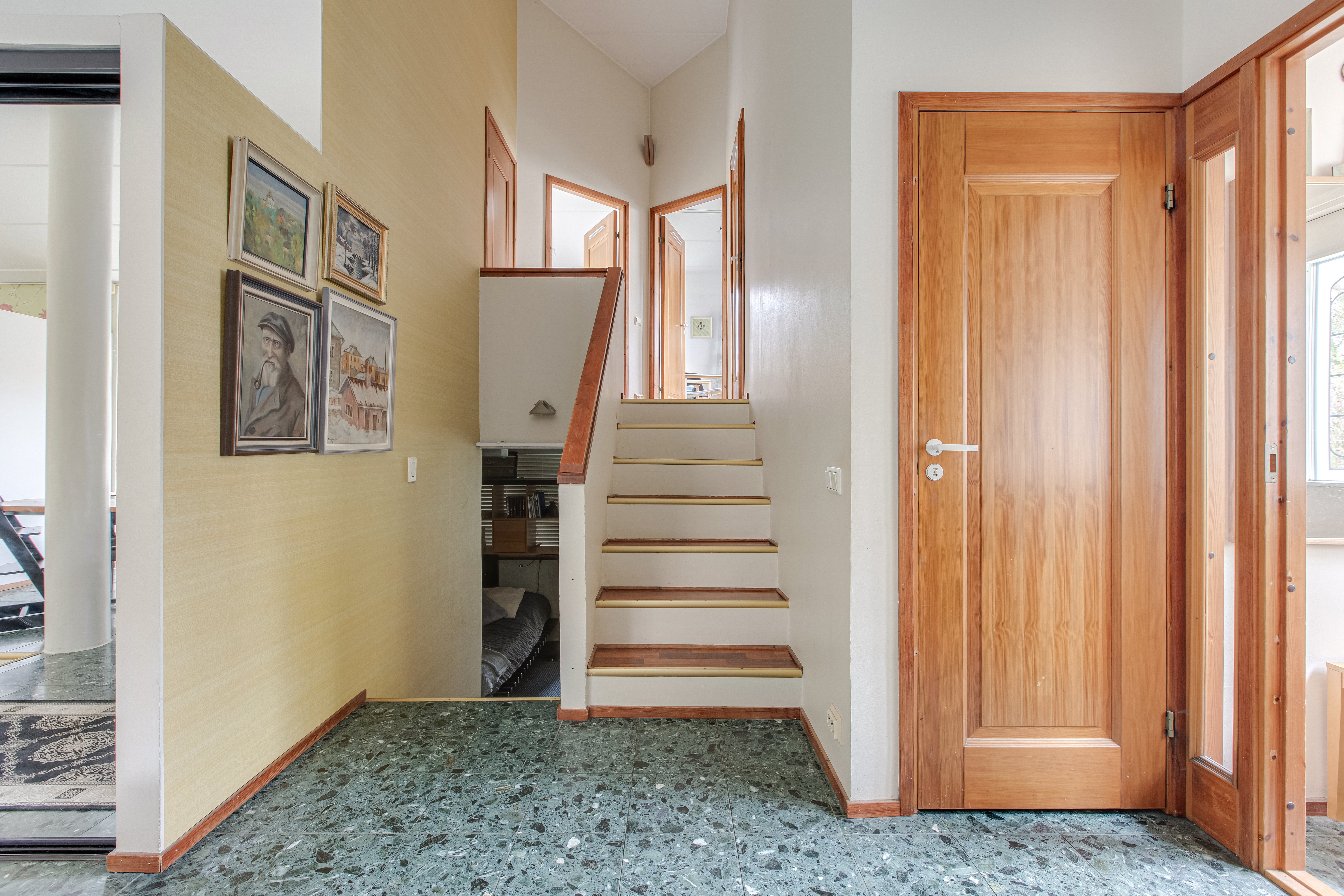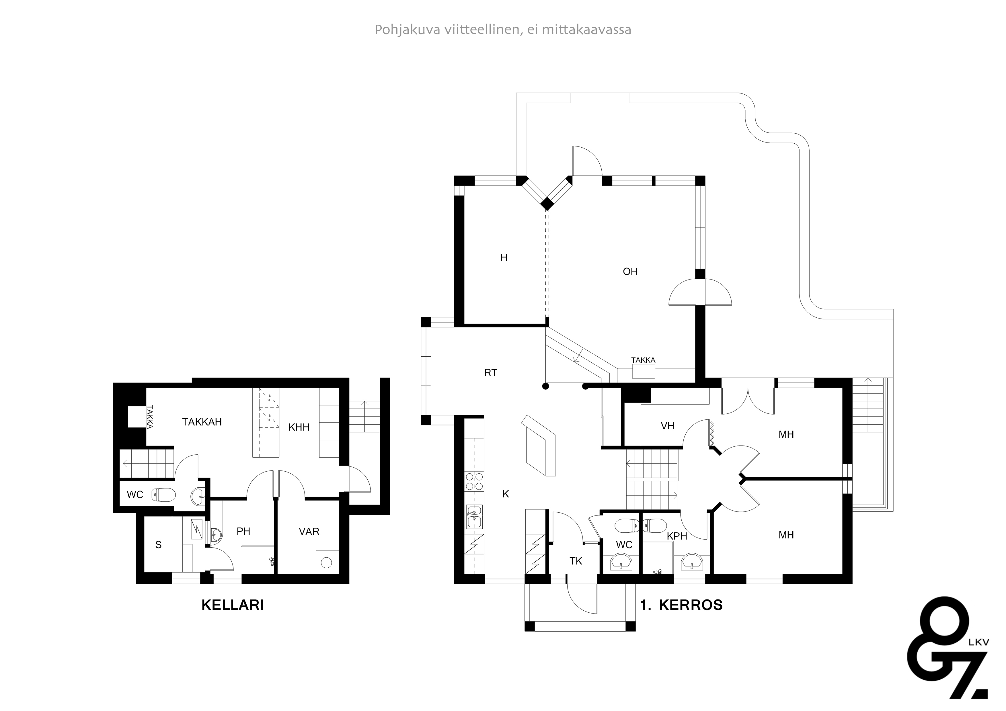 Alemmalla osittain kellaritasolla sijaitsee omalla sisäänkäynnillä takkahuone, kodinhoitohuone, pesuhuone, sauna erillinen wc sekä varasto. Huoneiston kivilattioissa lattialämmitys.