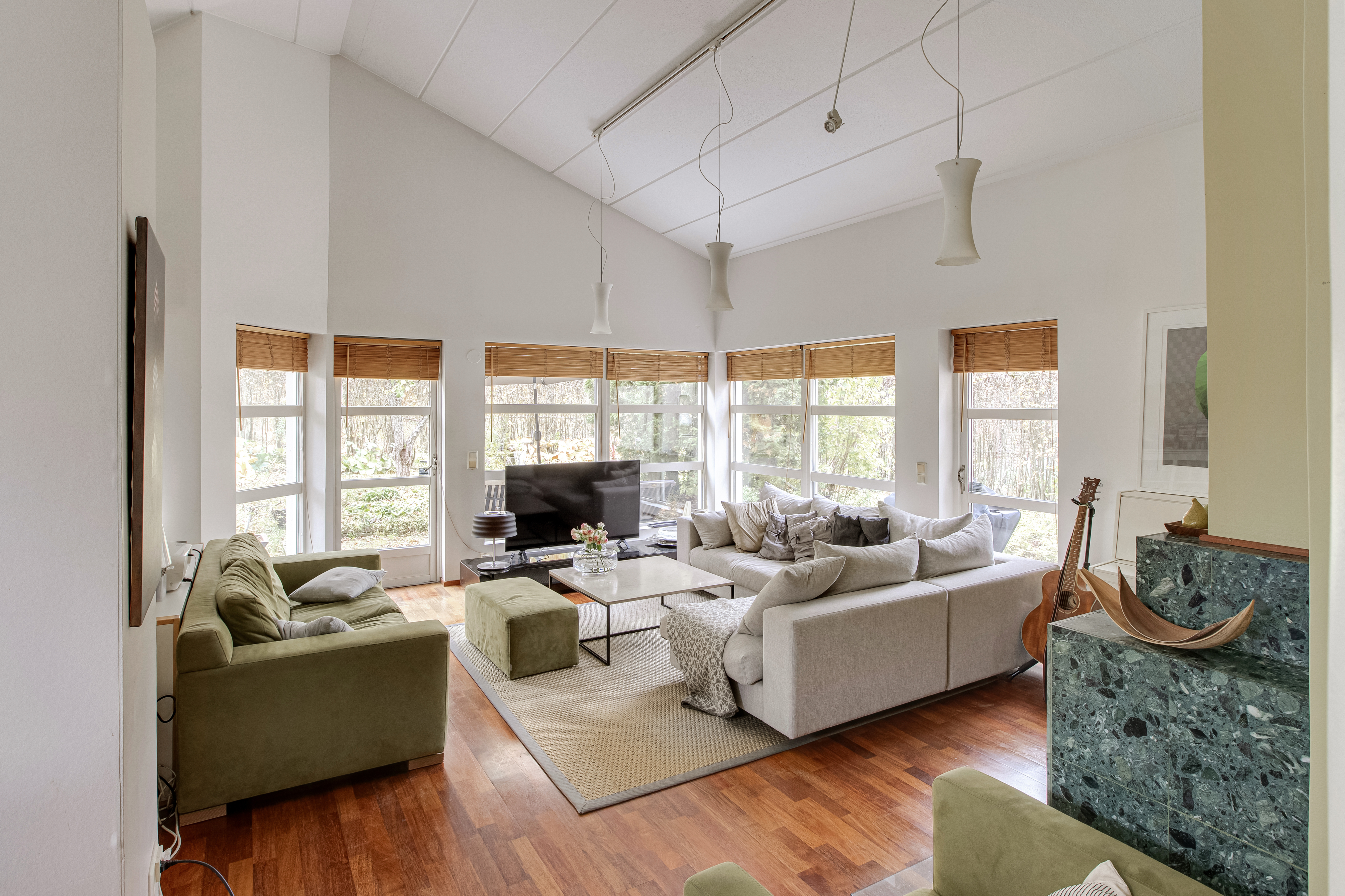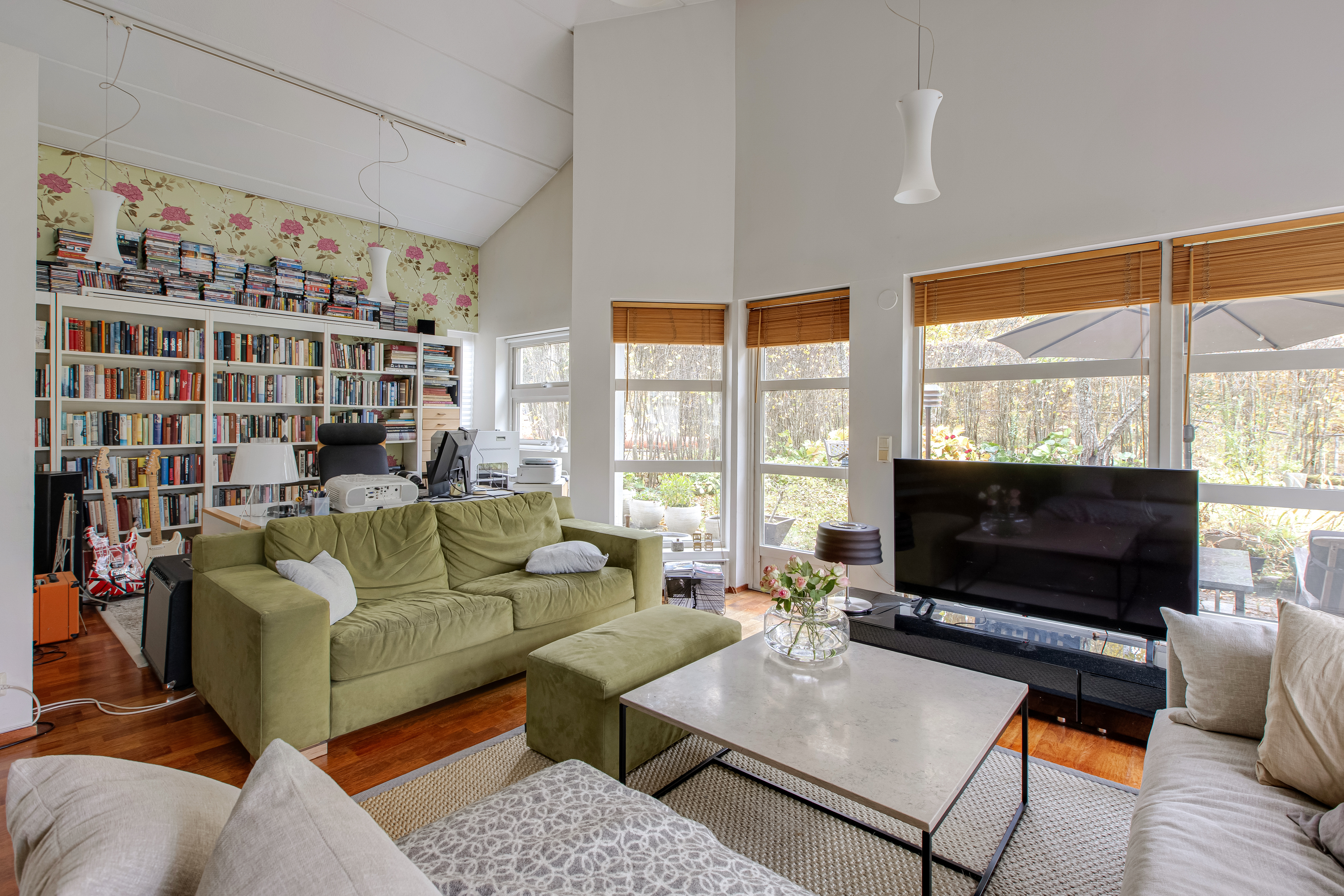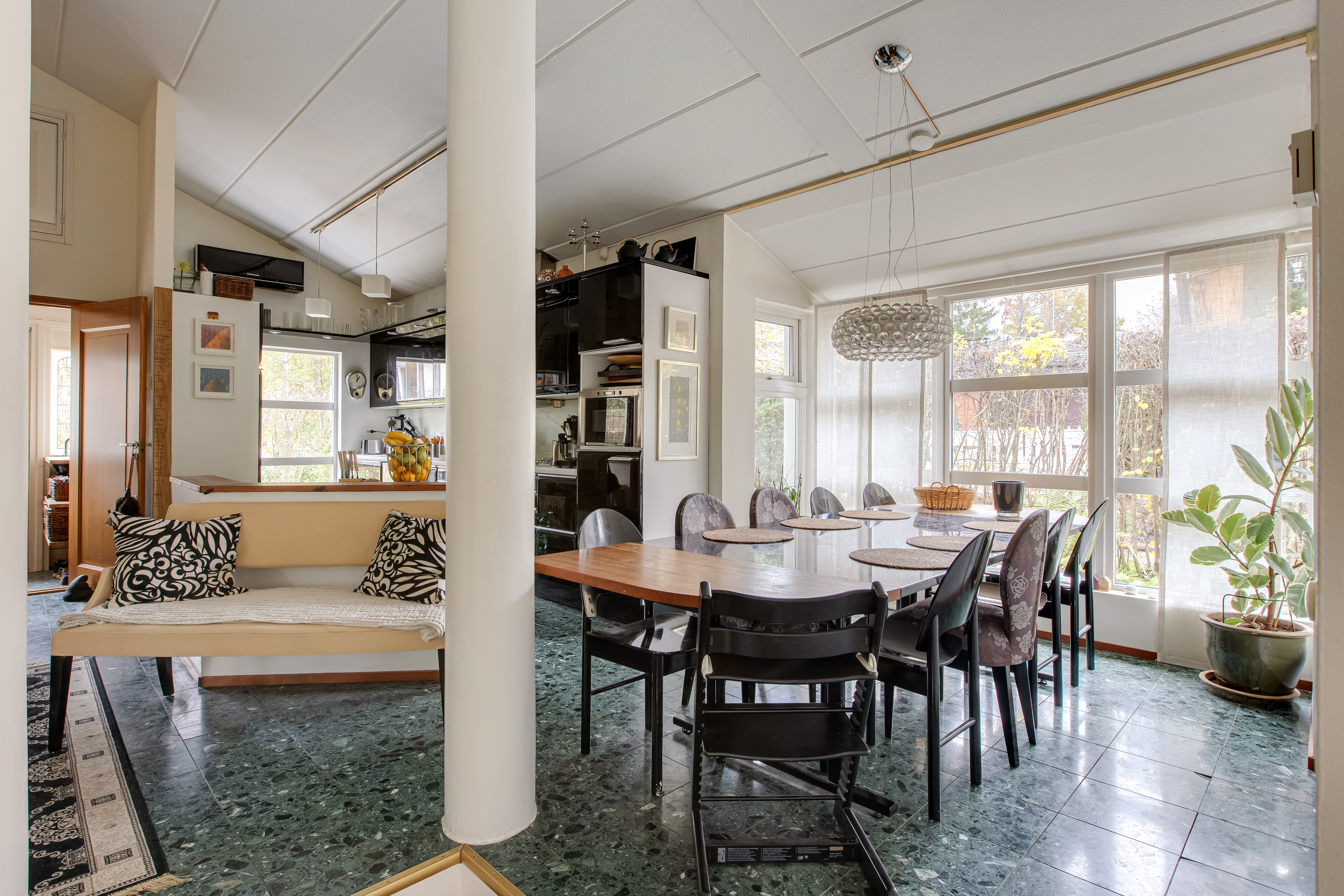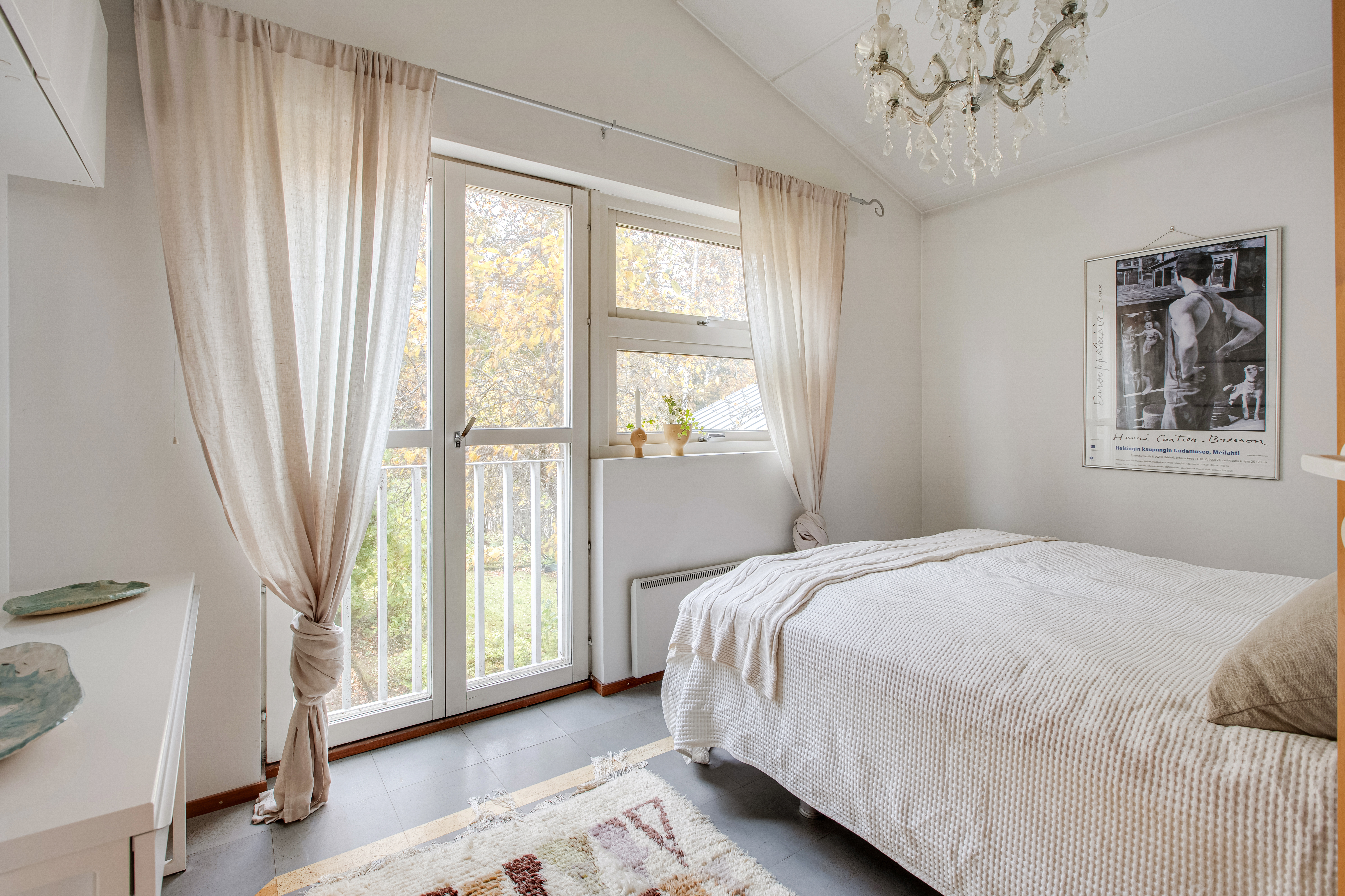 Valoisuutta ja viihtyisyyttä huoneisiin tuo korkeat huoneet ja ja laajat ikkunapinnat.