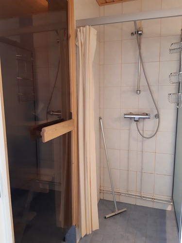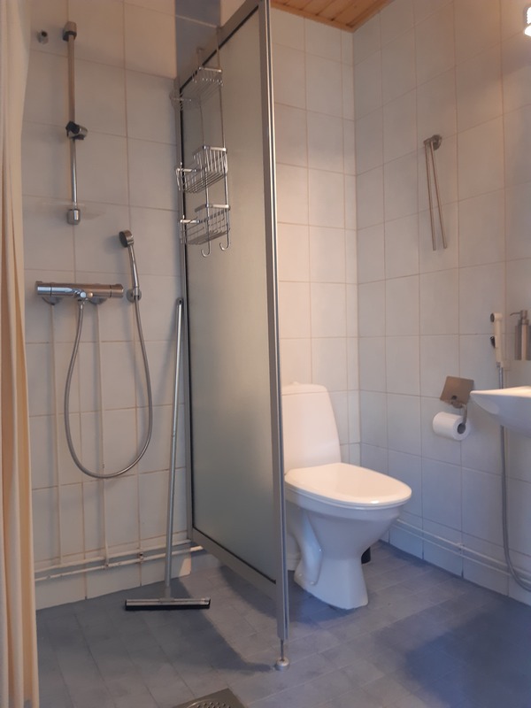 Varusteet: suihkuseinä, wc-istuin, suihku, peilikaappi