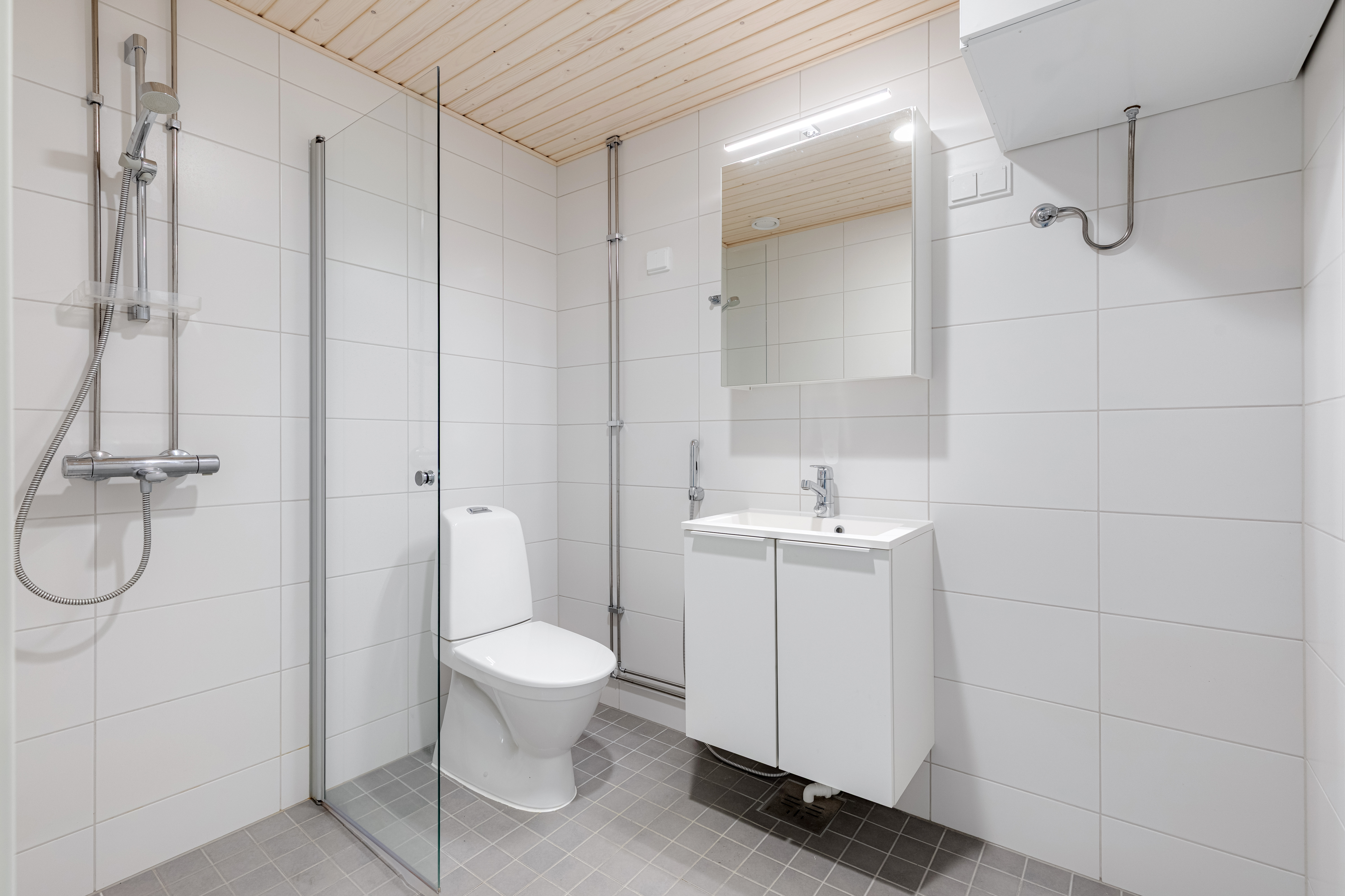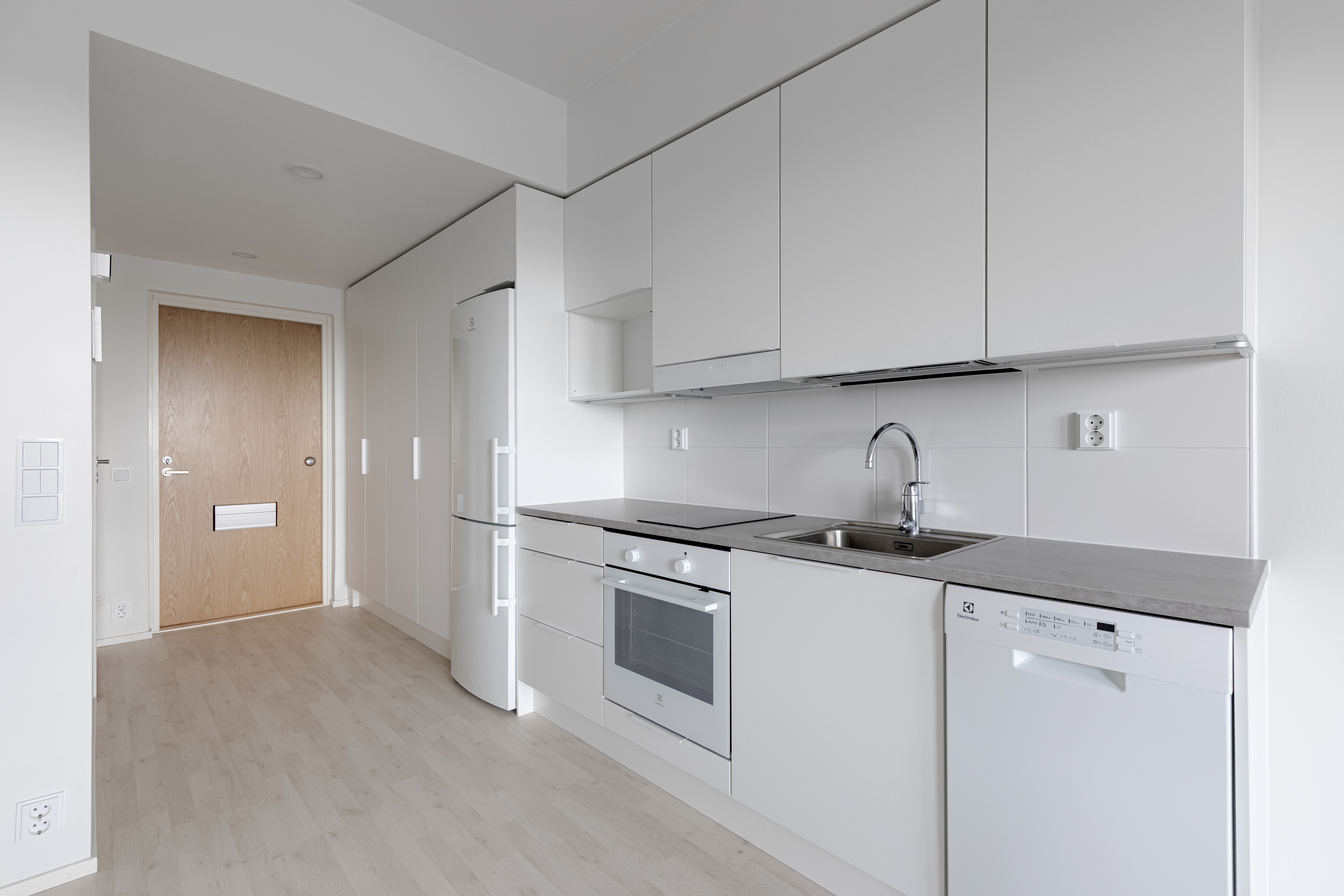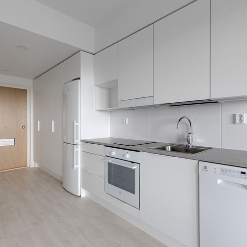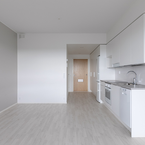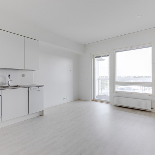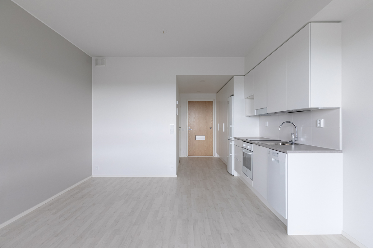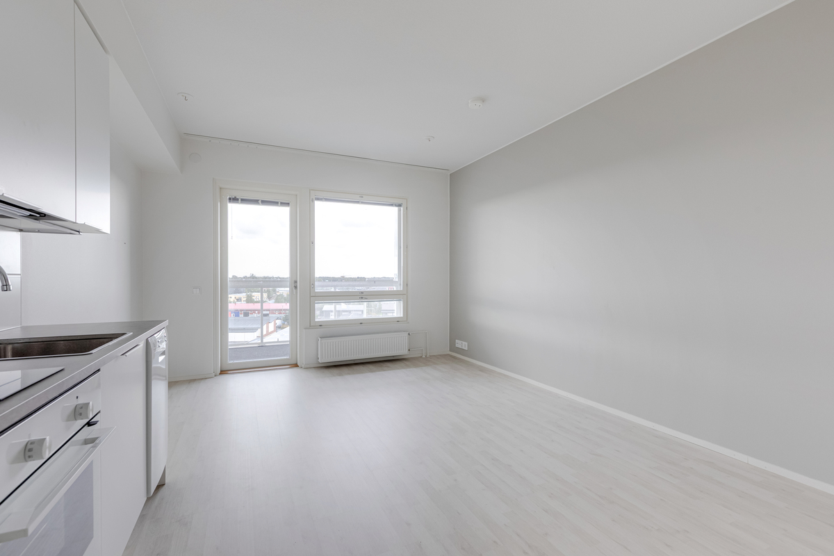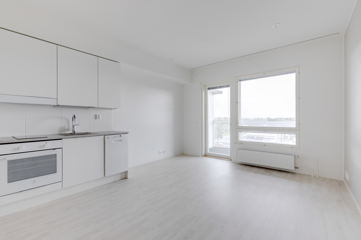 Asunnon sisätiloissa on valittu vaaleat ja neutraalit pinnat, jotka tekevät tilasta avaran ja helposti muunneltavan erilaisten sisustustyylien mukaan. Yksinkertaiset materiaalit ja selkeä värimaailma tuovat kotiin valoisuutta sekä ajattoman ilmeen, jonka ansiosta asunto on helppo pitää siistinä ja viihtyisänä.