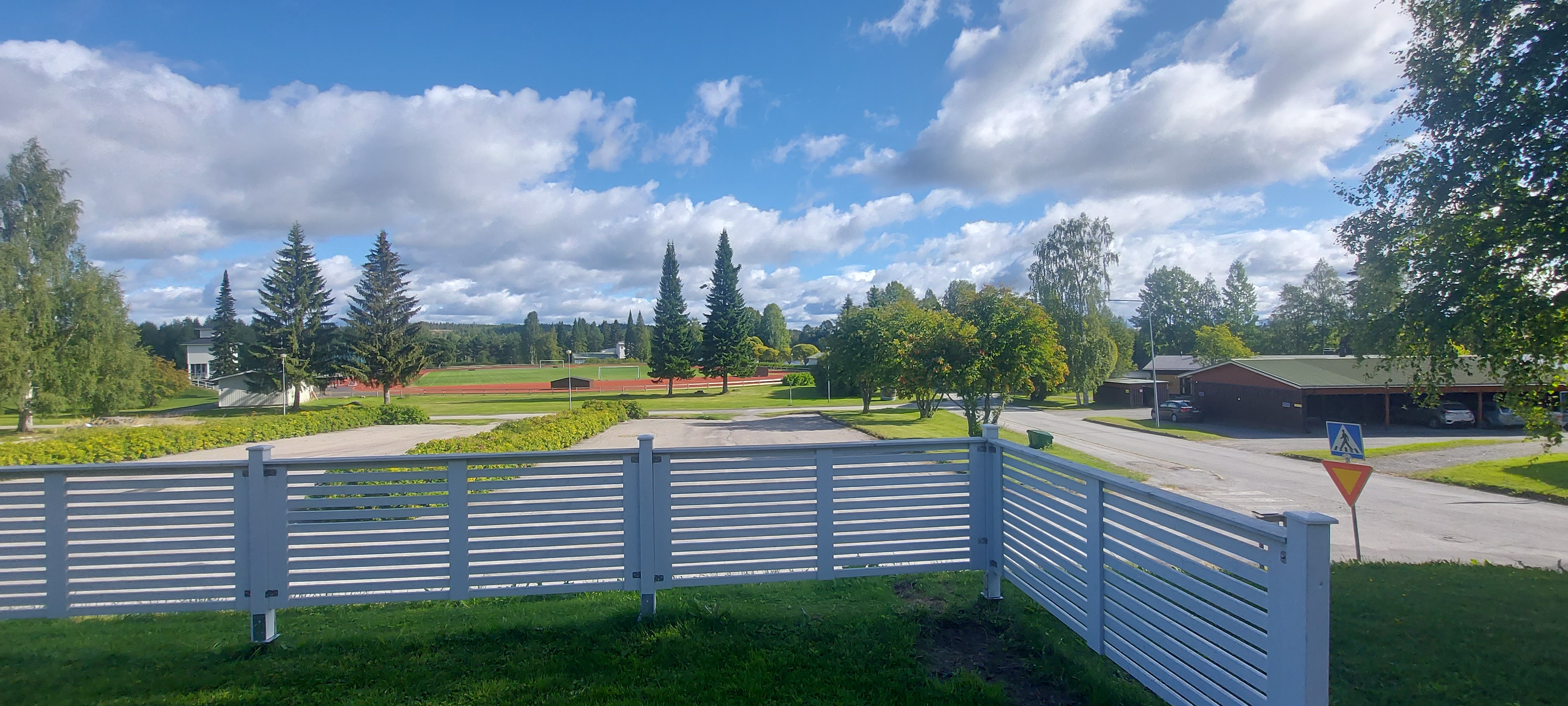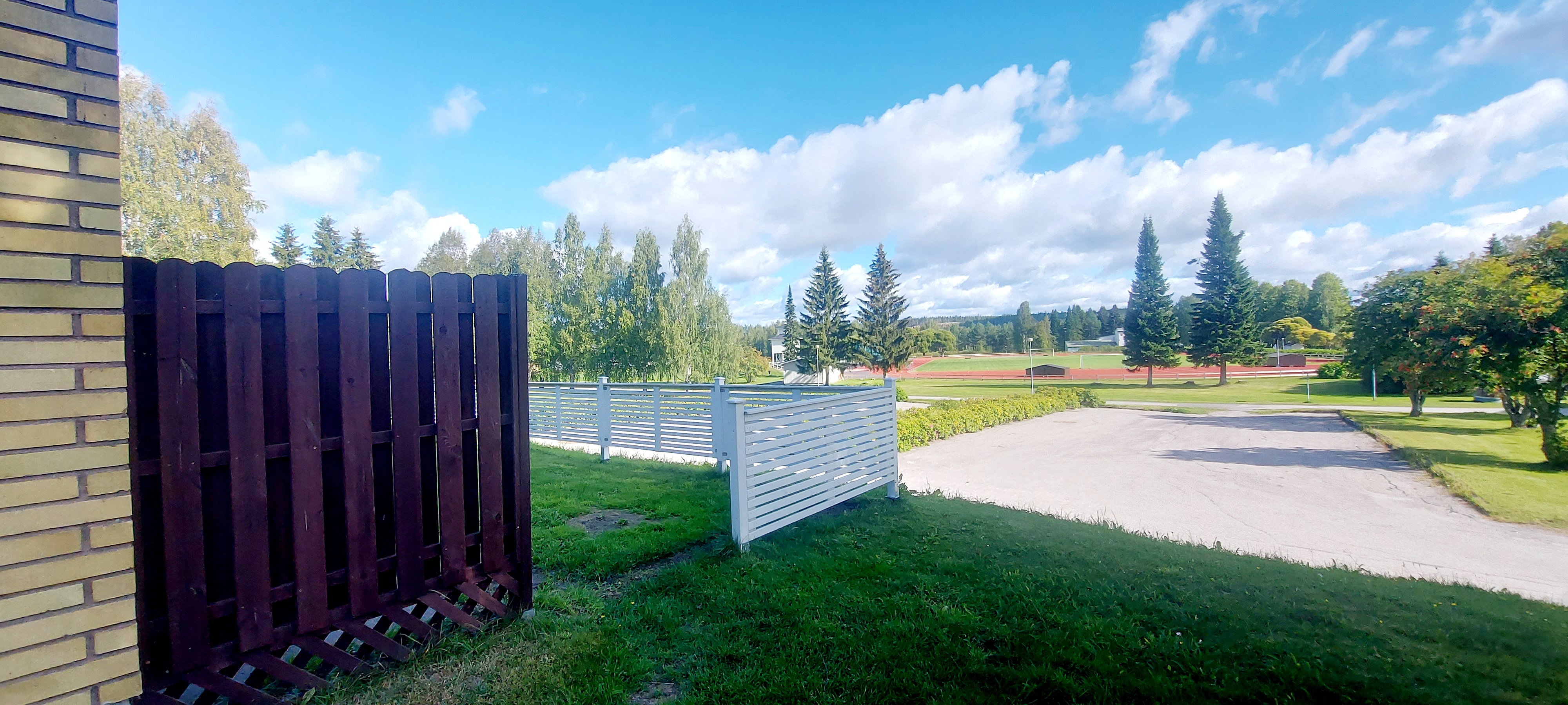 Hyvät näkymät puisto- ja urheilukenttä alueelle. Käynti sisäpihalle, jossa laatoitusta sekä nurmialuetta.