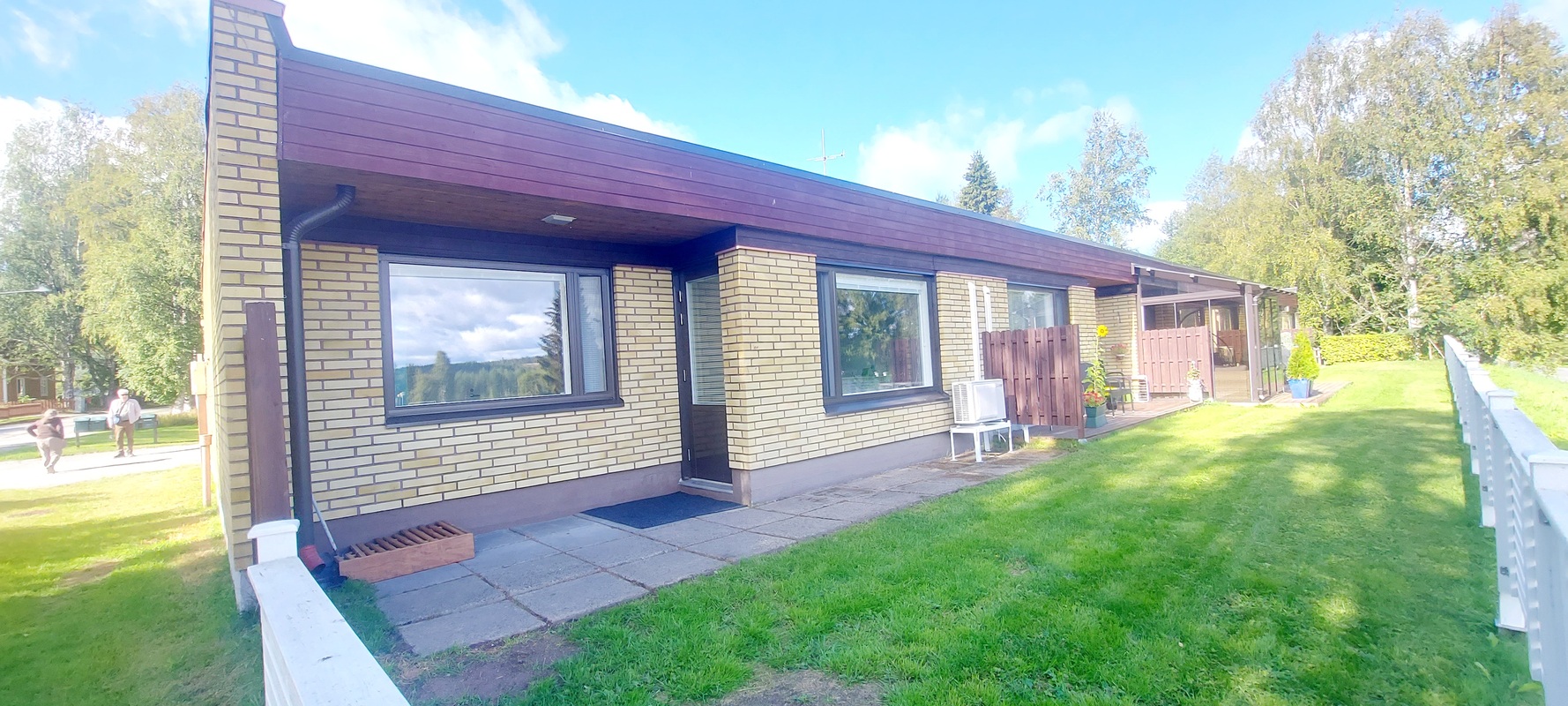 Terassi, laatoitettu alue ja nurmikko.
