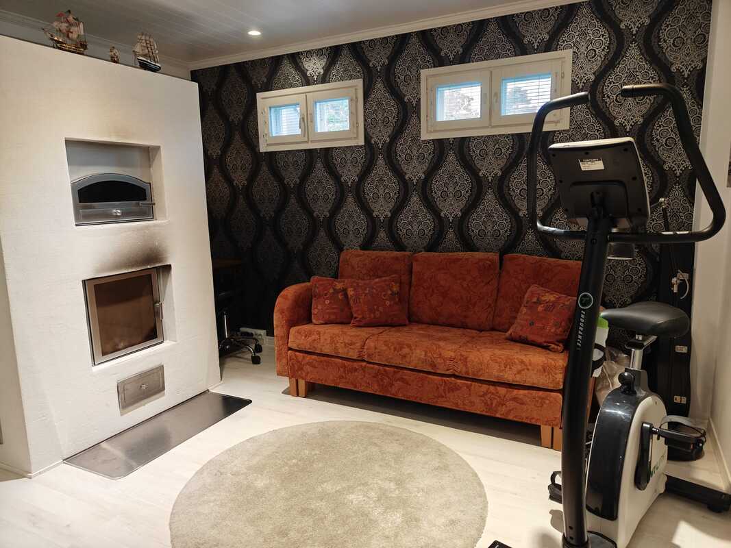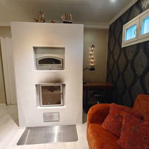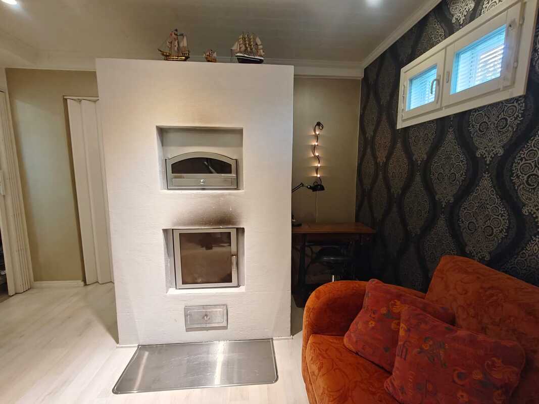 Takkahuoneessa muurattu leivinuuni-takka. Lattia laminaatti, seinä tapetti/maali.