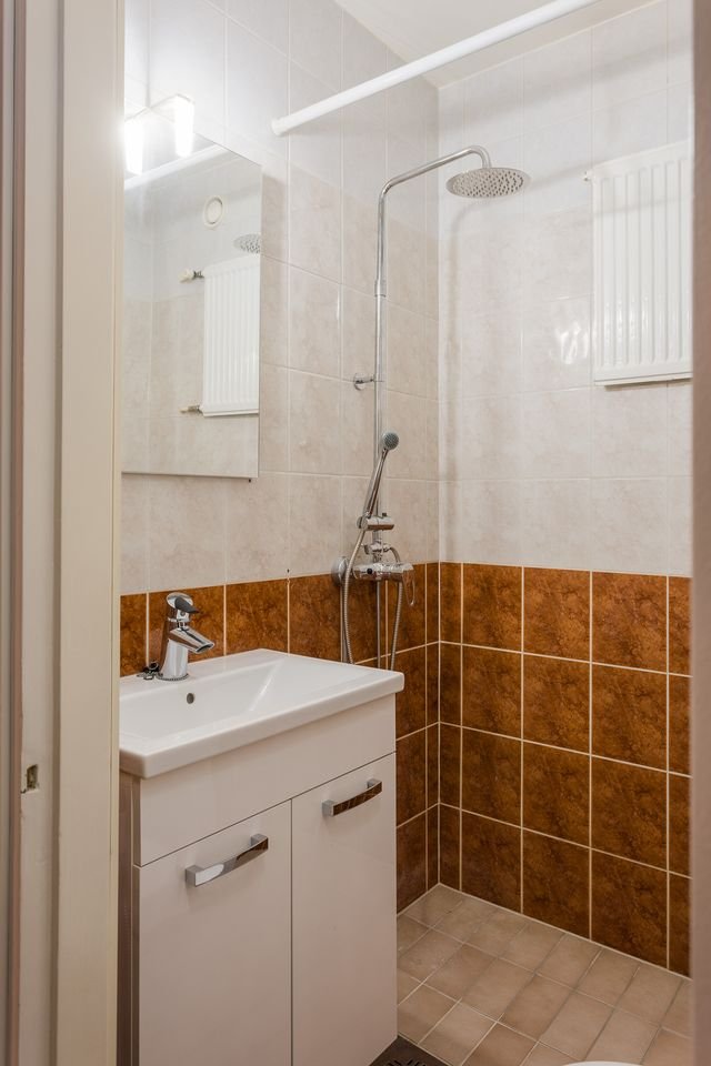 Varusteet: WC-istuin, suihku, pesukoneliitäntä, peili, pesuallas, allaskaappi, bidee-suihku ja suihkuverho