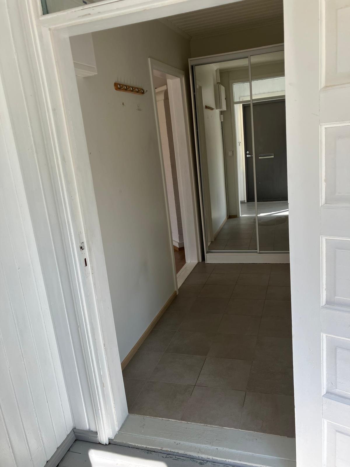 Eteisessä laattalattia ja lattialämmitys, liukuovikaappi.