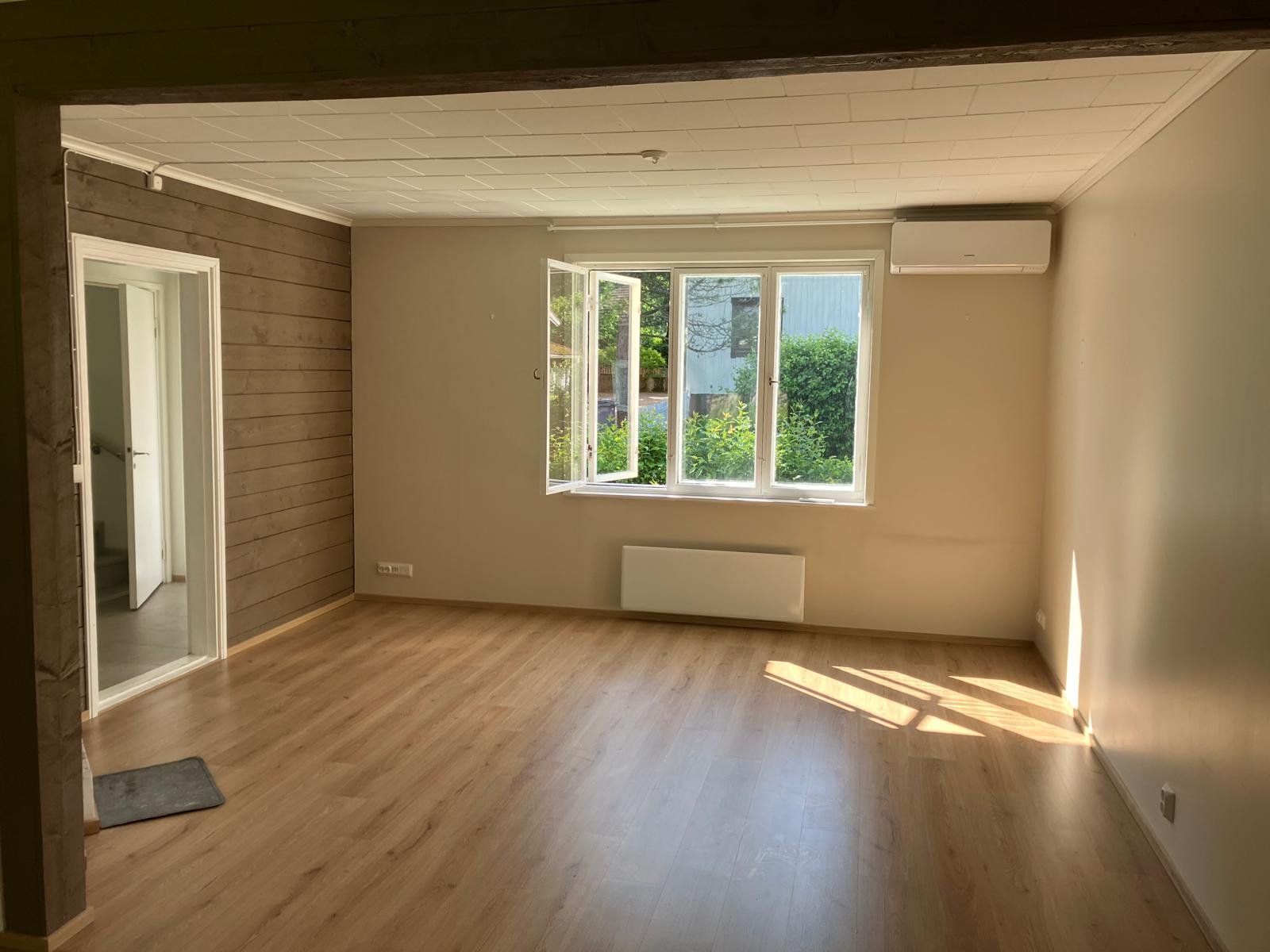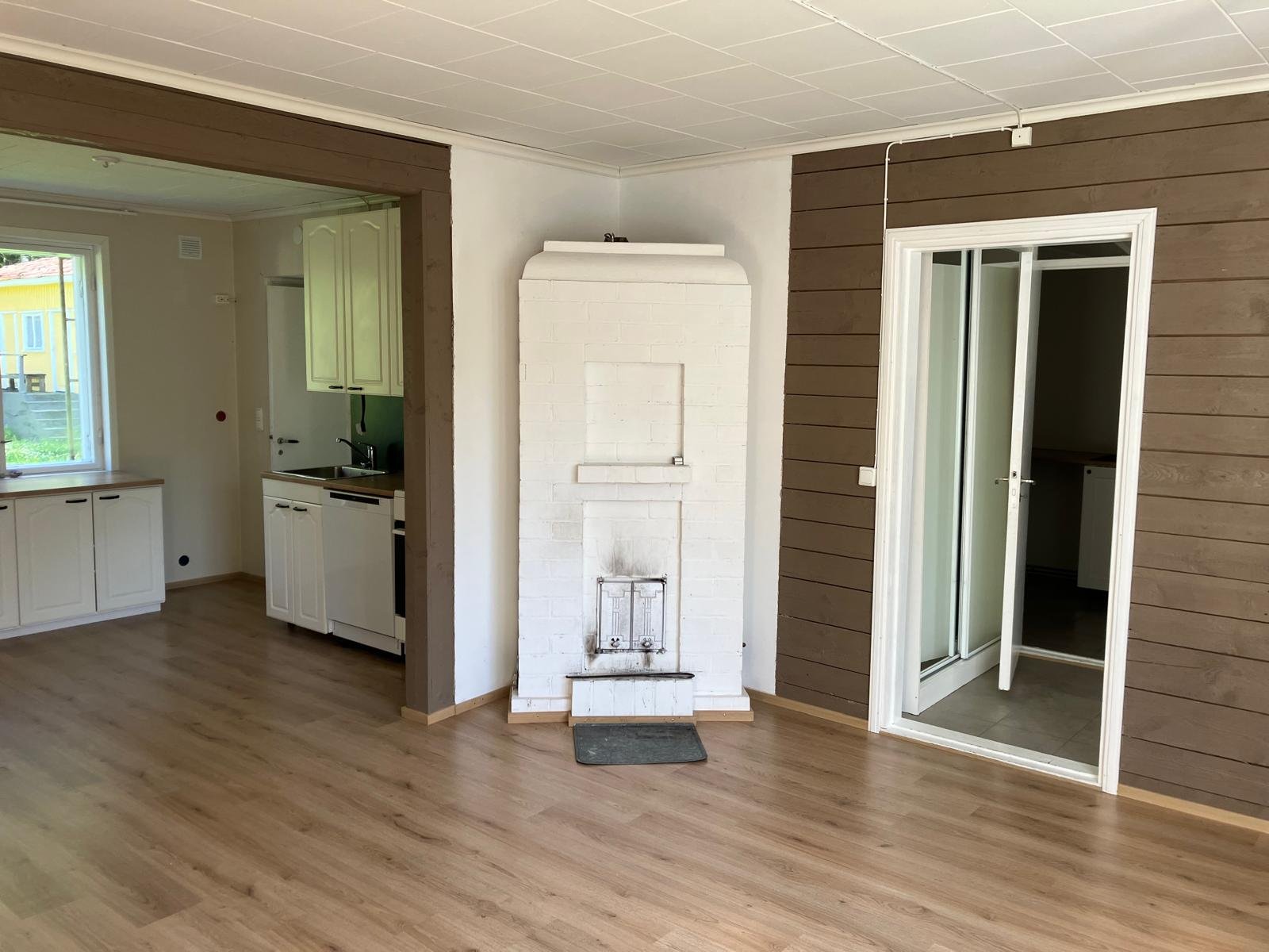 Varaava takka, ilmalämpöpumppu, laminaattilattia, maalatut seinät ja yksin puinen hirsiseinää muistuttava tehosteseinä.