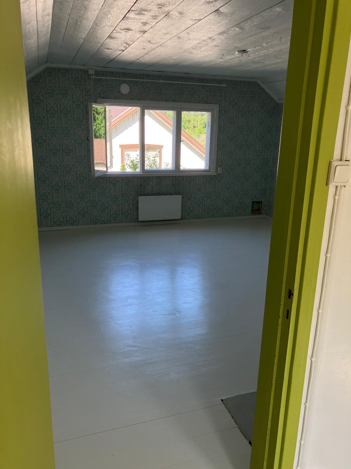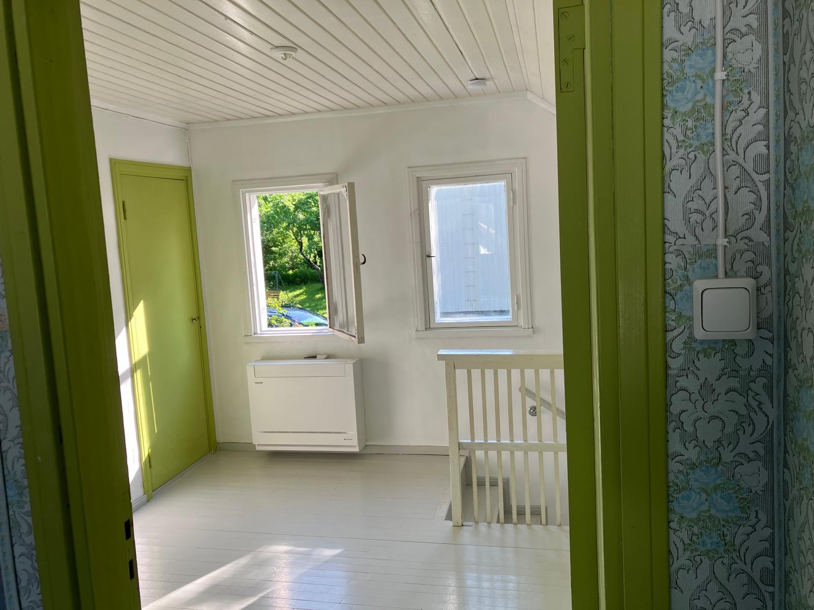 Yläkerran makuuhuoneessa lautalattiat ja tapetoidut seinät, komero, Porin matti. Yläkerran aulassa ilmalämpöpumppu ja tilaa esimerkiksi lukunurkkaukselle.